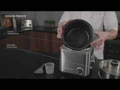 • Características Especiales Capacidad para 12 personas Cubeta de 1,4 L, Diseño de acero inoxidable cepillado con manijas cromadas, Cubeta antiadherente para la cocción de arroz y cereales, Cesta de acero inoxidable para cocinar al vapor simultáneamente pescado, carne, vegetales, Almacenamiento de cable retráctil, y Motor de engranaje
