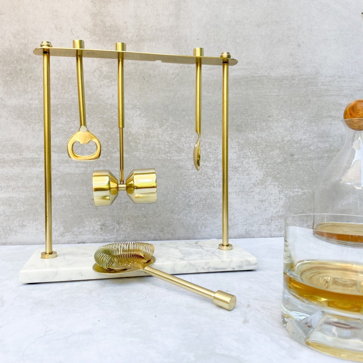 Elegante set herramientas de bar de líneas simples y funcional de diseño contemporáneo con base de mármol y piezas de acero con acabado dorado. Nuestro juego de accesorios de bar es el regalo perfecto para el mixólogo hogareño y para lucirse con las mejores combinaciones de tragos. Incluye Jigger, destapador, colador y cuchara de bar. Dimensiones: Base mármol: 25 x 10 x 27 cm. de alto, Jigger: 20 x 9 x 4 cm. (1x1 1/4 oz.), Colador: 20 x 9 cm, Destapador: 16 cm, Cuchara de bar: 23,5 cm. Producto importado directamente de India, elaborado por empresas de manufactura artesanal.