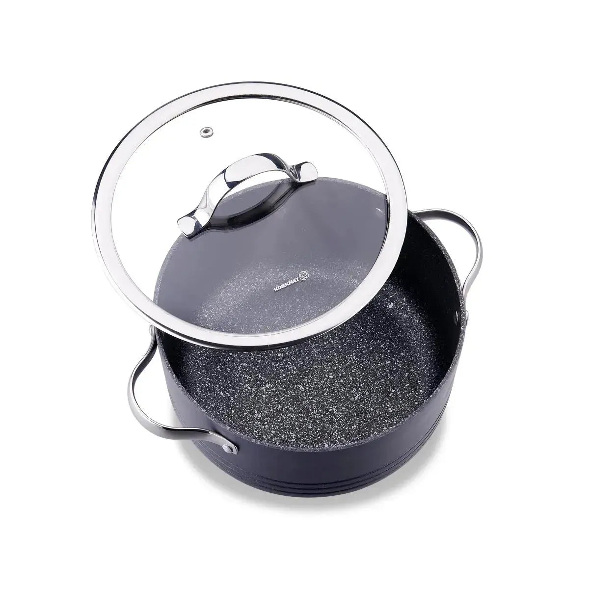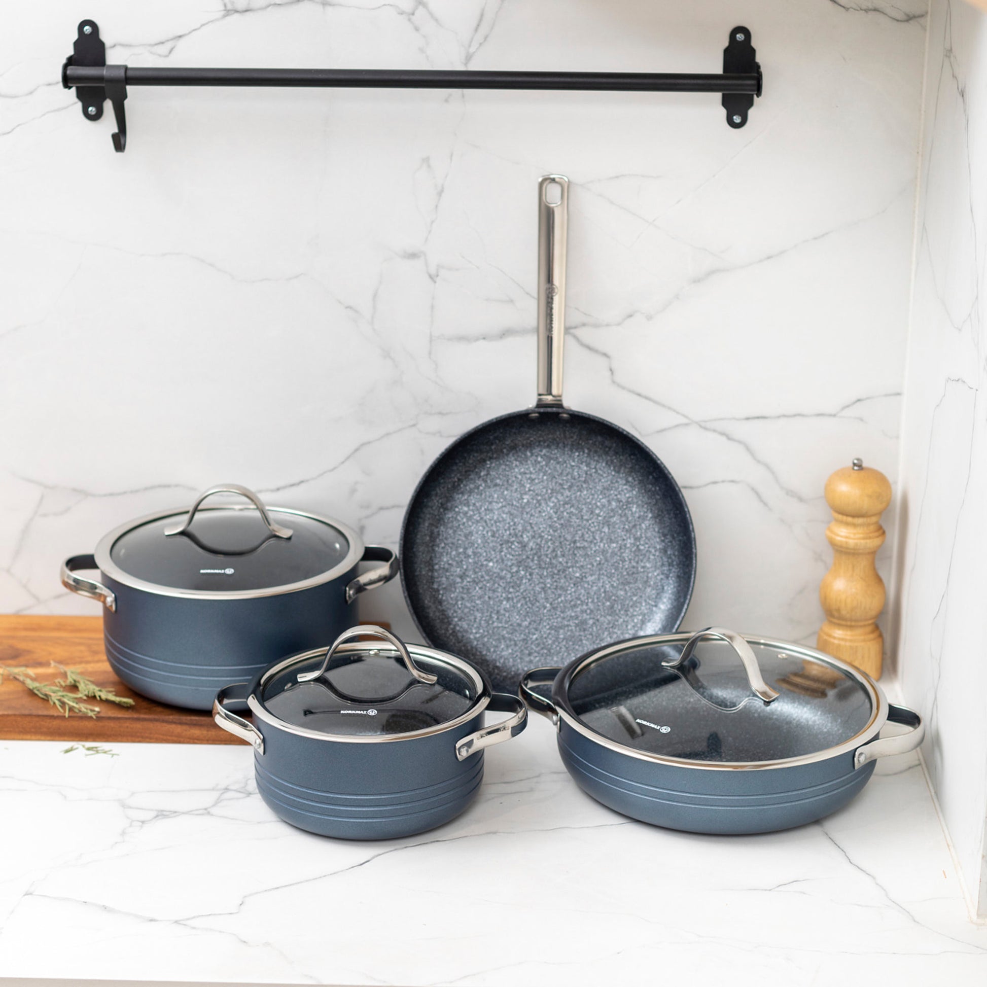 La Batería Azura 7 Pzs Korkmaz en color azul marino combina estilo, resistencia y funcionalidad para tu cocina. Incluye olla mediana 18 x 9 cm – 2 L, olla honda 22 x 11 cm – 3,8 L, olla baja 26 x 7,5 cm – 3,5 L y sartén 26 x 4,5 cm – 2 L, piezas versátiles que se adaptan a distintas preparaciones. Su recubrimiento de PTFE de aspecto volcánico ofrece excelentes propiedades antiadherentes, alta resistencia a los arañazos y gran durabilidad. Libre de plomo, cadmio y PFOA, asegura comidas más seguras y saludables. Con su alta conductividad térmica, logra un rendimiento eficiente incluso a fuego lento. Apta para lavavajillas, es un set práctico y duradero que une diseño y funcionalidad en tu cocina