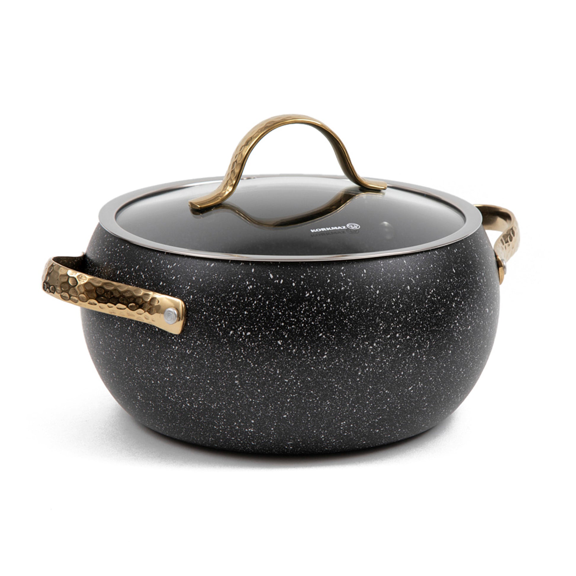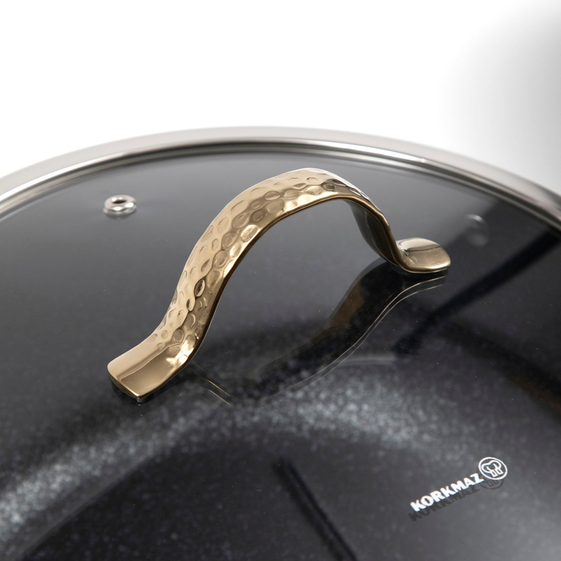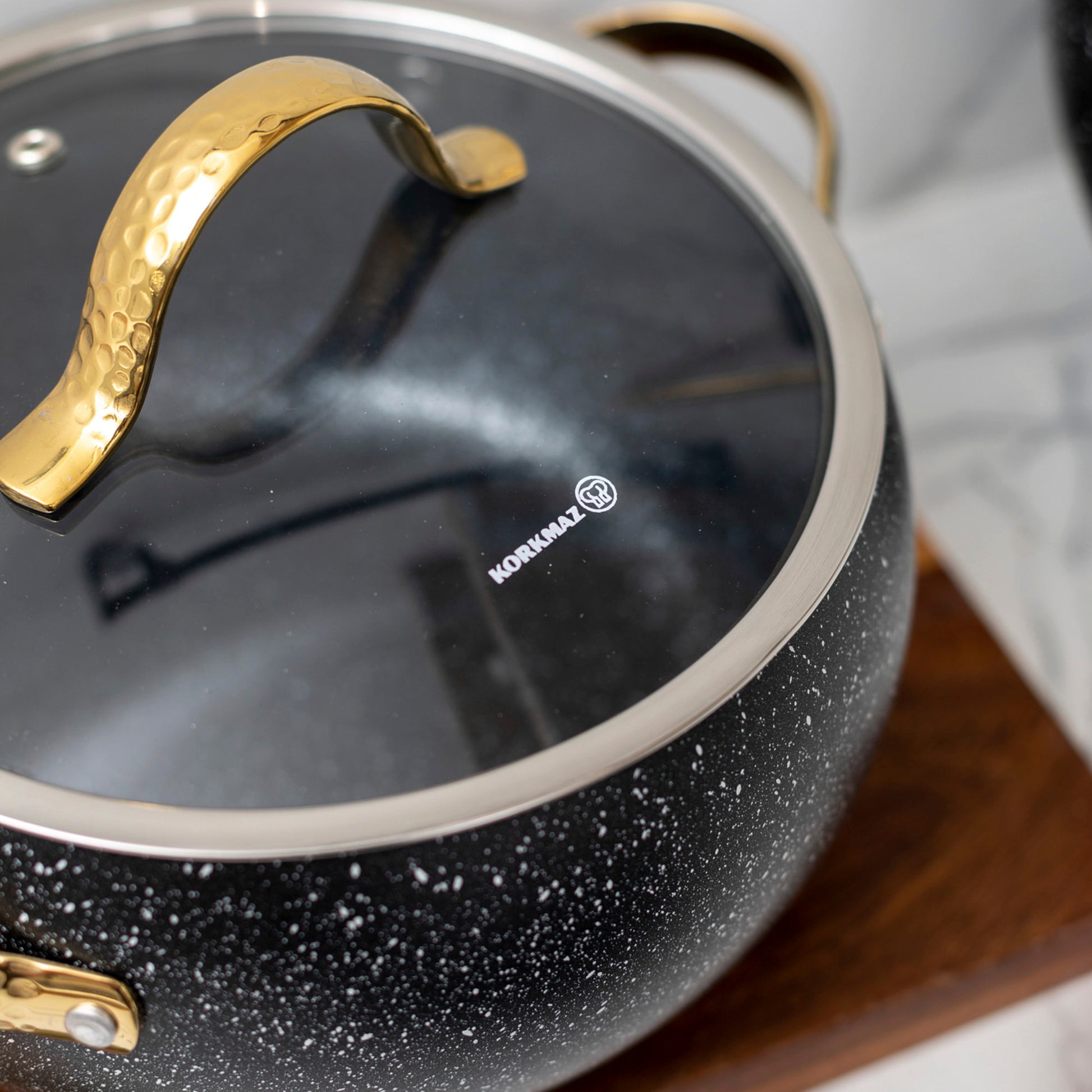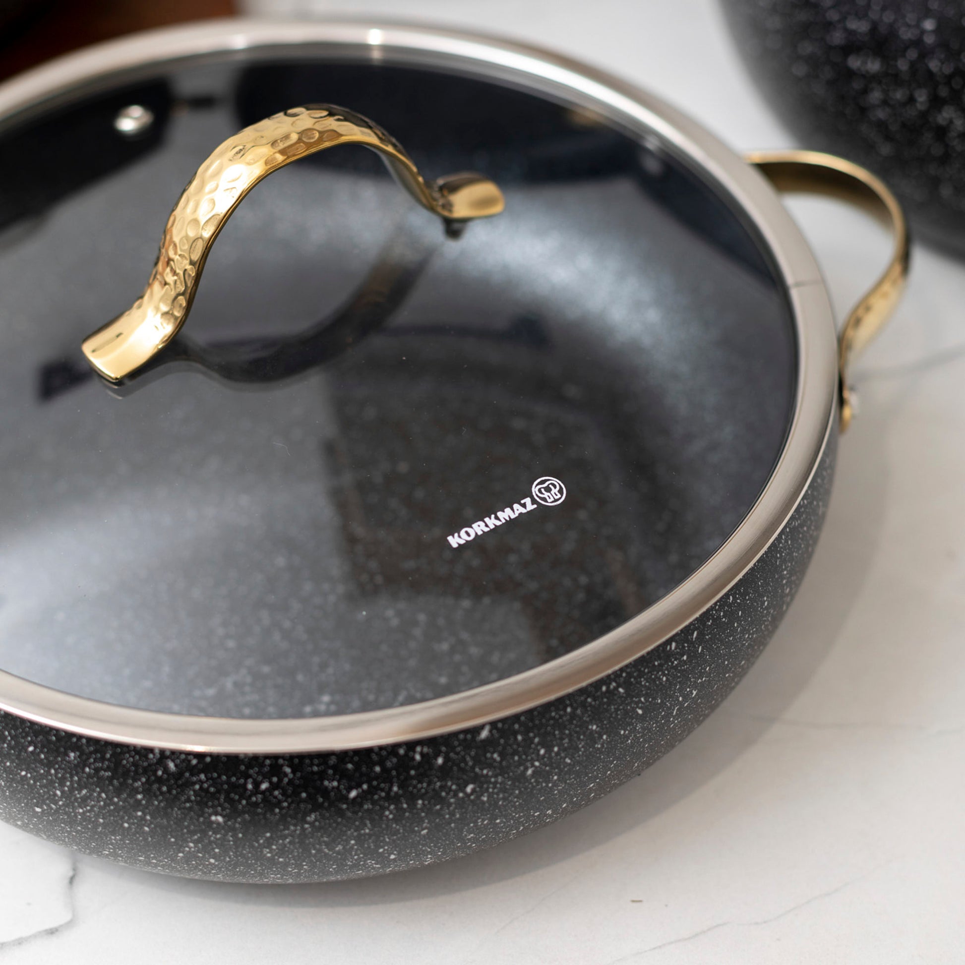La Batería Berilla 7 Pzs Korkmaz es sinónimo de resistencia, diseño y practicidad para tu cocina. Incluye olla mediana 20 x 11 cm – 3,5 L, olla honda 24 x 12,4 cm – 5,7 L, olla baja 26 x 7,5 cm – 3,5 L y sartén 26 x 4,5 cm – 2 L, piezas versátiles que se adaptan a distintas preparaciones. Su recubrimiento de PTFE de aspecto volcánico ofrece excelentes propiedades antiadherentes, alta resistencia a los arañazos y durabilidad prolongada. Libre de plomo, cadmio y PFOA, garantiza comidas más saludables y seguras. Con una alta conductividad térmica, permite cocinar de manera eficiente incluso a fuego lento. Apta para lavavajillas, es un set confiable y moderno que une diseño y funcionalidad en cada preparación