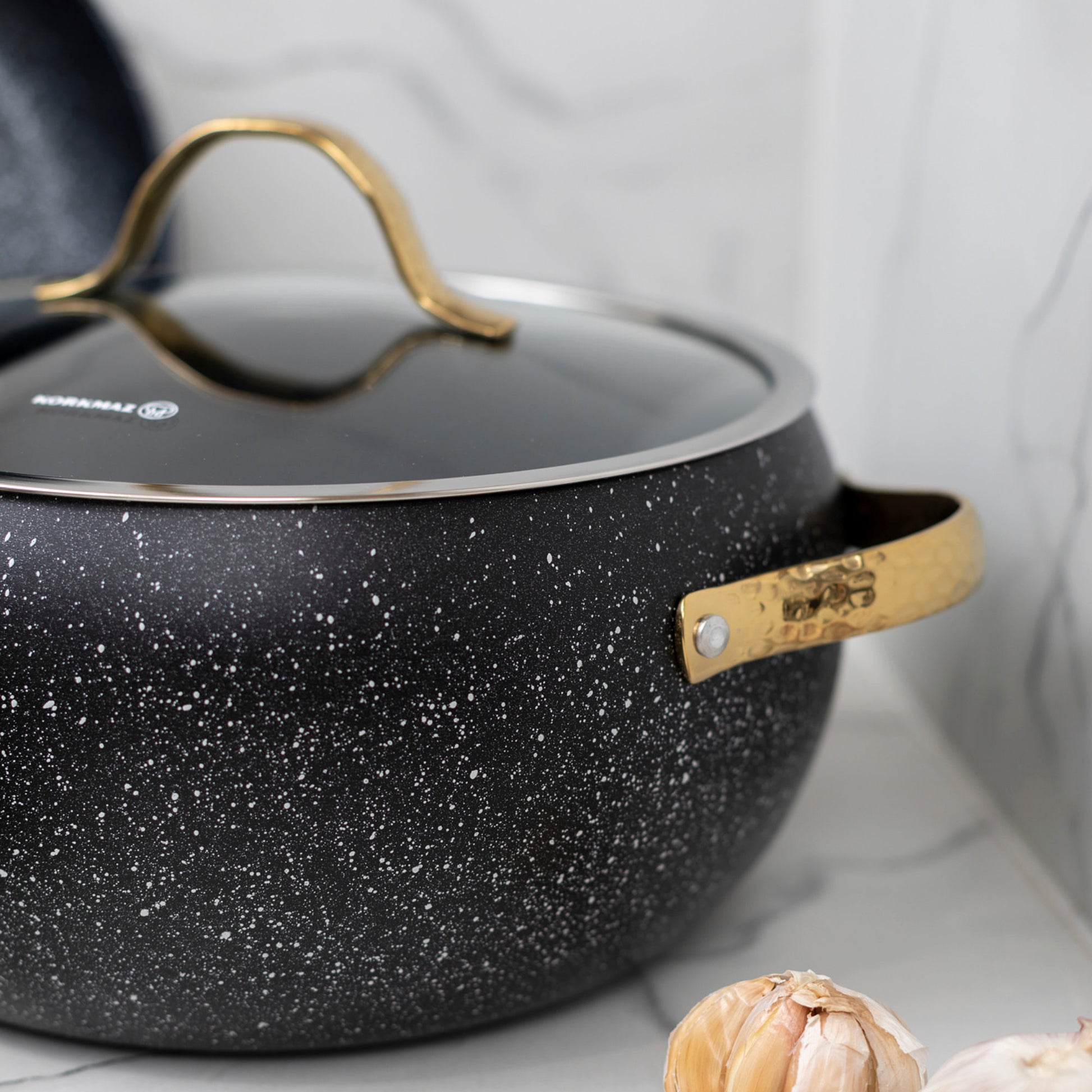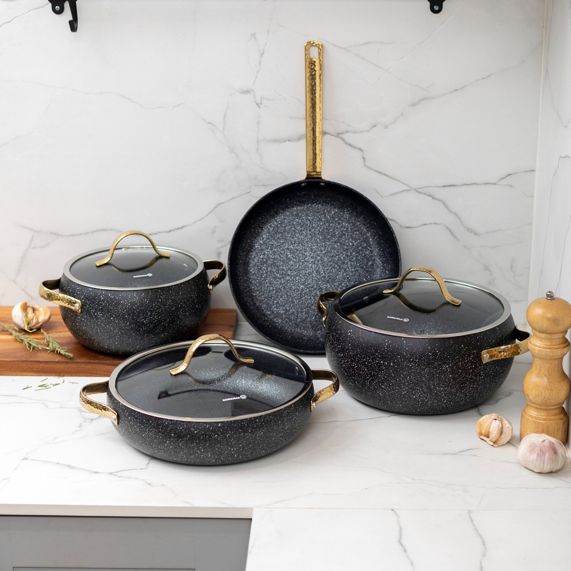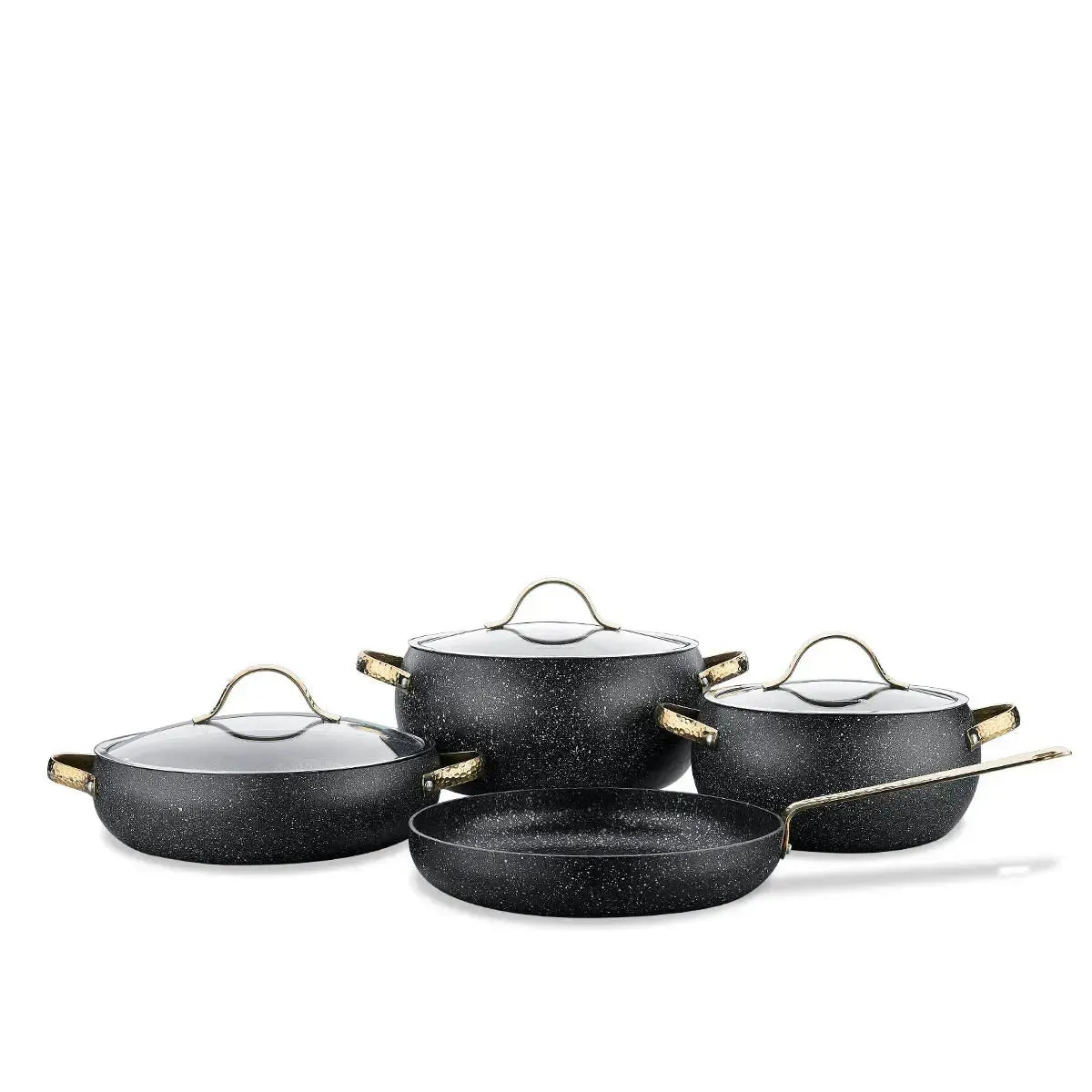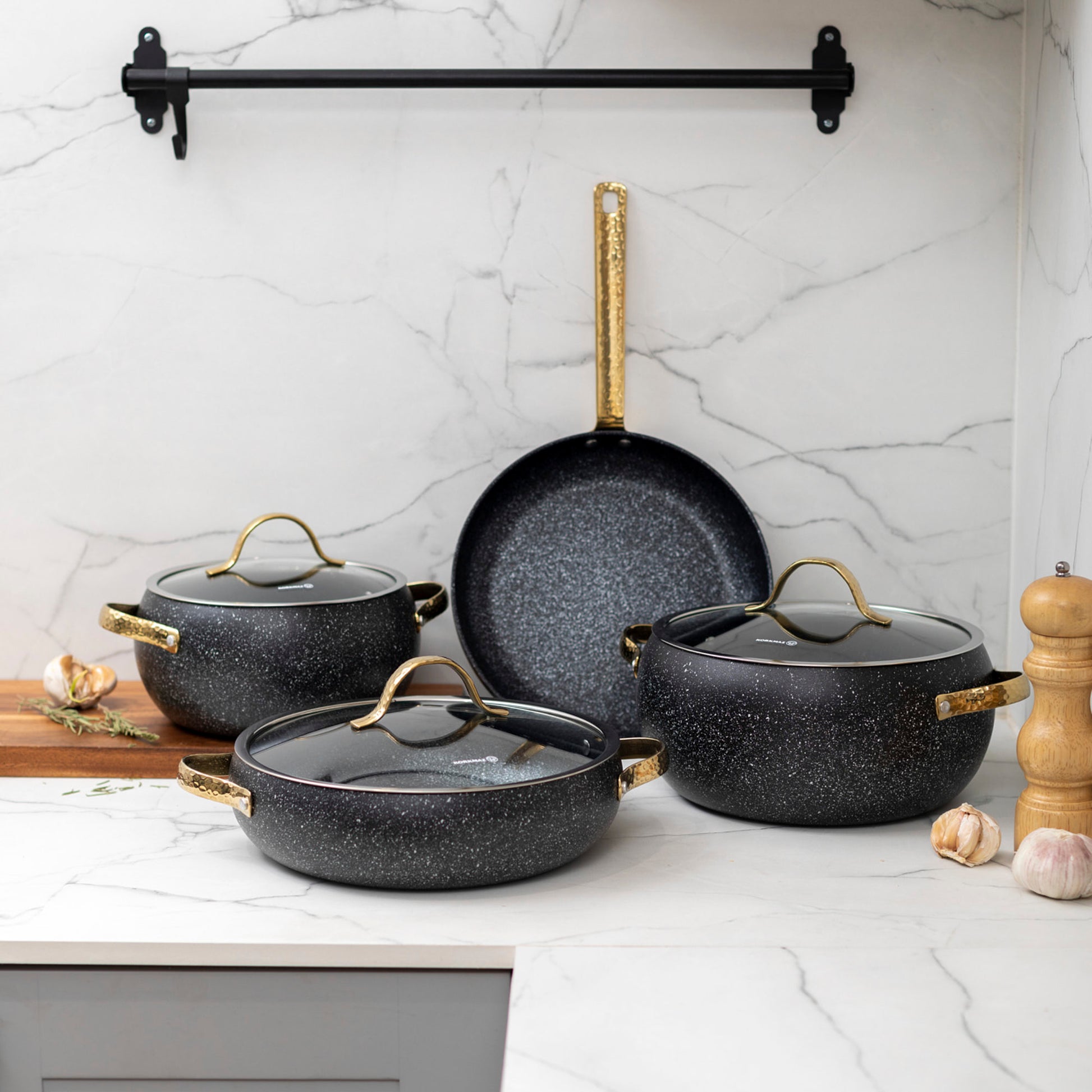 La Batería Berilla 7 Pzs Korkmaz es sinónimo de resistencia, diseño y practicidad para tu cocina. Incluye olla mediana 20 x 11 cm – 3,5 L, olla honda 24 x 12,4 cm – 5,7 L, olla baja 26 x 7,5 cm – 3,5 L y sartén 26 x 4,5 cm – 2 L, piezas versátiles que se adaptan a distintas preparaciones. Su recubrimiento de PTFE de aspecto volcánico ofrece excelentes propiedades antiadherentes, alta resistencia a los arañazos y durabilidad prolongada. Libre de plomo, cadmio y PFOA, garantiza comidas más saludables y seguras. Con una alta conductividad térmica, permite cocinar de manera eficiente incluso a fuego lento. Apta para lavavajillas, es un set confiable y moderno que une diseño y funcionalidad en cada preparación