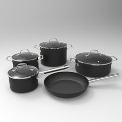 Un esencial en tu cocina, es sin dudas es una buena batería. Un clásico es nuestra Batería Biarritz de Simple Cook, que ahora encuentras con un renovado diseño, con potente tecnología antiadherente y cocción uniforme. Hecha de aluminio forjado, revestimiento interior y exterior en PFLUON. Cuenta con mangos y asas son de acero inoxidable, y tapas de vidrio templado con salida para el vapor. Su color negro mate hará juego con cualquier estilo que tengas en tu cocina. Cuenta con una olla mediana de 20*9 cm con tapa, una olla grande de 24*13cm con tapa y una olla baja de 28*8 cm con tapa. Además, cuenta con un cazo con tapa de 18*8cms de diámetro y un sartén de 28*5 cm. de diámetro.