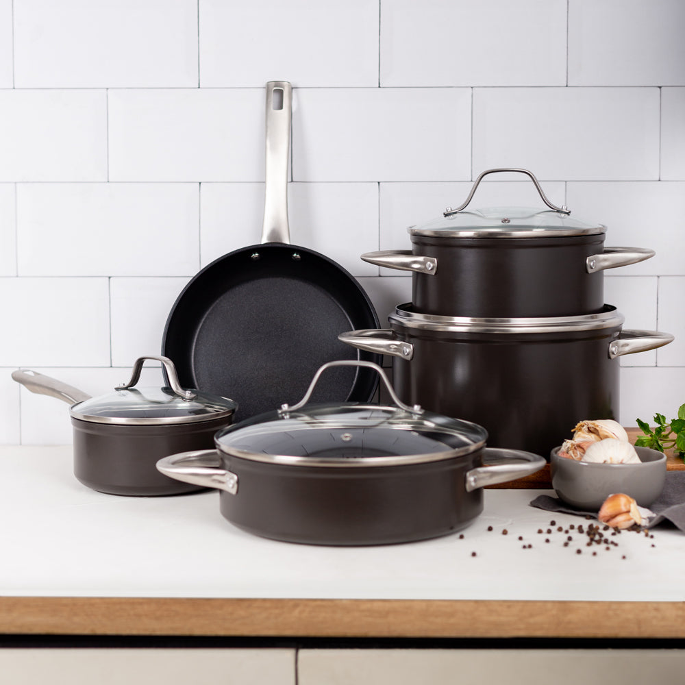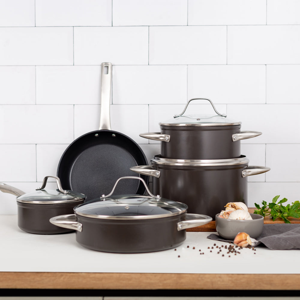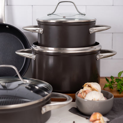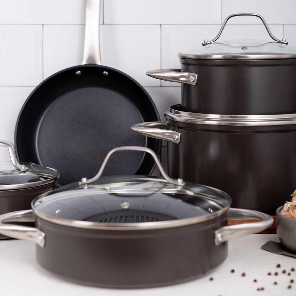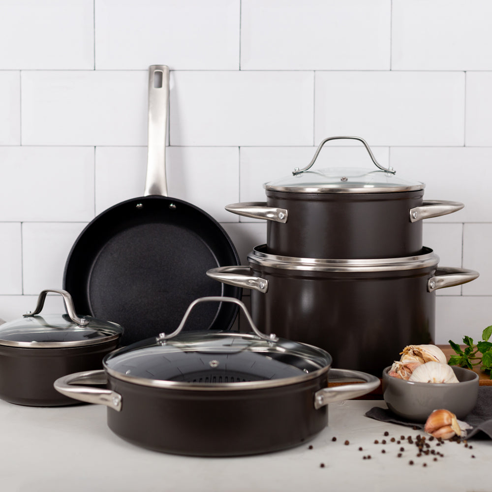 Prepara tus mejores recetas con la Batería Simple Cook Metz 9pzs. Con su elegante diseño negro mate, su potente tecnología antiadherente y cocción uniforme en sus piezas, esta batería se convertirá en tu mejor aliada. Incluye 1 olla grande con tapa de 24 x 13cm, 1 mediana de 20x10cm igualmente con tapa y una olla arrocera con tapa de 24x7cm; 1 cacerola de 16x7cm con tapa y 1 sartén de 24x4.5cm. Su estructura es de aluminio forjado y revestida interiormente, sus mangos y asas son de acero inoxidable, además de contar con tapas de vidrio templado con salida para el vapor.