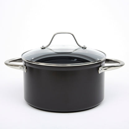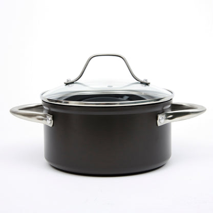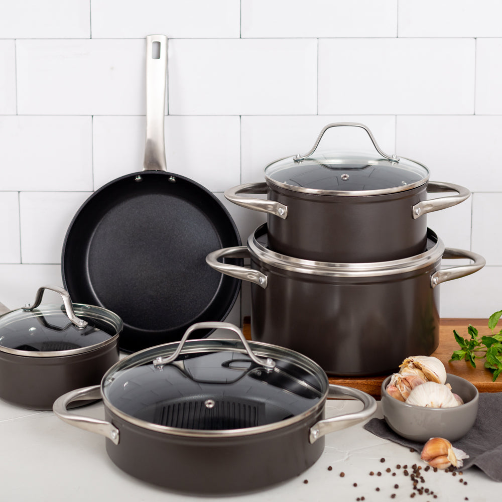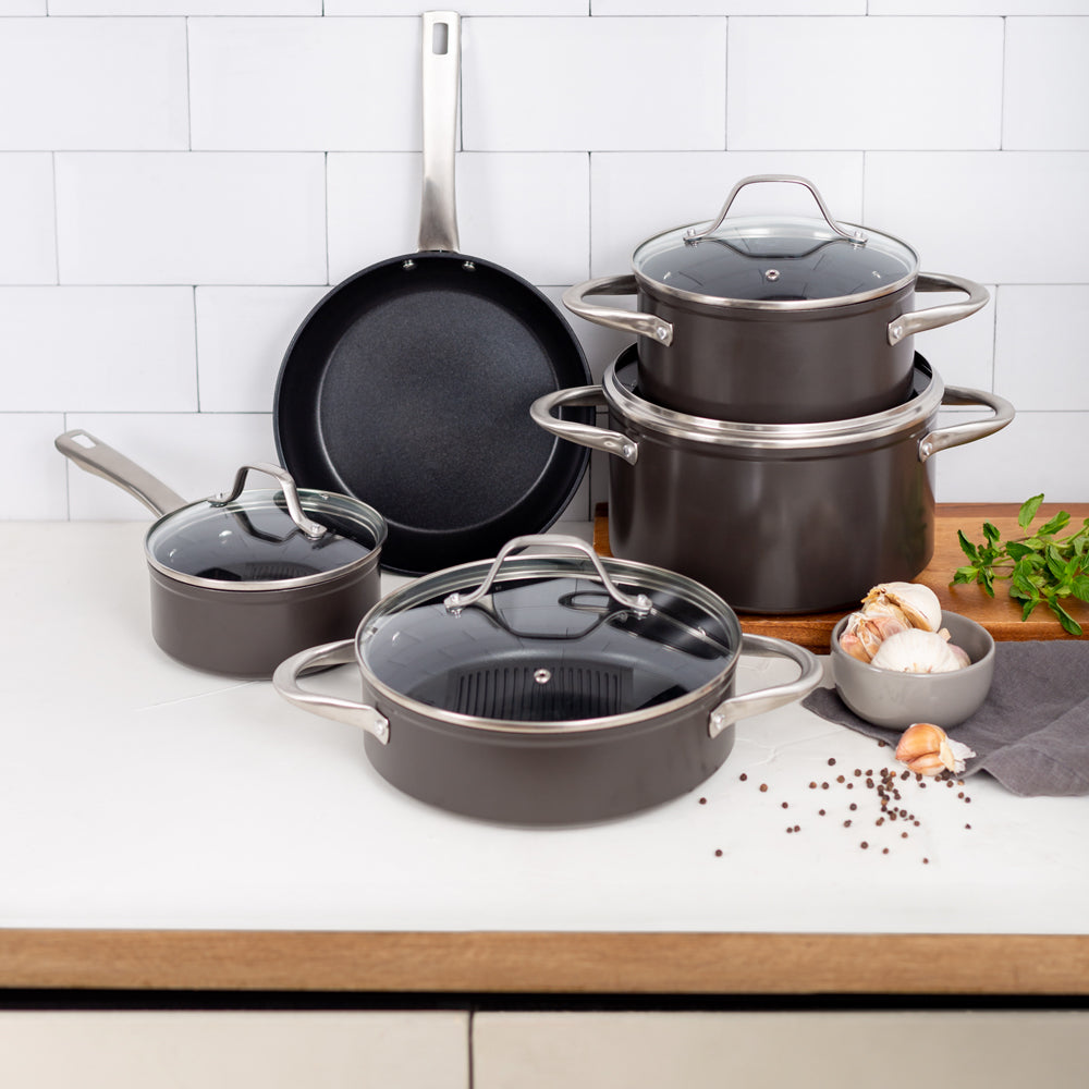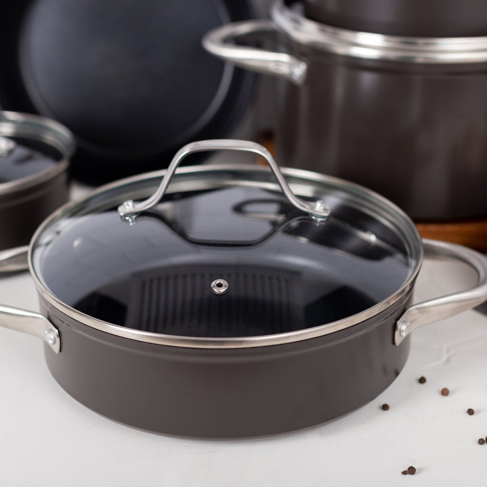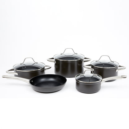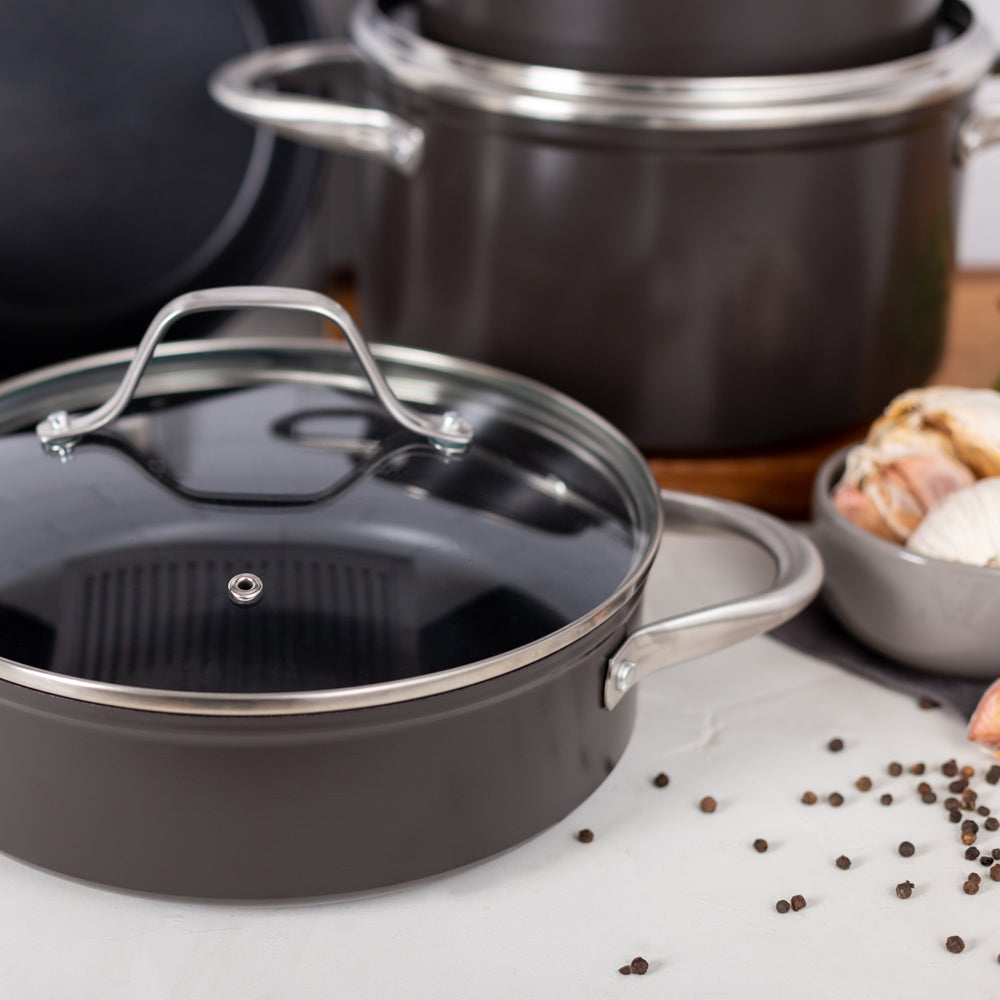 Prepara tus mejores recetas con la Batería Simple Cook Metz 9pzs. Con su elegante diseño negro mate, su potente tecnología antiadherente y cocción uniforme en sus piezas, esta batería se convertirá en tu mejor aliada. Incluye 1 olla grande con tapa de 24 x 13cm, 1 mediana de 20x10cm igualmente con tapa y una olla arrocera con tapa de 24x7cm; 1 cacerola de 16x7cm con tapa y 1 sartén de 24x4.5cm. Su estructura es de aluminio forjado y revestida interiormente, sus mangos y asas son de acero inoxidable, además de contar con tapas de vidrio templado con salida para el vapor.