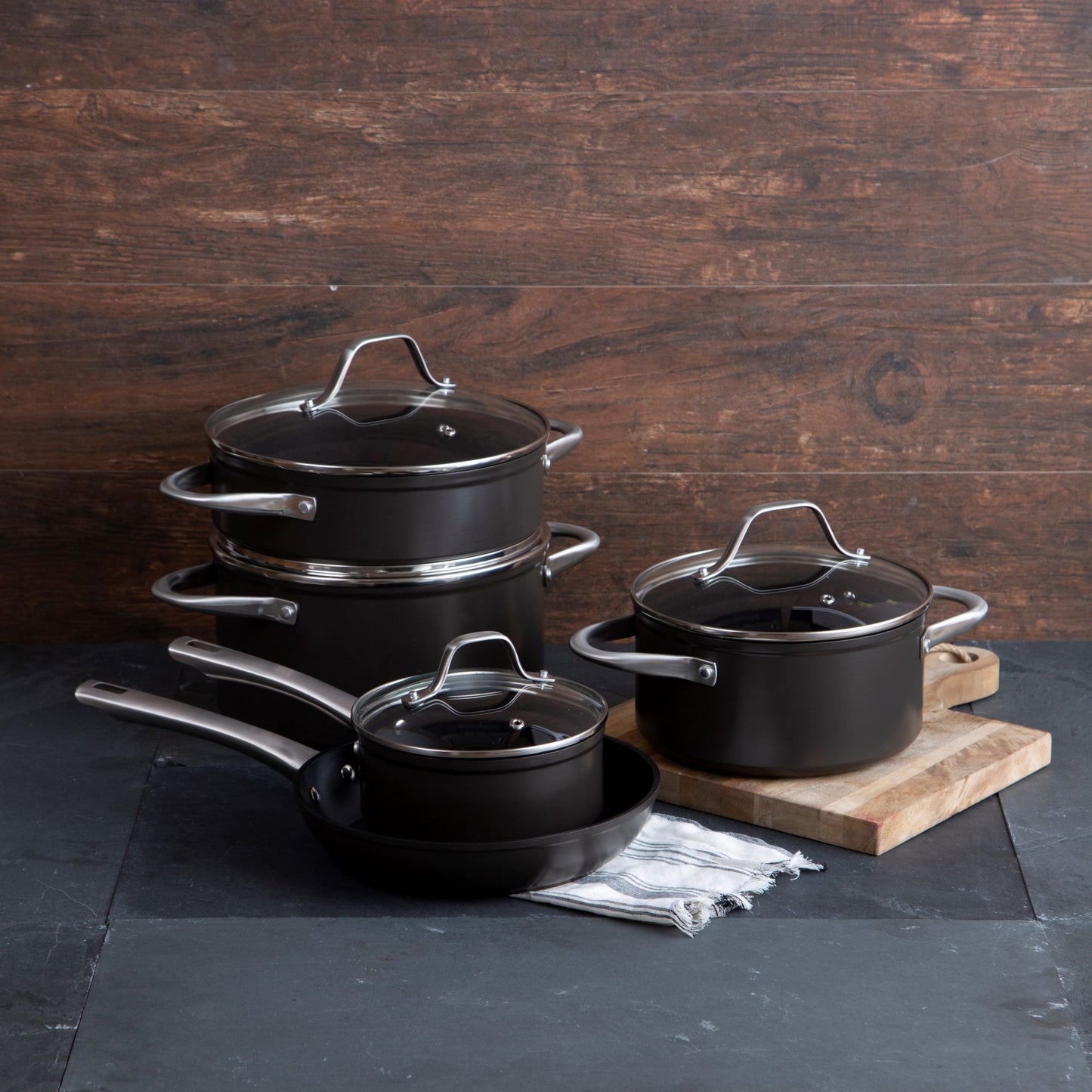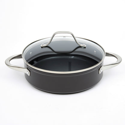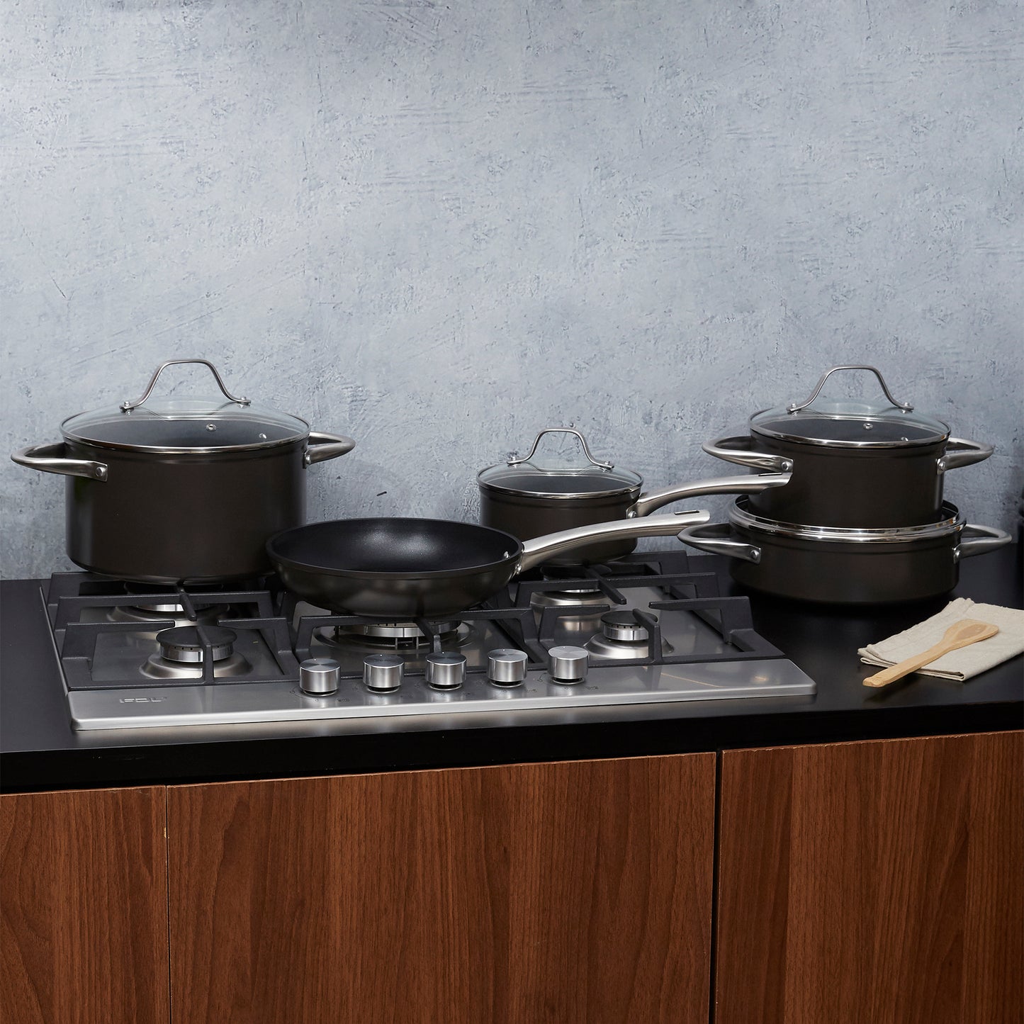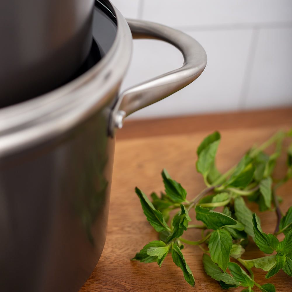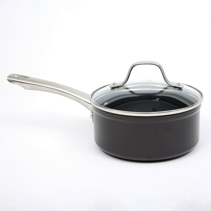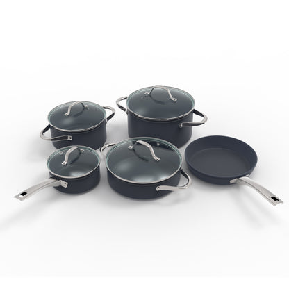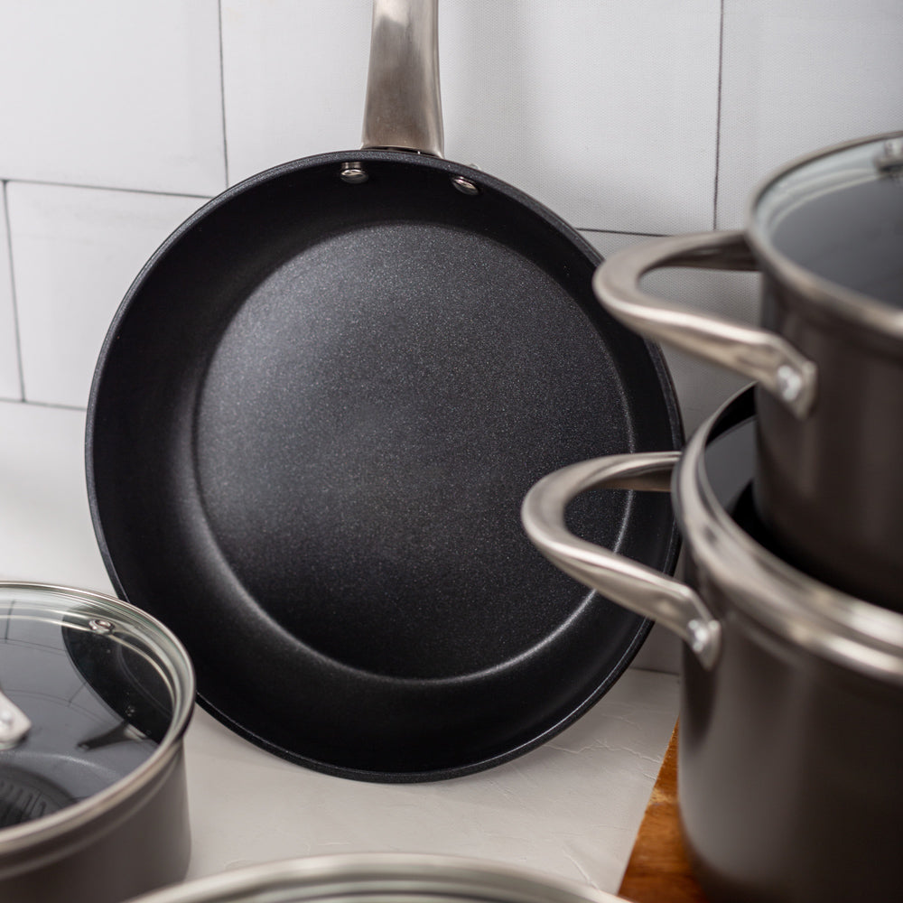 Prepara tus mejores recetas con la Batería Simple Cook Metz 9pzs. Con su elegante diseño negro mate, su potente tecnología antiadherente y cocción uniforme en sus piezas, esta batería se convertirá en tu mejor aliada. Incluye 1 olla grande con tapa de 24 x 13cm, 1 mediana de 20x10cm igualmente con tapa y una olla arrocera con tapa de 24x7cm; 1 cacerola de 16x7cm con tapa y 1 sartén de 24x4.5cm. Su estructura es de aluminio forjado y revestida interiormente, sus mangos y asas son de acero inoxidable, además de contar con tapas de vidrio templado con salida para el vapor.