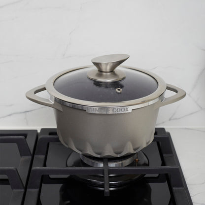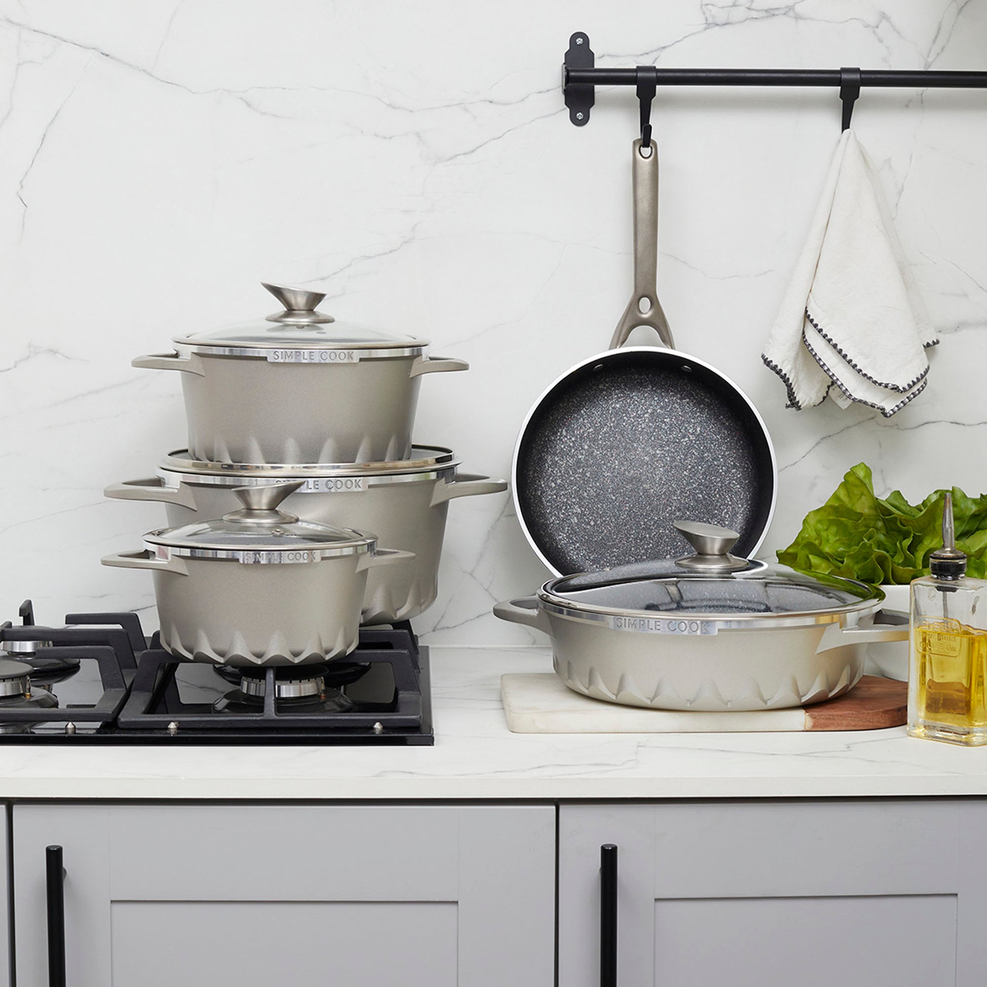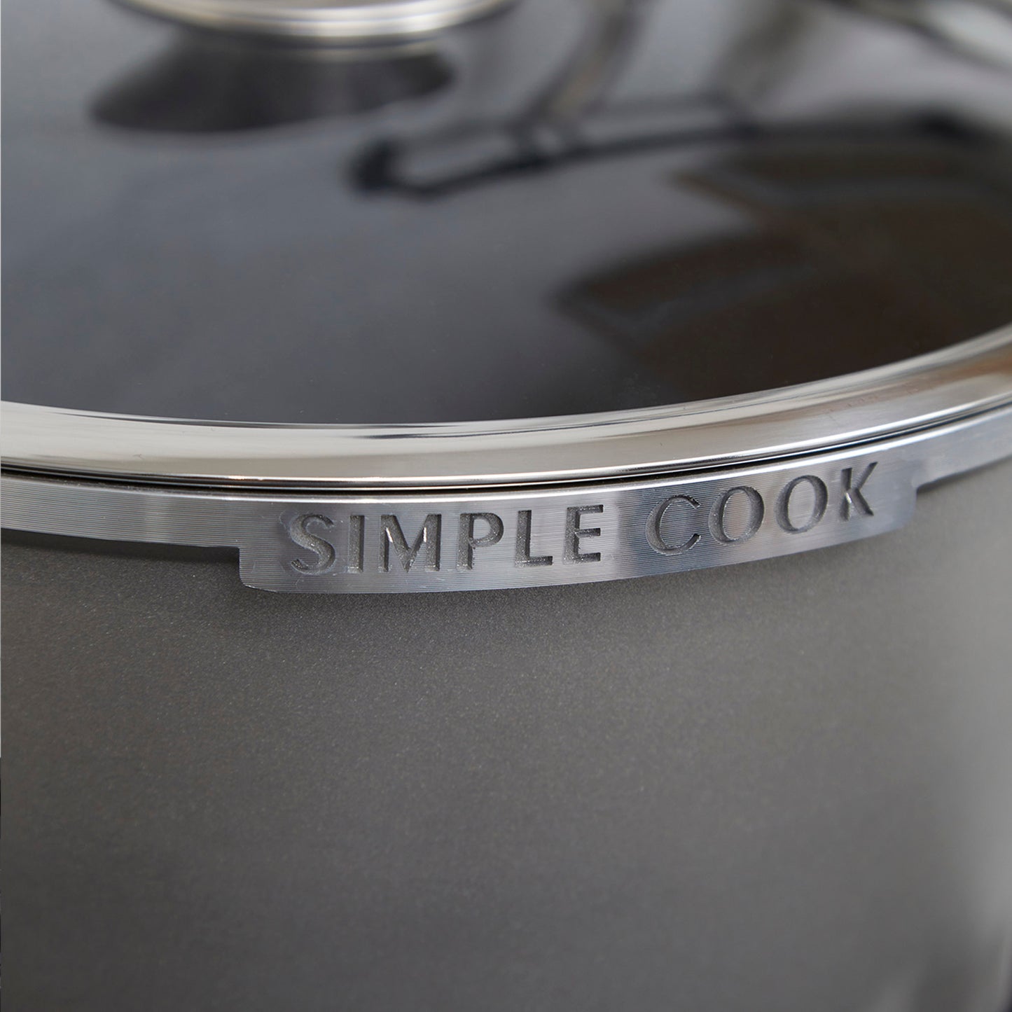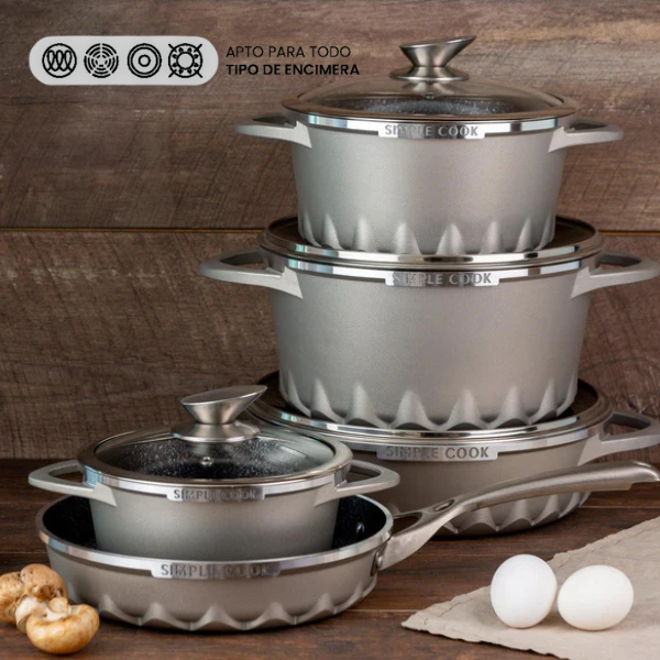 La Batería de Cocina Mont Blanc 9 pzs Simple Cook de aluminio forjado es ligera, resistente y fácil de manipular. Su diseño moderno, con líneas geométricas en la base, le da un aspecto premium y minimalista, mientras que el acabado metálico mate con detalles en acero inoxidable aporta un look sofisticado. Soporta altas temperaturas y ofrece gran conductividad térmica, asegurando una cocción eficiente. Su interior cuenta con revestimiento antiadherente Pfluon, libre de PFOA y GenX, para una cocina más saludable.