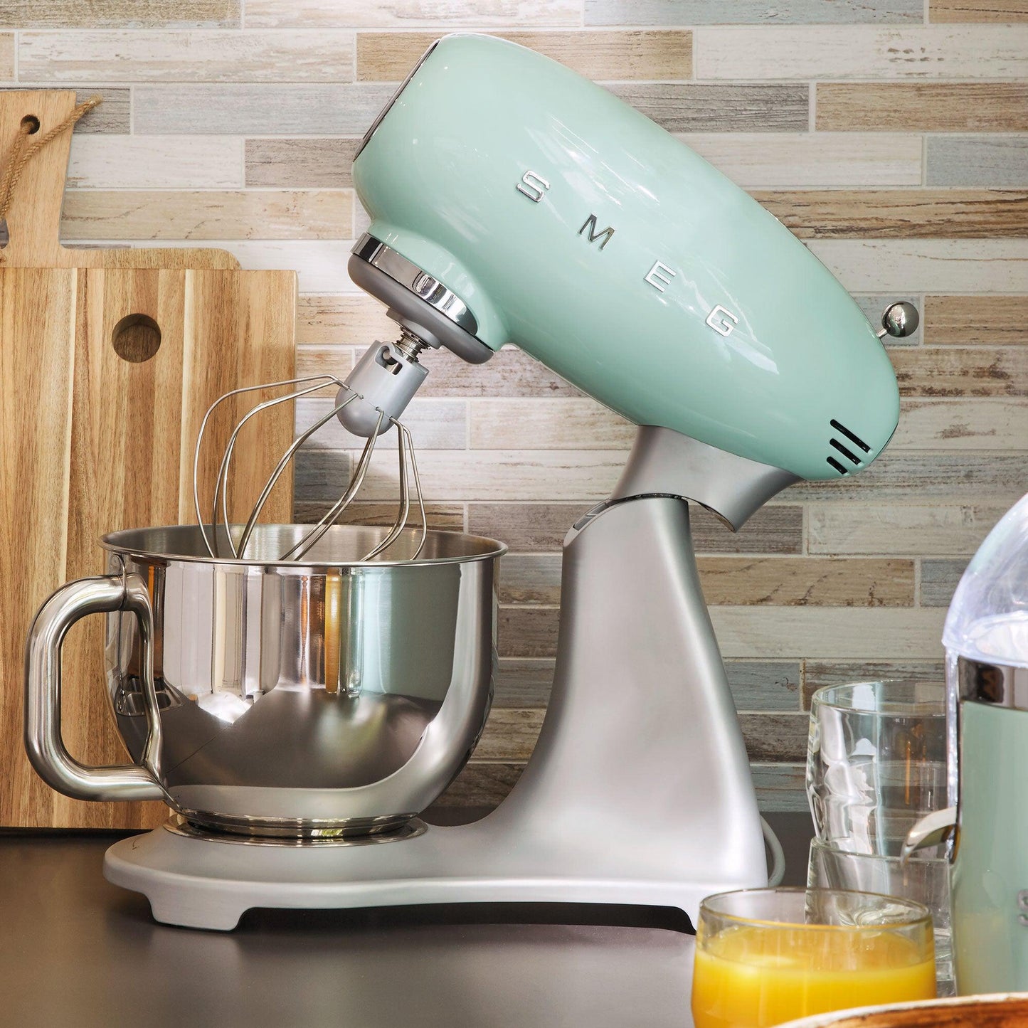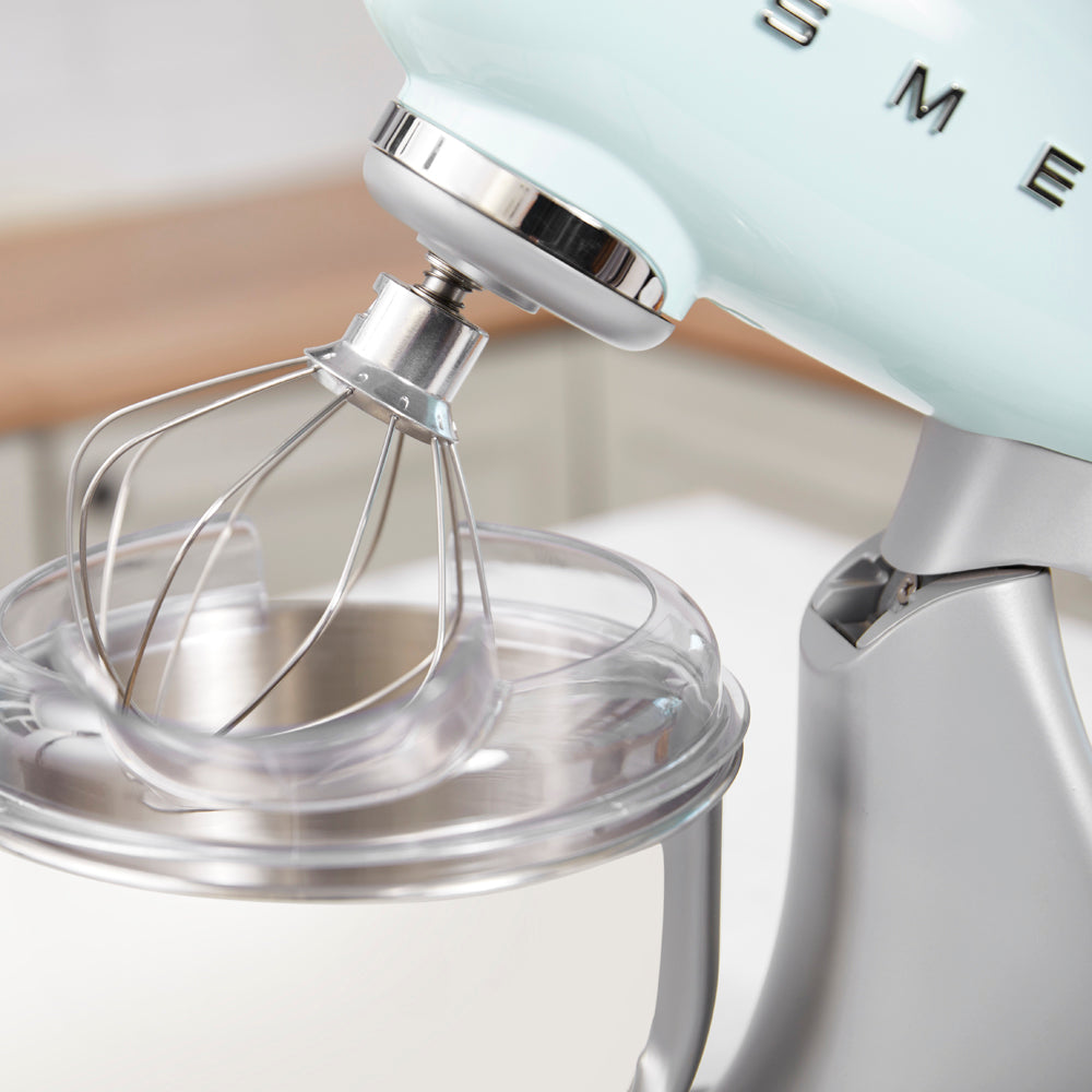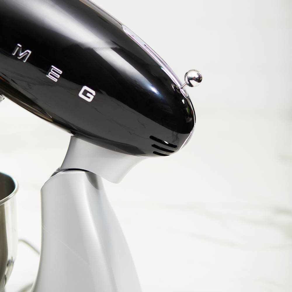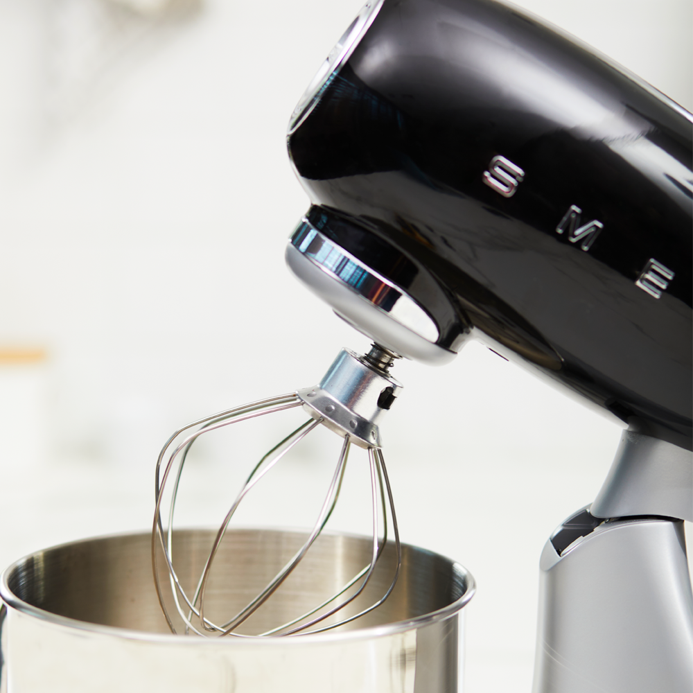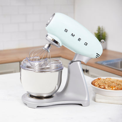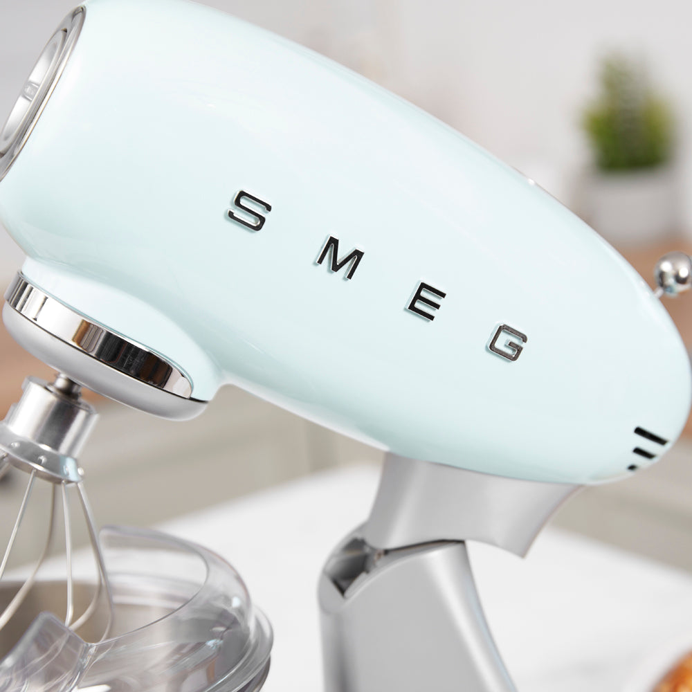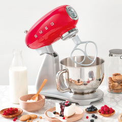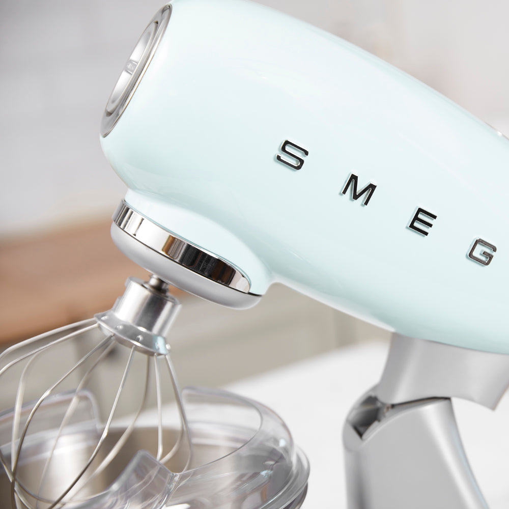 Con su estilo retro característico esta batidora de pedestal Smeg cuenta con 800 W de potencia que puede ser ajustado en sus 10 velocidades, cada una con arranque suave. Cuenta con movimiento planetario, base antideslizante y sistema bloqueo seguridad cuando el cuerpo esta levantado.