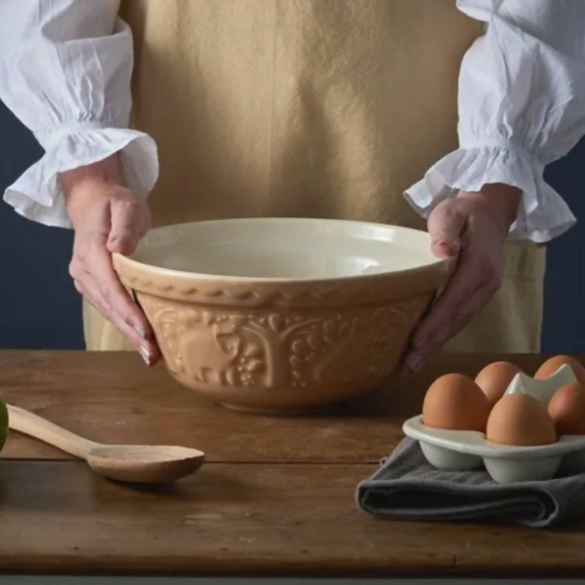 El Bowl Mason Cash de 24 cms está disponible en dos colores: Café Latte y Naranjo Ocre. Es perfecto para servir ensaladas, postres o para mezclas de pudín y masa para galletas. Parte de la Línea Mason Cash In the Forest, este bowl está grabado con escenas de bosques inspiradas en cuentos populares de mediados del siglo XIX. Capacidad: 2 litros