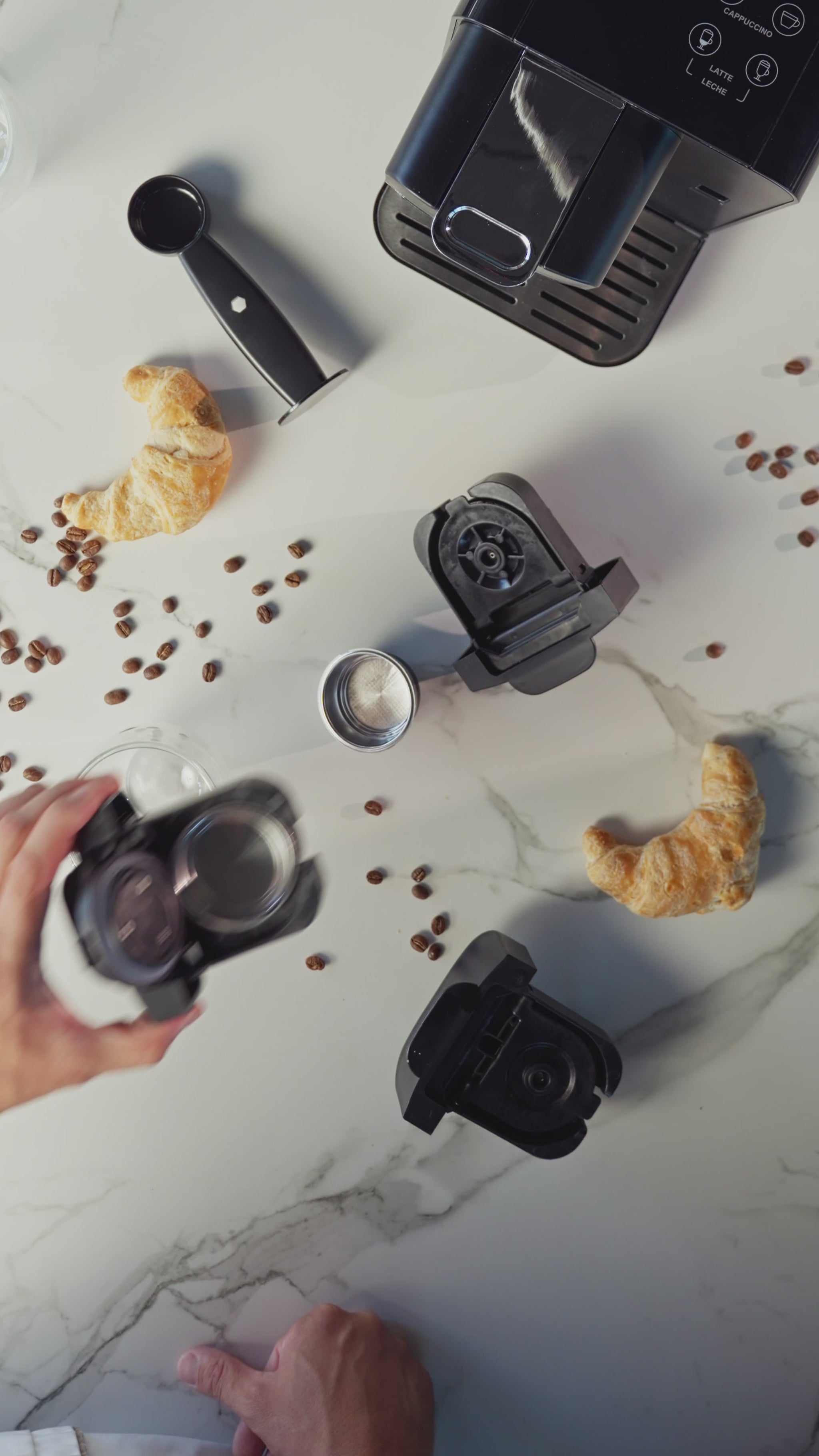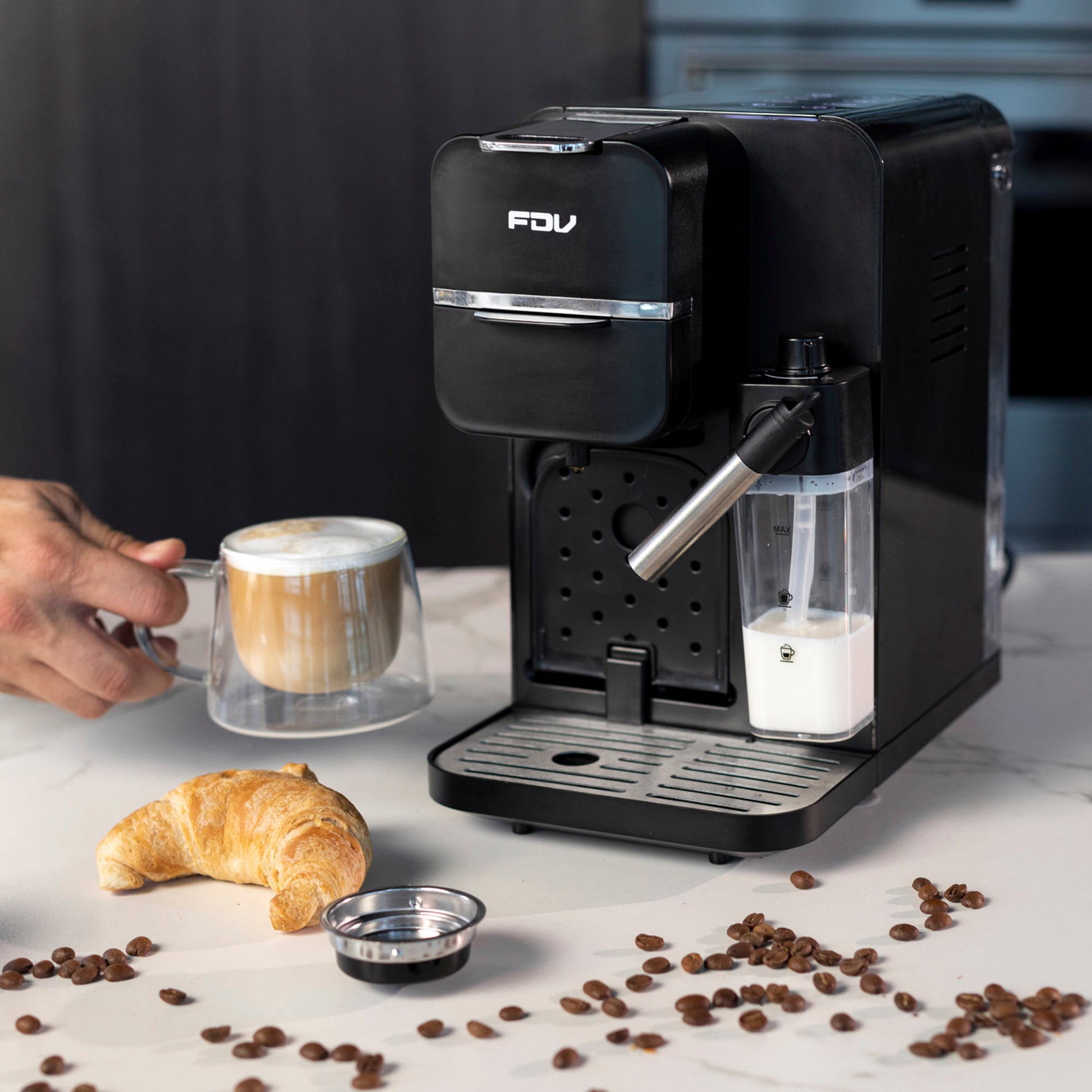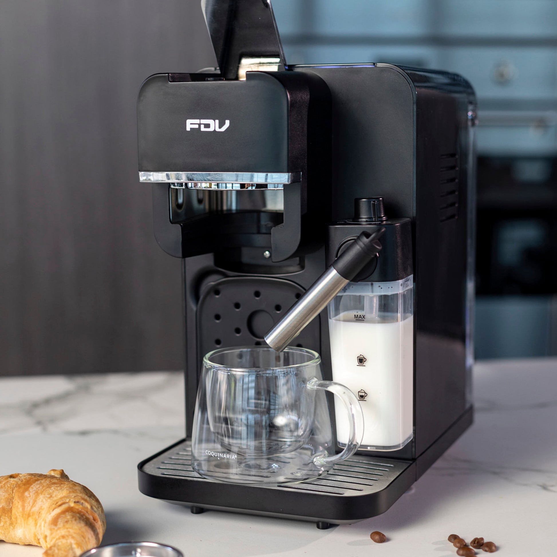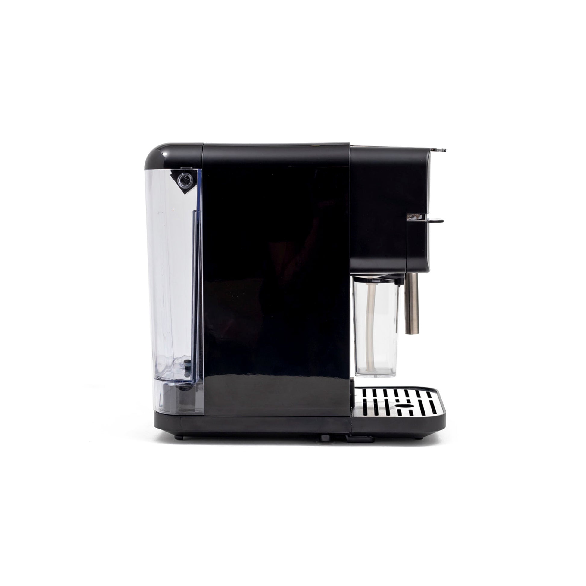 Disfruta del café perfecto en casa con esta cafetera 4 en 1, diseñada para preparar espresso, cappuccino, latte y café con leche. Su bomba italiana de 20 bares garantiza una extracción intensa y aromática, mientras que el sistema Thermoblock calienta el agua rápidamente. El control volumétrico permite elegir taza corta o larga, y el depósito de leche de 150 ml con vaporizador crea espuma cremosa automáticamente. Compatible con cápsulas Nespresso, Dolce Gusto y café molido, incluye botones retroiluminados de un solo toque para preparar tus bebidas favoritas de forma rápida y sencilla. Ideal para comodidad y calidad profesional en casa.