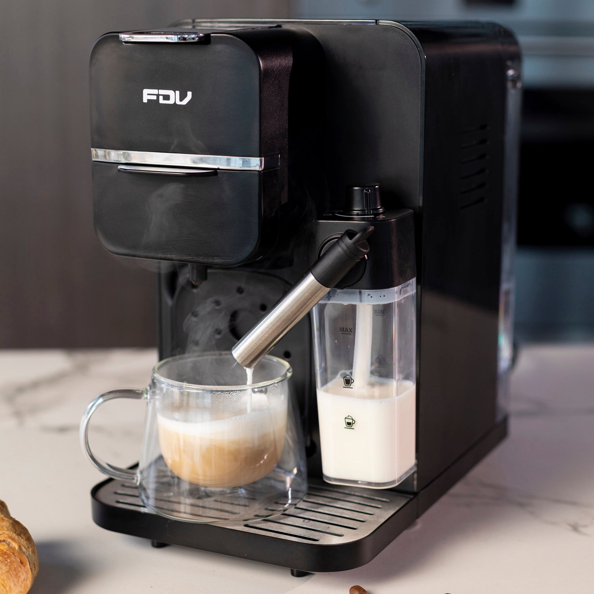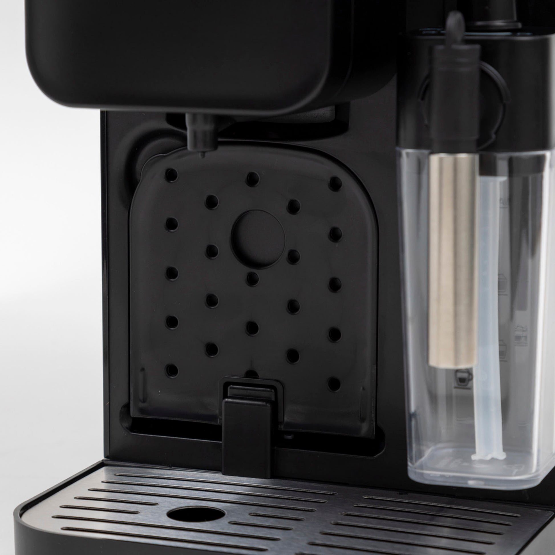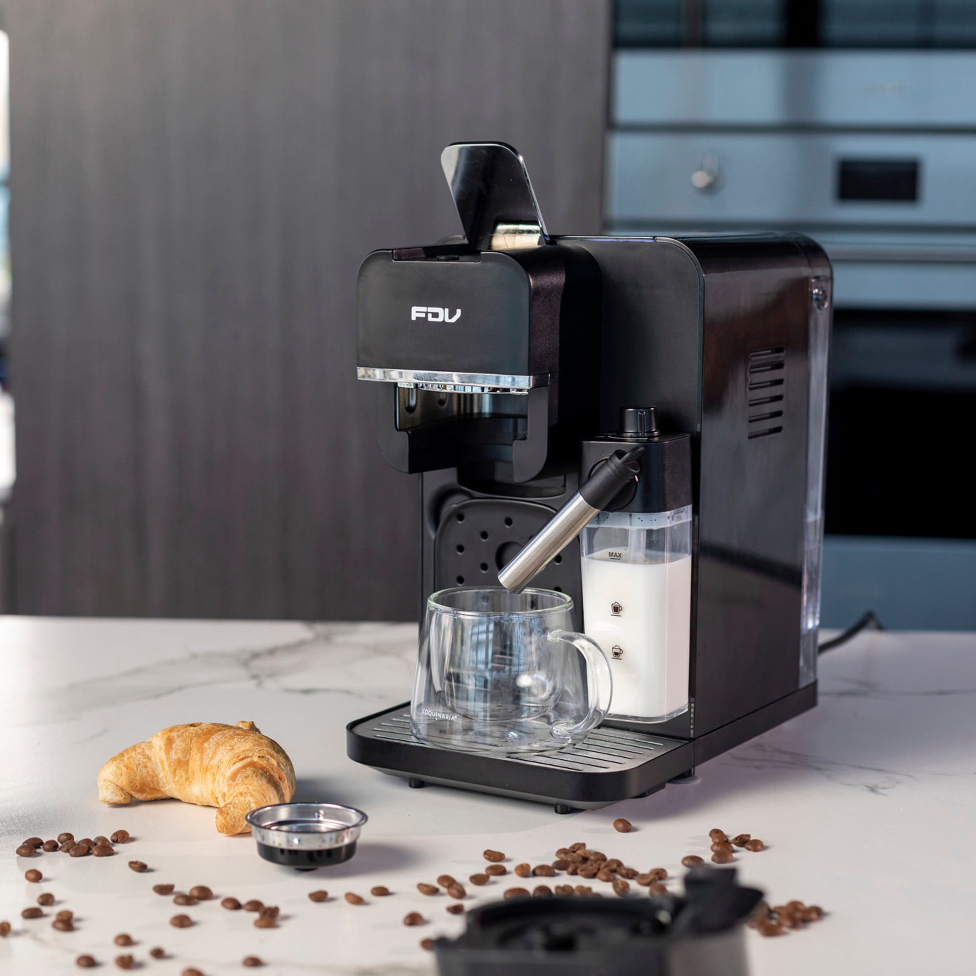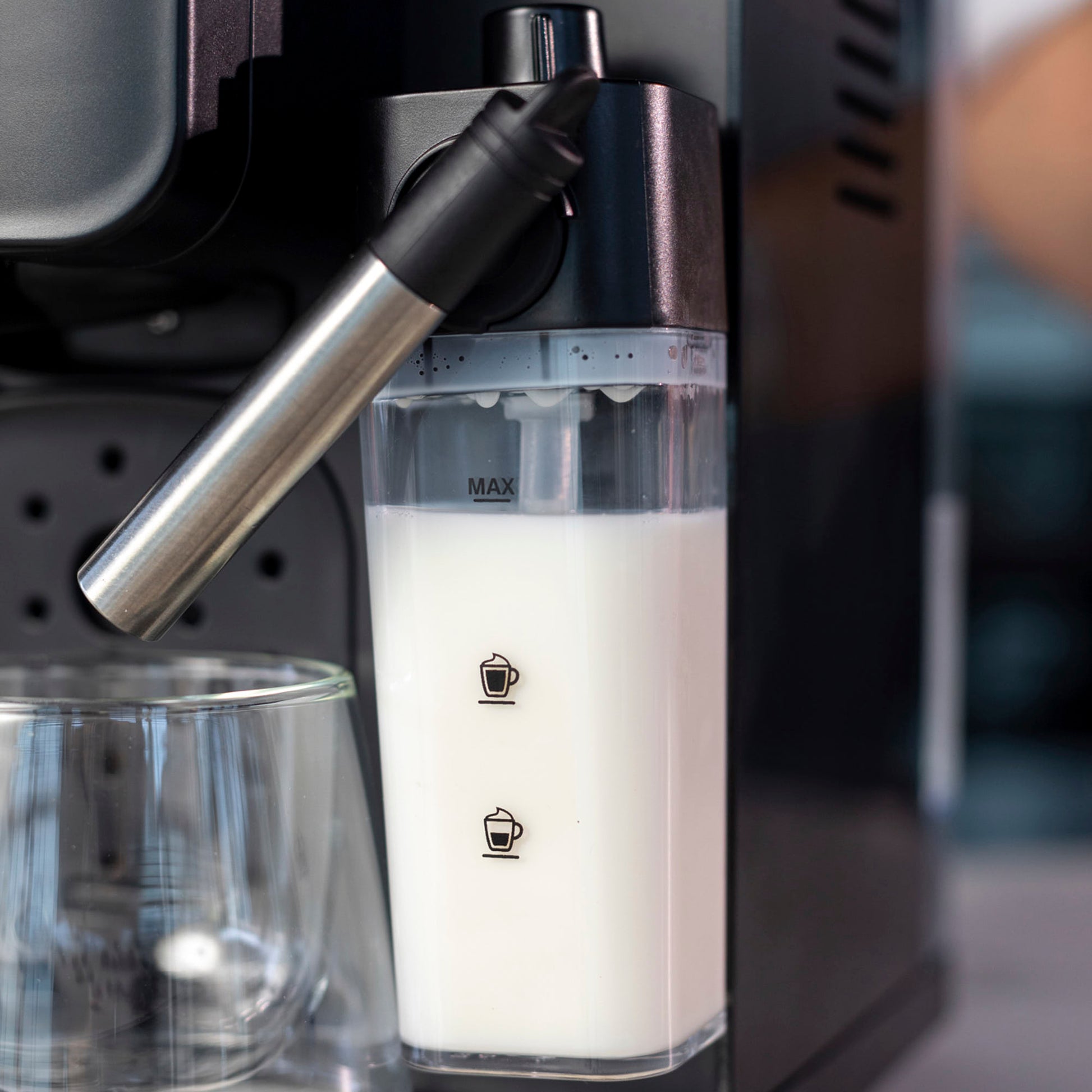 Disfruta del café perfecto en casa con esta cafetera 4 en 1, diseñada para preparar espresso, cappuccino, latte y café con leche. Su bomba italiana de 20 bares garantiza una extracción intensa y aromática, mientras que el sistema Thermoblock calienta el agua rápidamente. El control volumétrico permite elegir taza corta o larga, y el depósito de leche de 150 ml con vaporizador crea espuma cremosa automáticamente. Compatible con cápsulas Nespresso, Dolce Gusto y café molido, incluye botones retroiluminados de un solo toque para preparar tus bebidas favoritas de forma rápida y sencilla. Ideal para comodidad y calidad profesional en casa.