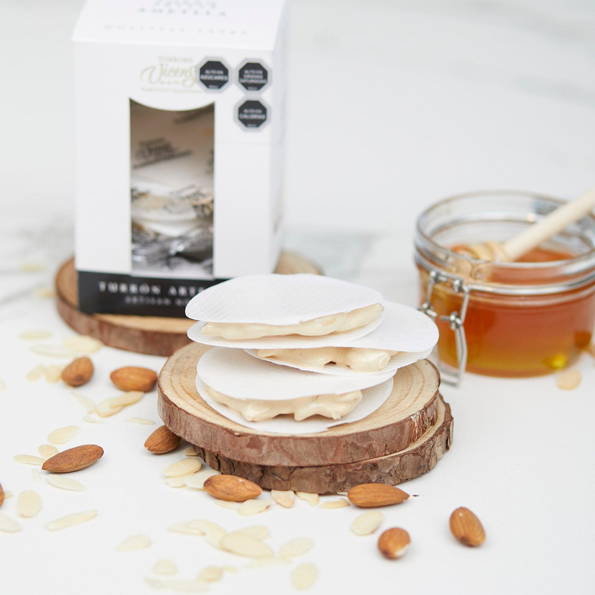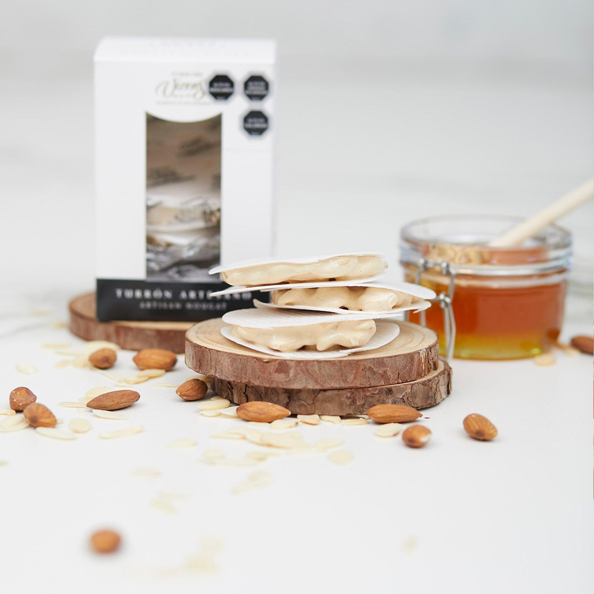Su textura firme y su color crema evocan la calidez y autenticidad de lo hecho a mano, transportándote al corazón de la tradición mediterránea. Perfecto para compartir momentos especiales o regalar un pedacito de historia, estos turrones son el detalle que transforma lo cotidiano en extraordinario.