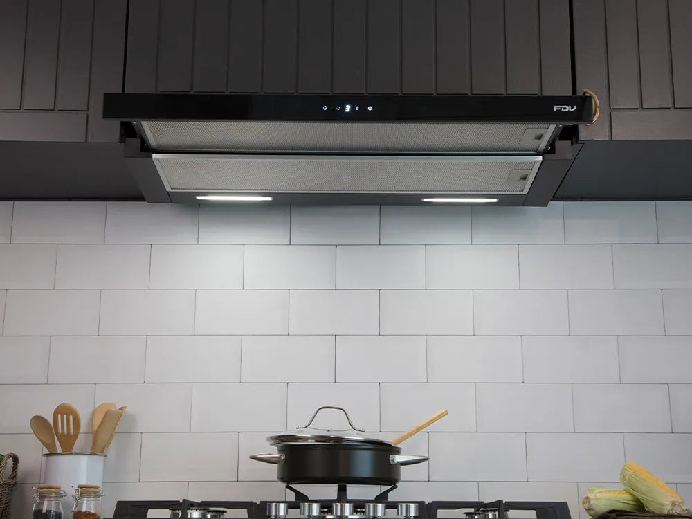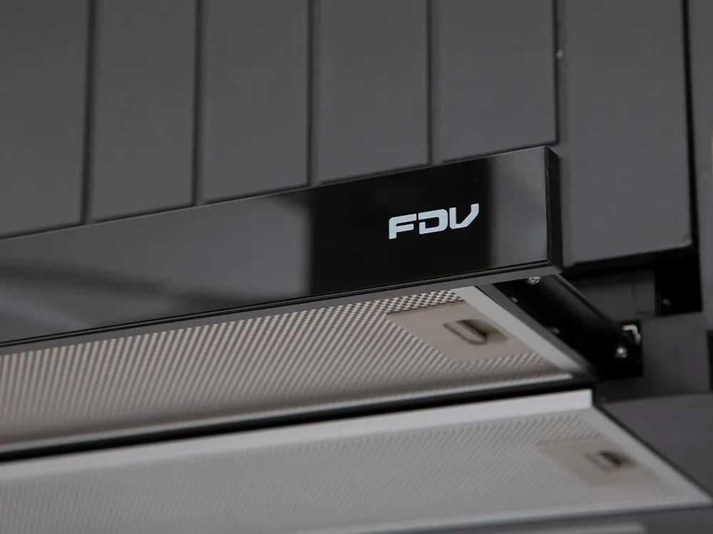 La Campana Urban Black 90 cm FDV destaca por su elegante color negro y combinación de acero inoxidable resistente con un frente de cristal templado. Con una capacidad de aspiración de hasta 500 m³/h, mantiene tu cocina libre de humo y olores.