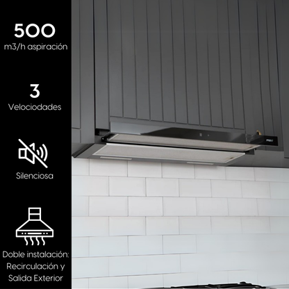 Diseñada para montaje bajo mueble, es compatible con recirculación o salida exterior y ofrece 3 velocidades para un control adaptable a tus necesidades culinarias.