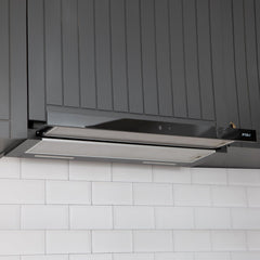 Bajo mueble de 90 cm, con tres velocidades y capacidad de aspiración de 500 m³/h. Admite instalación con recirculación o salida exterior. Silenciosa (57 dBA), es una opción estilizada y práctica para cocinas modernas.