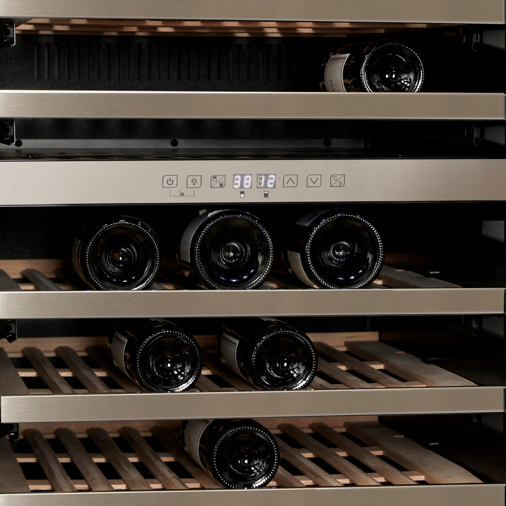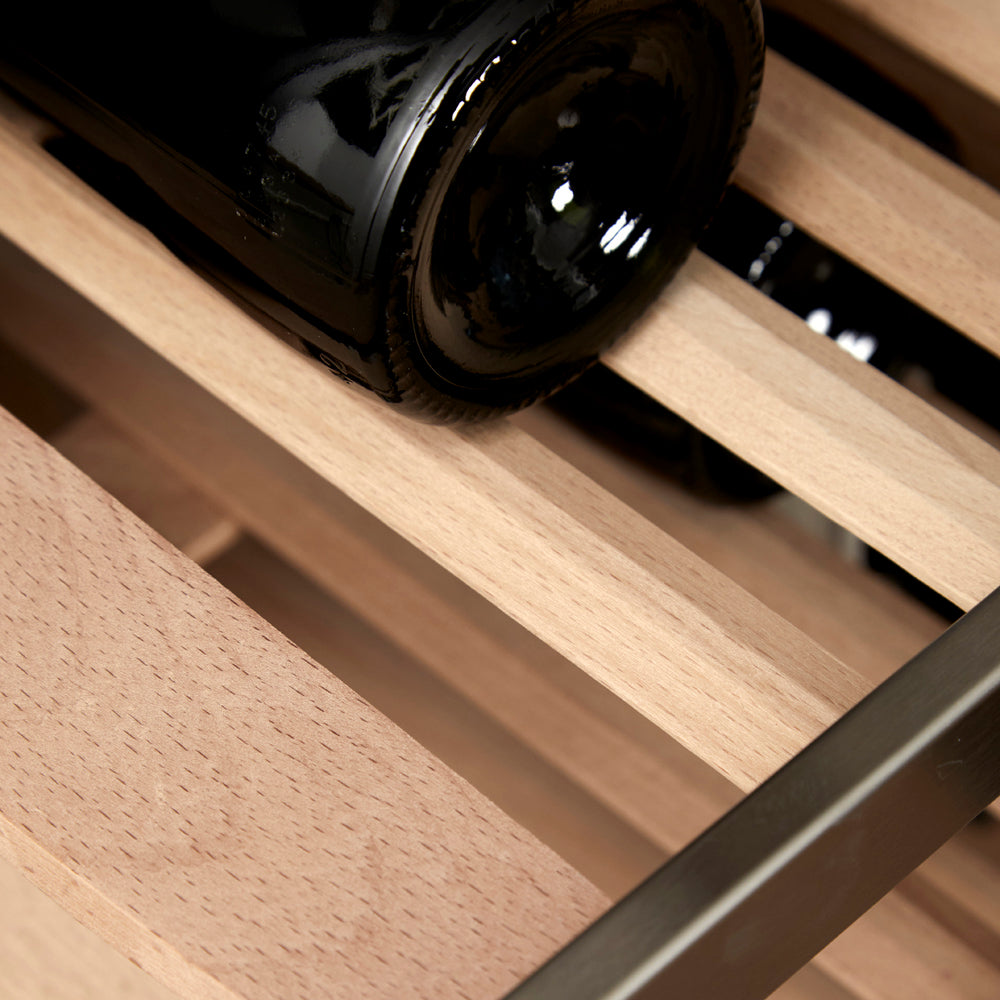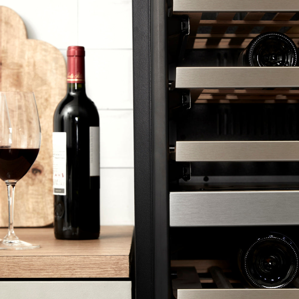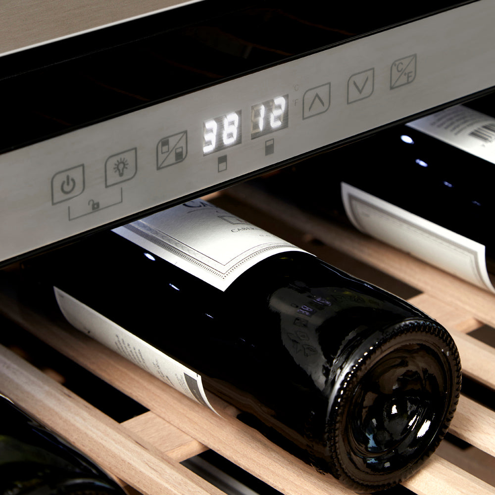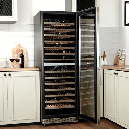 Descubre la elegancia y funcionalidad de la nueva Cava de Vinos Eléctrica Expert 171 FDV, capaz de albergar hasta 171 botellas de vino o champagne estándar de 750 ml. Esta avanzada cava ofrece 2 zonas independientes para ajustar distintas temperaturas entre 5 a 22 °C, permitiendo separar vinos tintos y blancos a la temperatura ideal para cada uno. Su diseño incorpora doble vidrio en la puerta y cerradura de seguridad, garantizando una conservación óptima y protección adicional. El frente y manilla de acero inoxidable, junto con estantes de madera y luz LED interior que se activa automáticamente al abrir la puerta, complementan su apariencia sofisticada. La función de bloqueo para niños añade un nivel extra de seguridad, haciéndola perfecta para cualquier entusiasta del vino que busque combinar estilo, seguridad y funcionalidad en un solo dispositivo.
