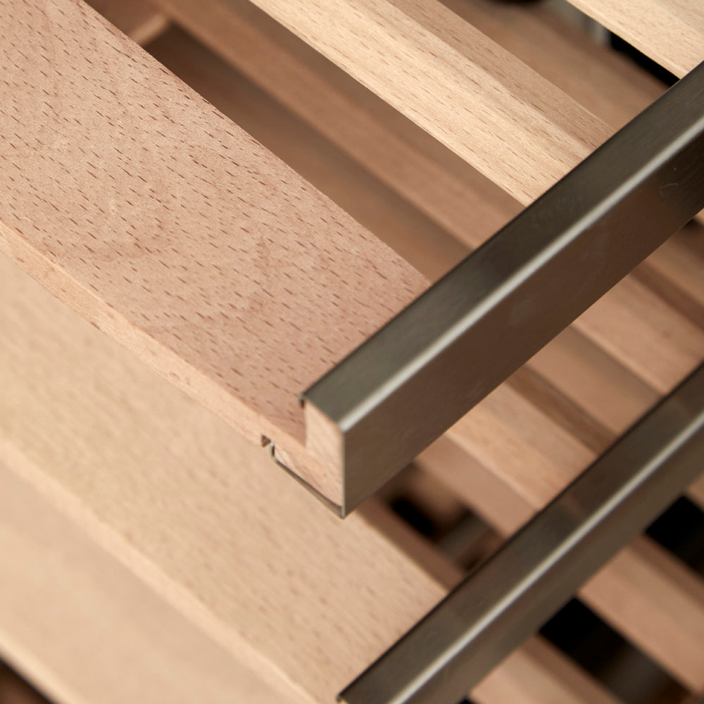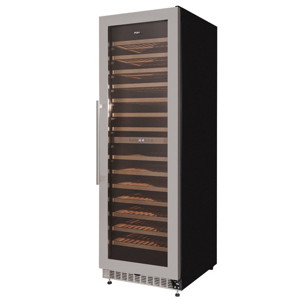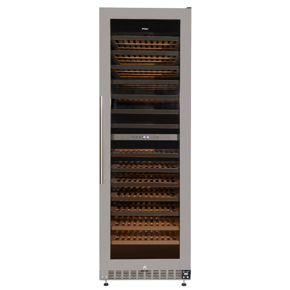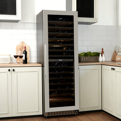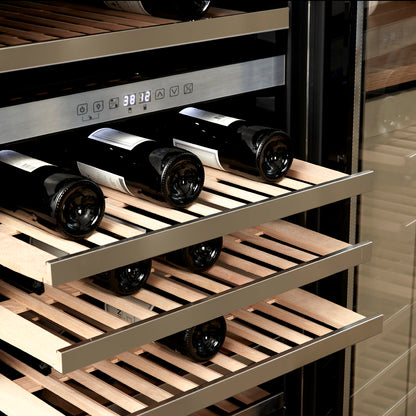 Descubre la elegancia y funcionalidad de la nueva Cava de Vinos Eléctrica Expert 171 FDV, capaz de albergar hasta 171 botellas de vino o champagne estándar de 750 ml. Esta avanzada cava ofrece 2 zonas independientes para ajustar distintas temperaturas entre 5 a 22 °C, permitiendo separar vinos tintos y blancos a la temperatura ideal para cada uno. Su diseño incorpora doble vidrio en la puerta y cerradura de seguridad, garantizando una conservación óptima y protección adicional. El frente y manilla de acero inoxidable, junto con estantes de madera y luz LED interior que se activa automáticamente al abrir la puerta, complementan su apariencia sofisticada. La función de bloqueo para niños añade un nivel extra de seguridad, haciéndola perfecta para cualquier entusiasta del vino que busque combinar estilo, seguridad y funcionalidad en un solo dispositivo.