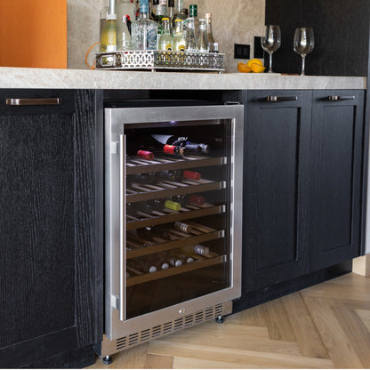 Experimenta la elegancia y modernidad con la Cava de Vino Expert, apta para 54 botellas estándar de 750 ml. Este modelo, con su diseño atractivo de acero inoxidable y estantes de madera, ofrece un control preciso de temperatura para almacenar tus vinos en condiciones óptimas. En su interior, cuenta con 5 bandejas de madera con guía telescópica, facilitando el acceso a tus vinos favoritos. La puerta con doble vidrio templado y cerradura de seguridad asegura una conservación ideal y protección contra cambios de temperatura, mientras la función de bloqueo para niños y la luz LED interior mejoran su funcionalidad y seguridad.