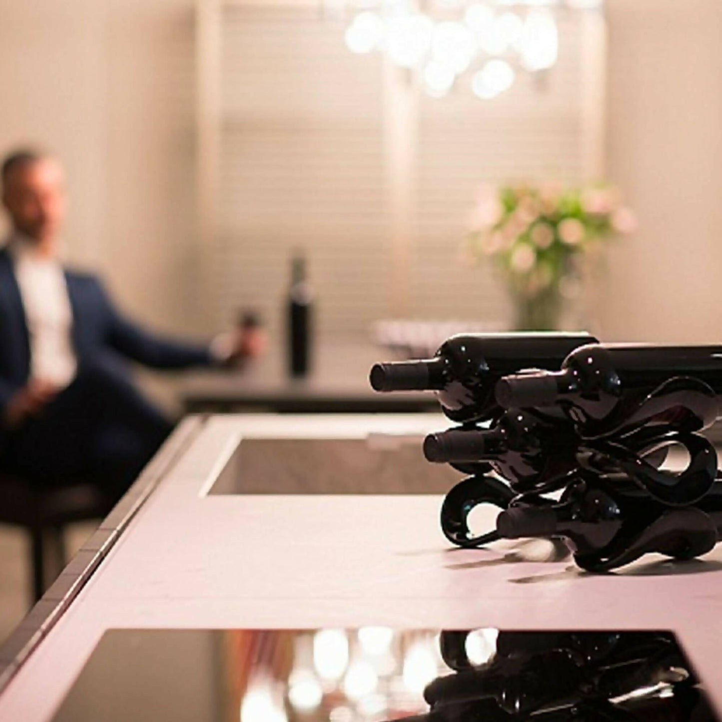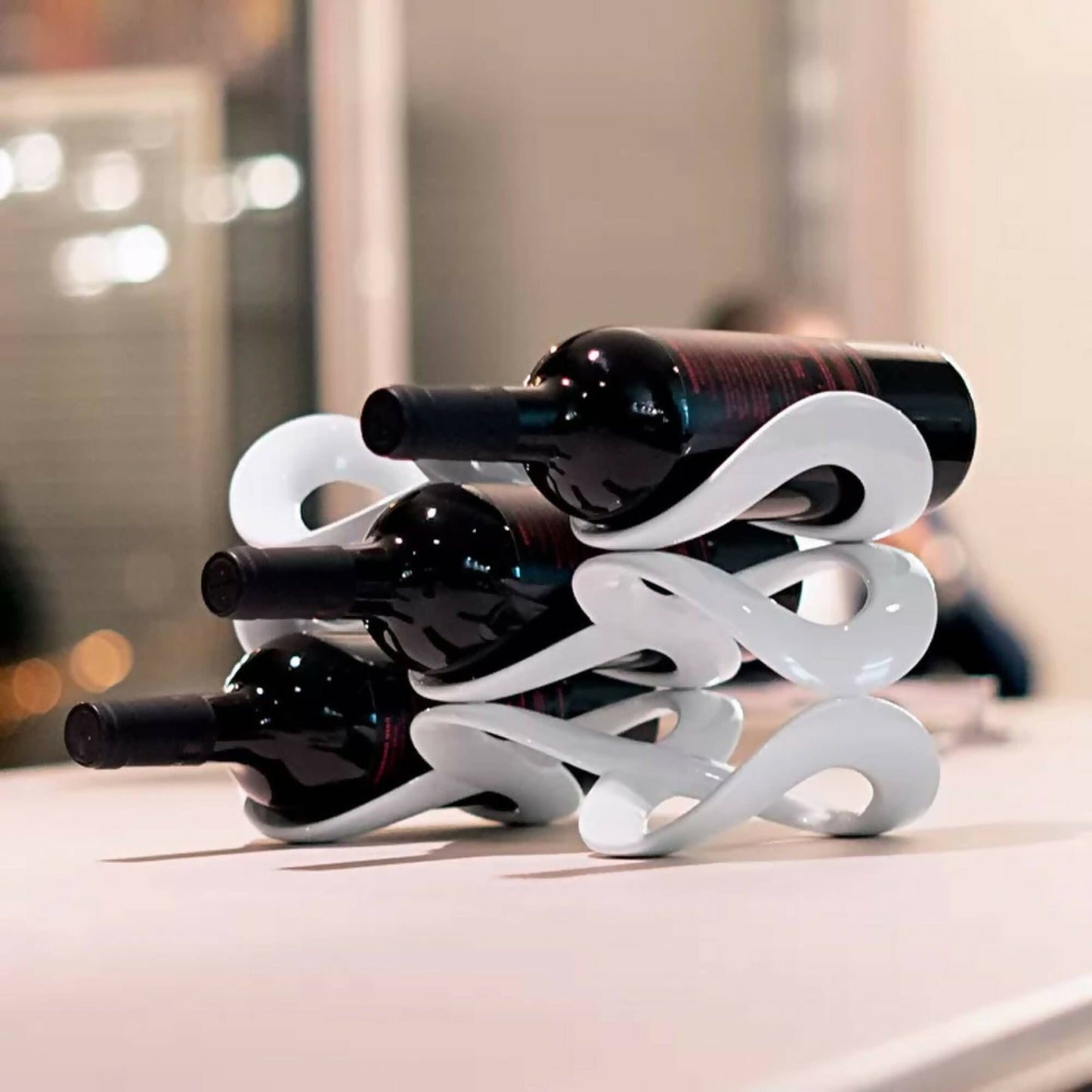 La Cava de Vinos de la Línea Icons Collection es de diseño elegante y refinado, también se puede utilizar como objeto de decoración gracias a su forma original: una cinta acrílica que se entrelaza para crear un expositor que puede contener botellas de diámetros diferentes