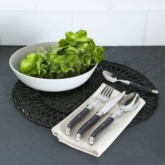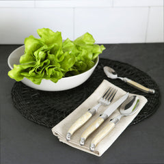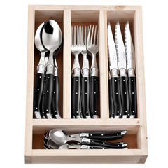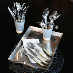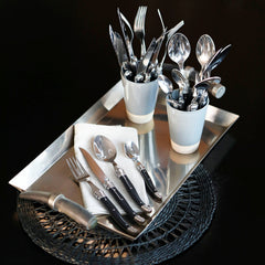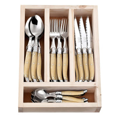 La Fabrica Jean Nerón, de la región de Laguiole, Francia, tiene mas de 100 años de tradición en la elaboración de cuchillos de alta calidad. Este juego de Cuchillería 24 Piezas Jean Nerón Laguiole, para 6 personas incluye 6 cuchillos, 6 tenedores, 6 cucharas de sopa y 6 cucharas de té. Contiene su certificado de autenticidad.