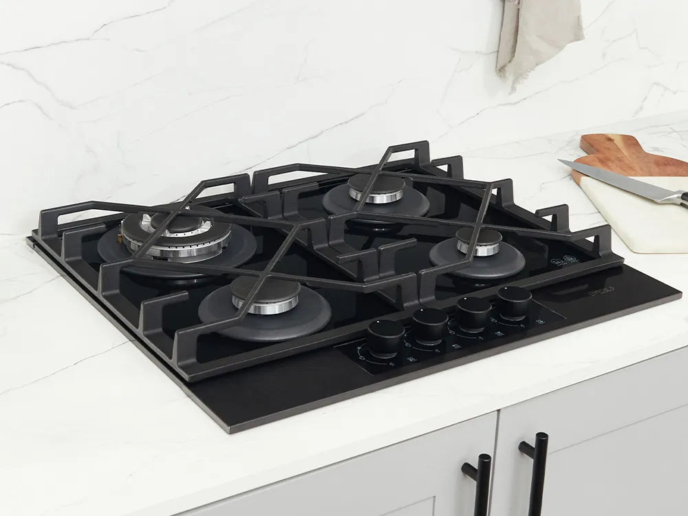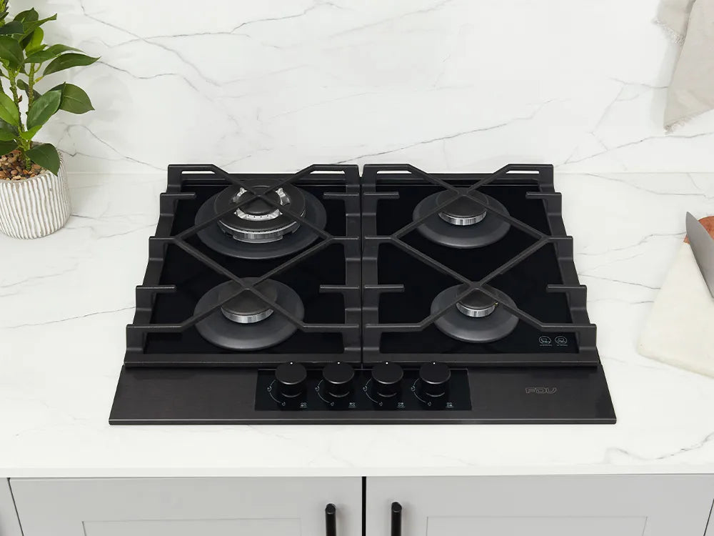 La encimera a gas FDV Signature 60 ofrece un diseño moderno y funcional, ideal para cocinas pequeñas y medianas. Su cubierta de cristal templado negro no solo aporta un estilo sofisticado, sino que también facilita la limpieza y garantiza una alta resistencia al calor.