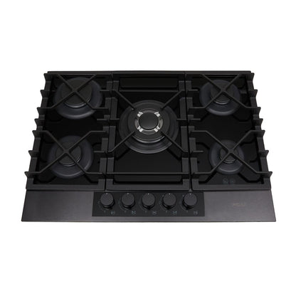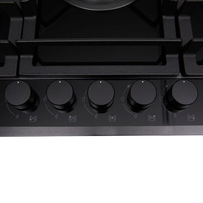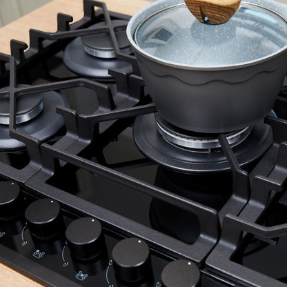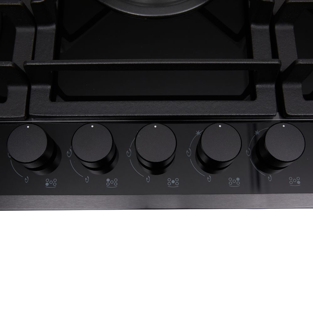 Encimera a gas con diseño moderno en negro y cubierta de cristal templado para fácil limpieza. Cuenta con 5 quemadores, incluyendo un quemador triple corona para una cocción potente y uniforme. Parrillas de hierro fundido para mayor durabilidad y estabilidad. Medidas: 85 mm (alto), 700 mm (ancho) y 510 mm (profundidad). Ideal para cocinas medianas que combinan funcionalidad y estilo.