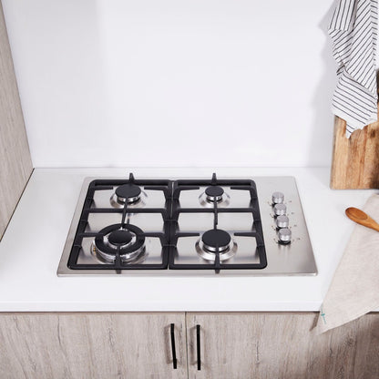 • Características Especiales Encimera de acero inoxidable, parrillas de hierro fundido que son fáciles de limpiar y evitan la acumulación de residuos y agua en los quemadores, lo que facilita el mantenimiento de la encimera, 4 focos de cocción