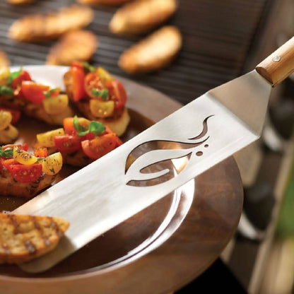 Experimente hacer asados en su parrilla con esta espátula de plancha flexible respetuosa con el medio ambiente, impecablemente hecha para mantenerse fiel a lo largo de los años. Perfecta para voltear hamburguesas en la plancha o parrilla. Descubiertos de materiales 100% sostenibles, incluidos mangos de bambú reciclados de acero inoxidable y criados en granjas, tanto el rendimiento de flexión como la cara cónica ultrafina manejan con precisión incluso los alimentos más delicados y difíciles de voltear. Calienta tu parrilla, no tu tierra. Mango de agarre de 45,7 cm o 18″ . Largo de la hoja de aluminio 22,8 cm o 9″. El lazo para colgar proporciona una forma conveniente de almacenar cuando no está en uso. Hecho de materiales 100% sostenibles (incluida la etiqueta)