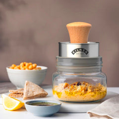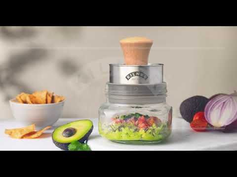 El set para Moler y Conservar de Kilner se puede usar para crear guacamole casero fresco y otros alimentos como hummus, baba ghanoush y comida para bebés, que luego se pueden consumir o almacenar en el frasco. La tapa superior de vidrio tiene un sello de silicona para mantener el contenido fresco.