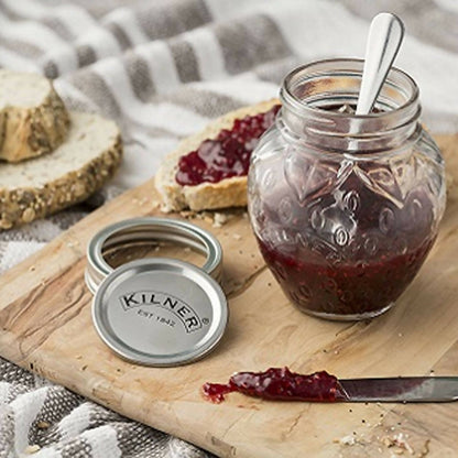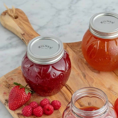 El frasco de conservas de frutilla de 0,4 litros es una forma divertida y moderna de servir mermeladas o conservas con una atractiva presentación. El frasco viene con una tapa de rosca de metal fácil de usar compuesta de 2 piezas, un sello de vacío y una banda de tornillo de metal para asegurar el sello.