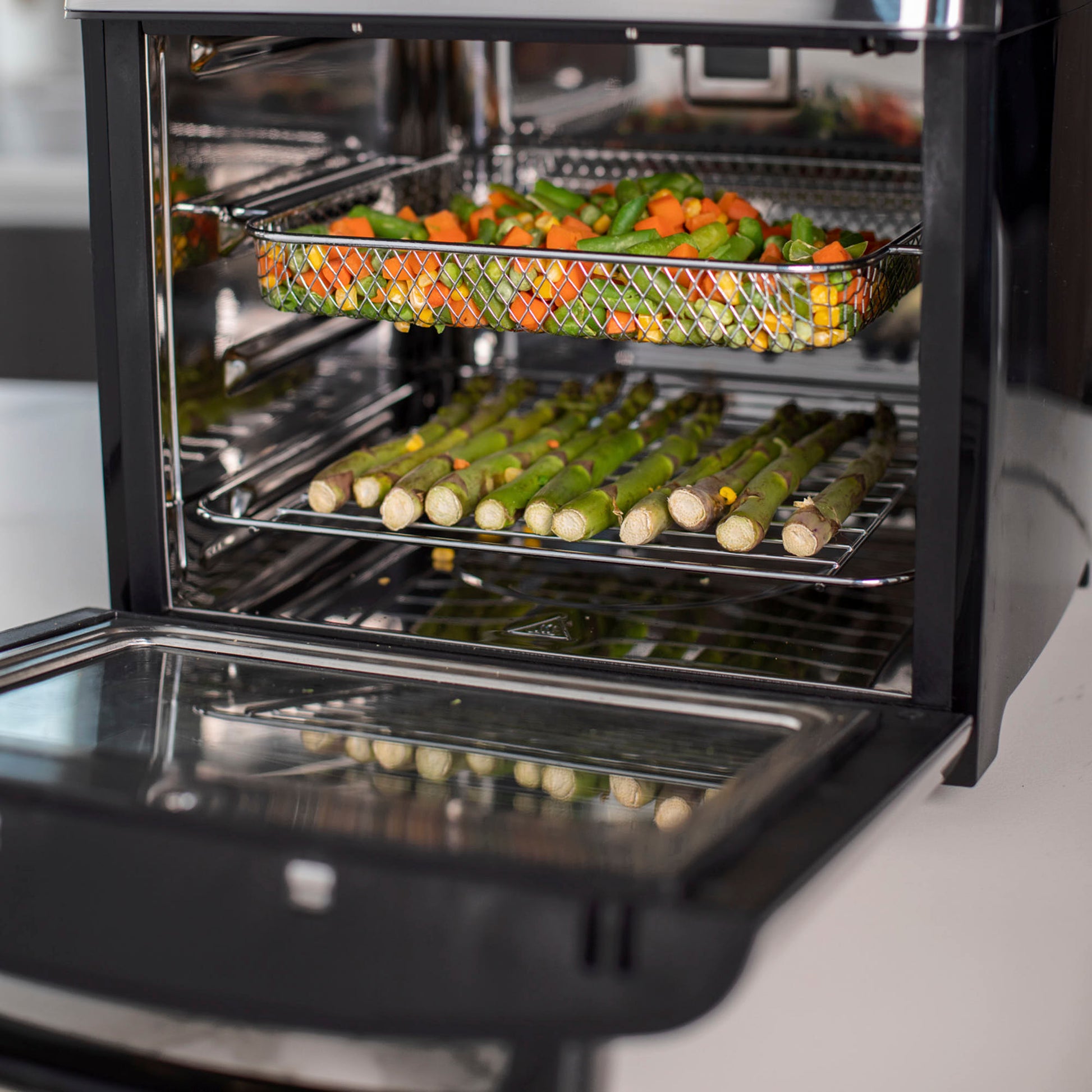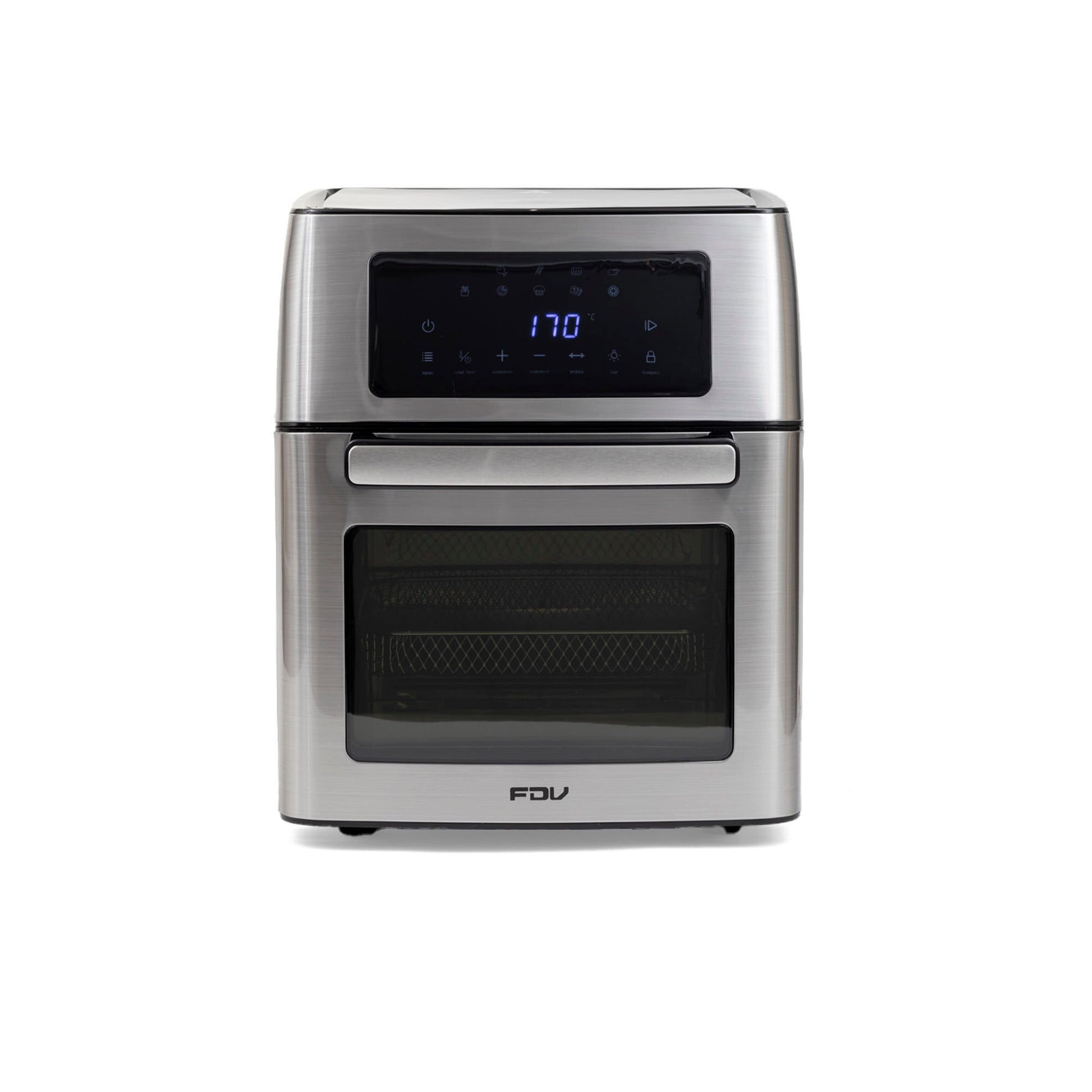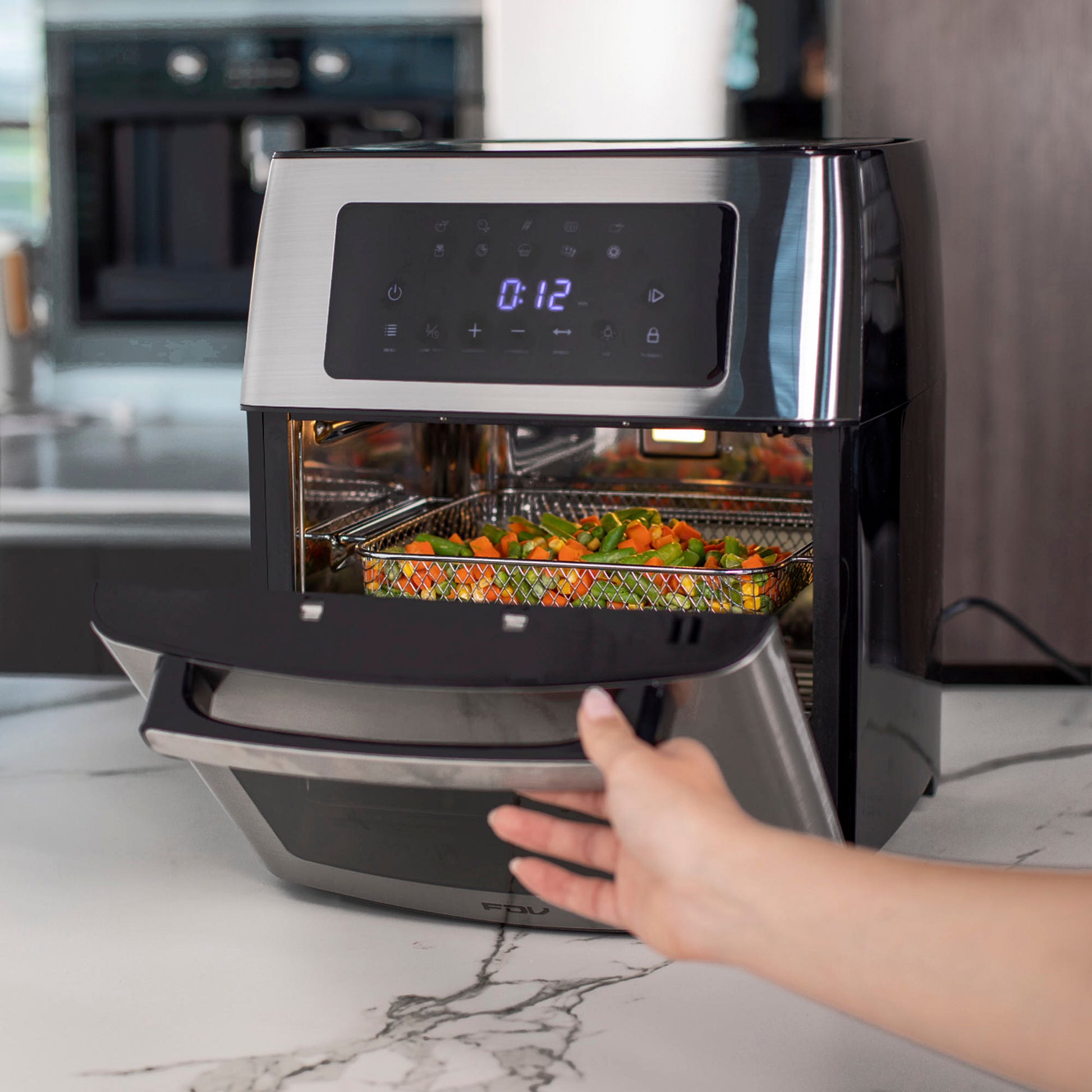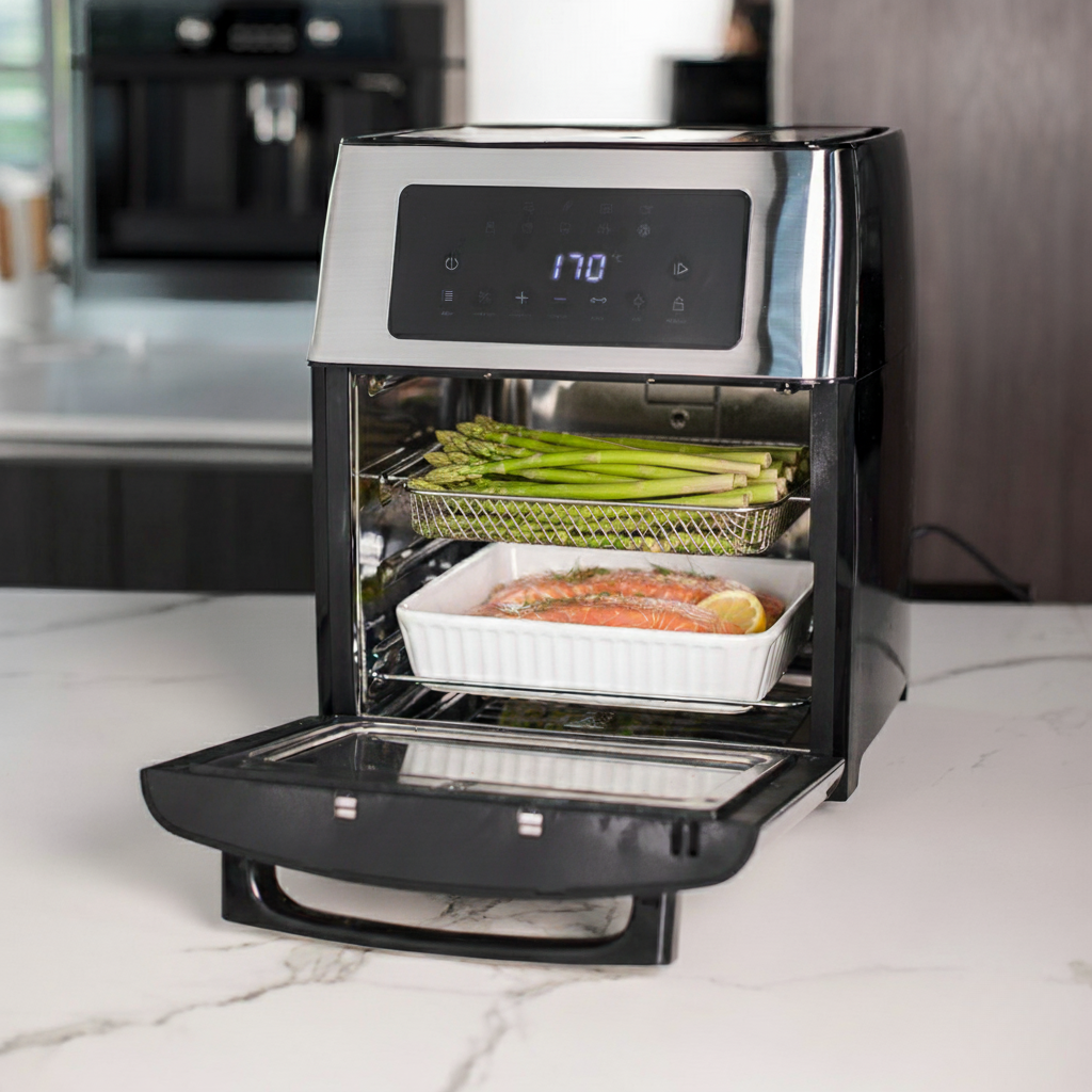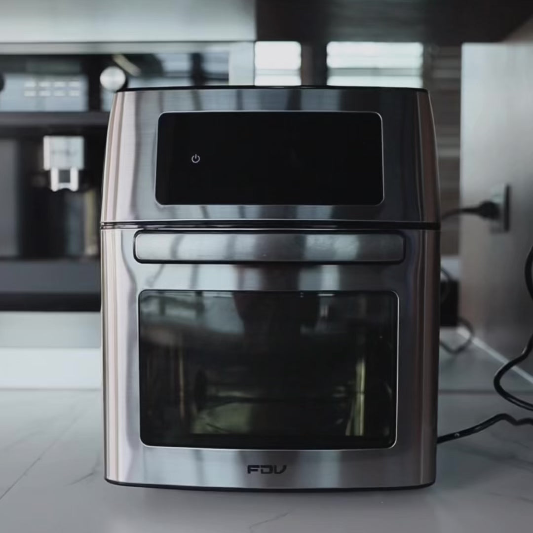 Descubre el Horno Freidora de Aire FDV, la evolución de la cocina inteligente. Con 15 litros de capacidad y control digital, este innovador horno te permite freír, asar, deshidratar y más, todo en un solo lugar. Su elegante diseño en color negro y acero inoxidable, con puerta de doble cristal, se adapta a cualquier cocina.