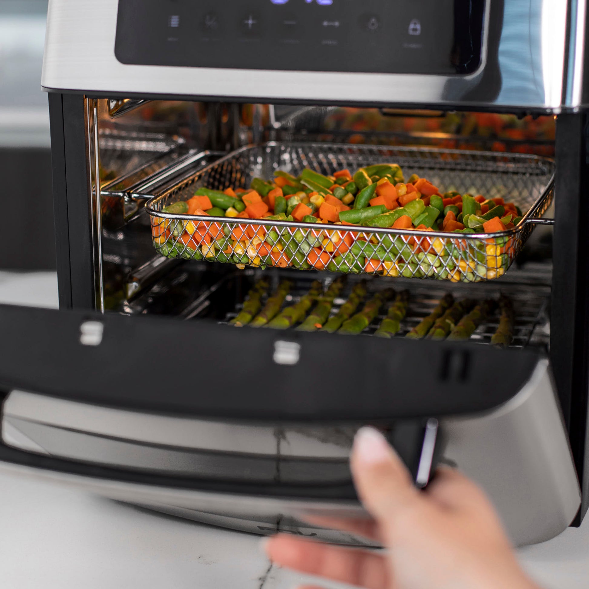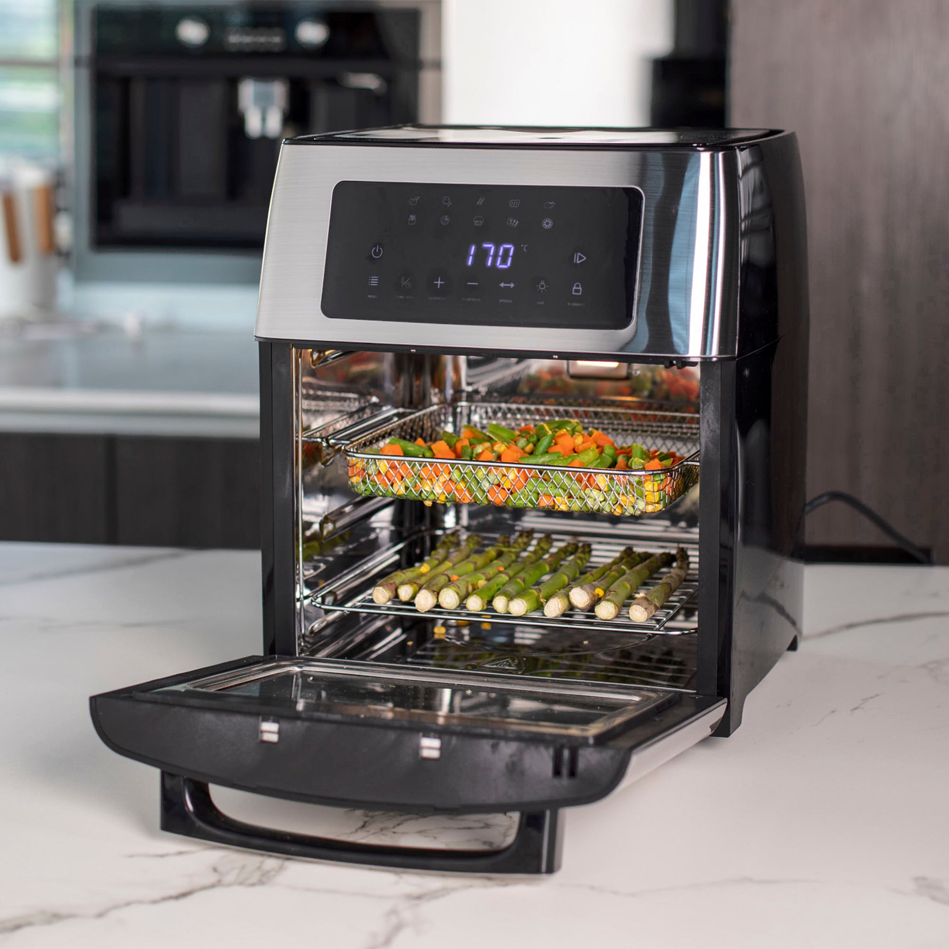 Alcanza temperaturas de 40 a 200°C con un temporizador de hasta 12 horas, perfecto para preparar desde snacks crujientes hasta carnes asadas. Con 10 menús preestablecidos y una variedad de accesorios, como la cesta giratoria y el spiedo para rostizar, cocinar tus recetas favoritas nunca fue tan fácil y saludable.