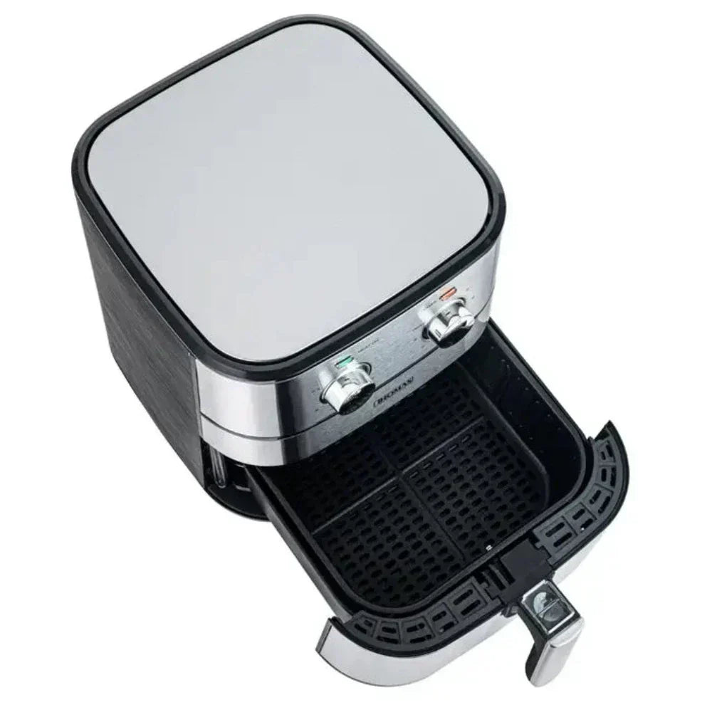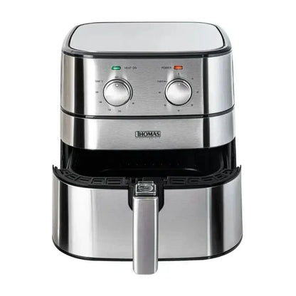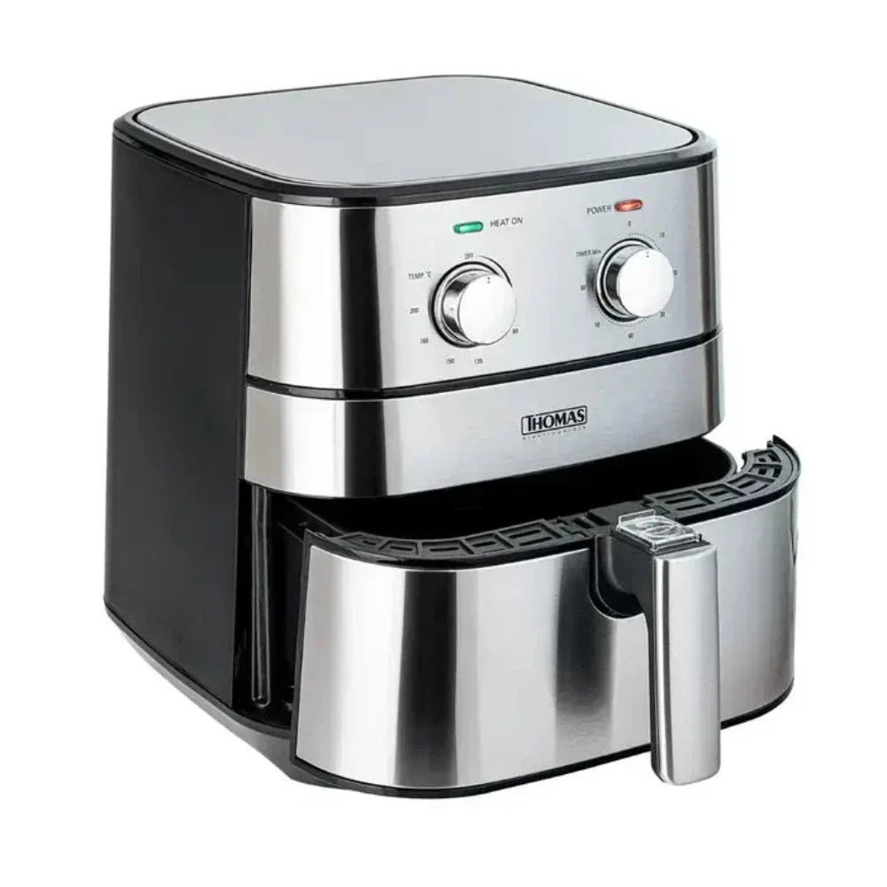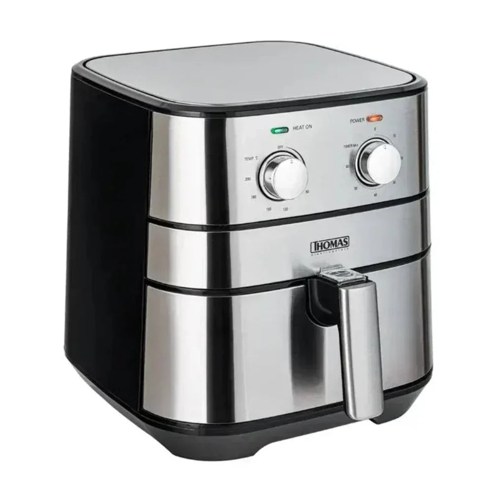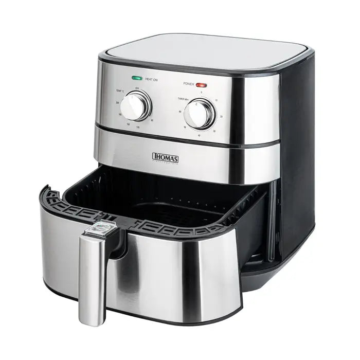 Disfruta de una cocina saludable y deliciosa con la Freidora De Aire TH-AF60Mi de Thomas. Con una potencia de 1700 watts, podrás preparar crujientes papas fritas, carnes asadas y más, sin necesidad de usar aceite. Su panel de control manual y luces indicadoras hacen que sea fácil de usar. Además, su cuerpo de acero inoxidable y mango frío al tacto garantizan seguridad y comodidad. Con capacidad para 5 litros y un sistema antiadherente apto para lavavajillas, es perfecta para preparar cenas familiares. Disfruta de una cocción pareja y uniforme para platos deliciosos sin preocupaciones.