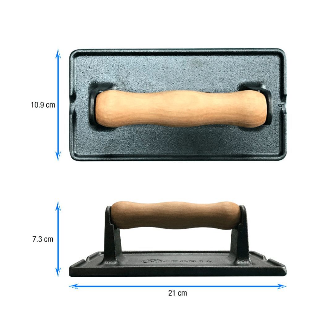 La Grill Press Curado Victoria es la herramienta indispensable para lograr carnes perfectas y crujientes. Ideal para mantener el tamaño de la tocineta, jamón o cualquier embutido durante la cocción, esta prensa de hierro fundido ayuda a eliminar el exceso de grasa, garantizando resultados más saludables y sabrosos. Calienta la prensa directamente sobre la fuente de calor y utilízala para sellar cortes de carne por ambas caras, conservando sus jugos internos y logrando una cocción uniforme. Disfruta de la excepcional distribución y retención del calor del hierro fundido, manteniendo tus alimentos calientes por más tiempo y asegurando un acabado perfecto en cada preparación.