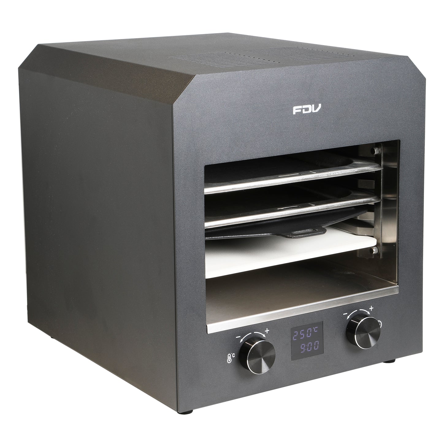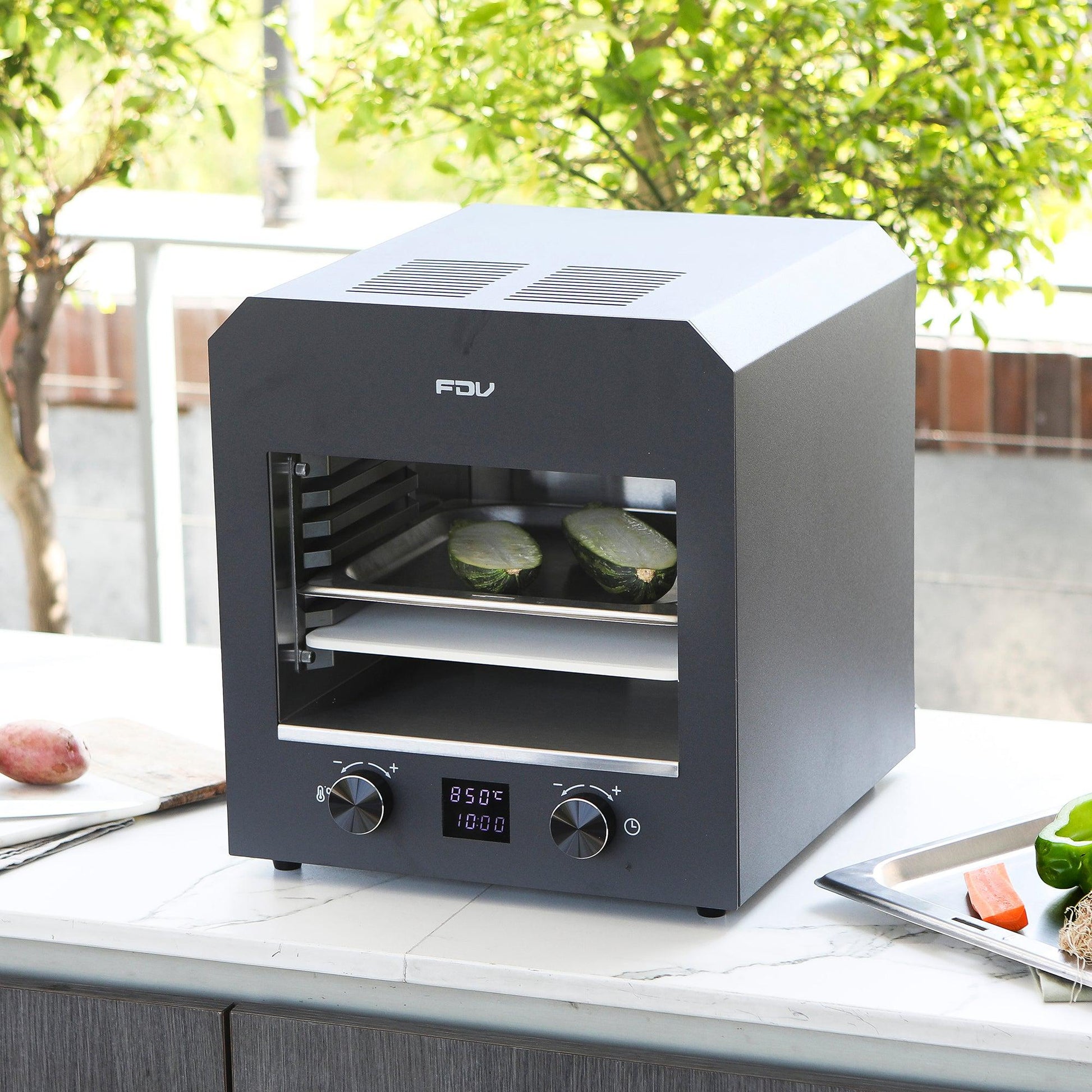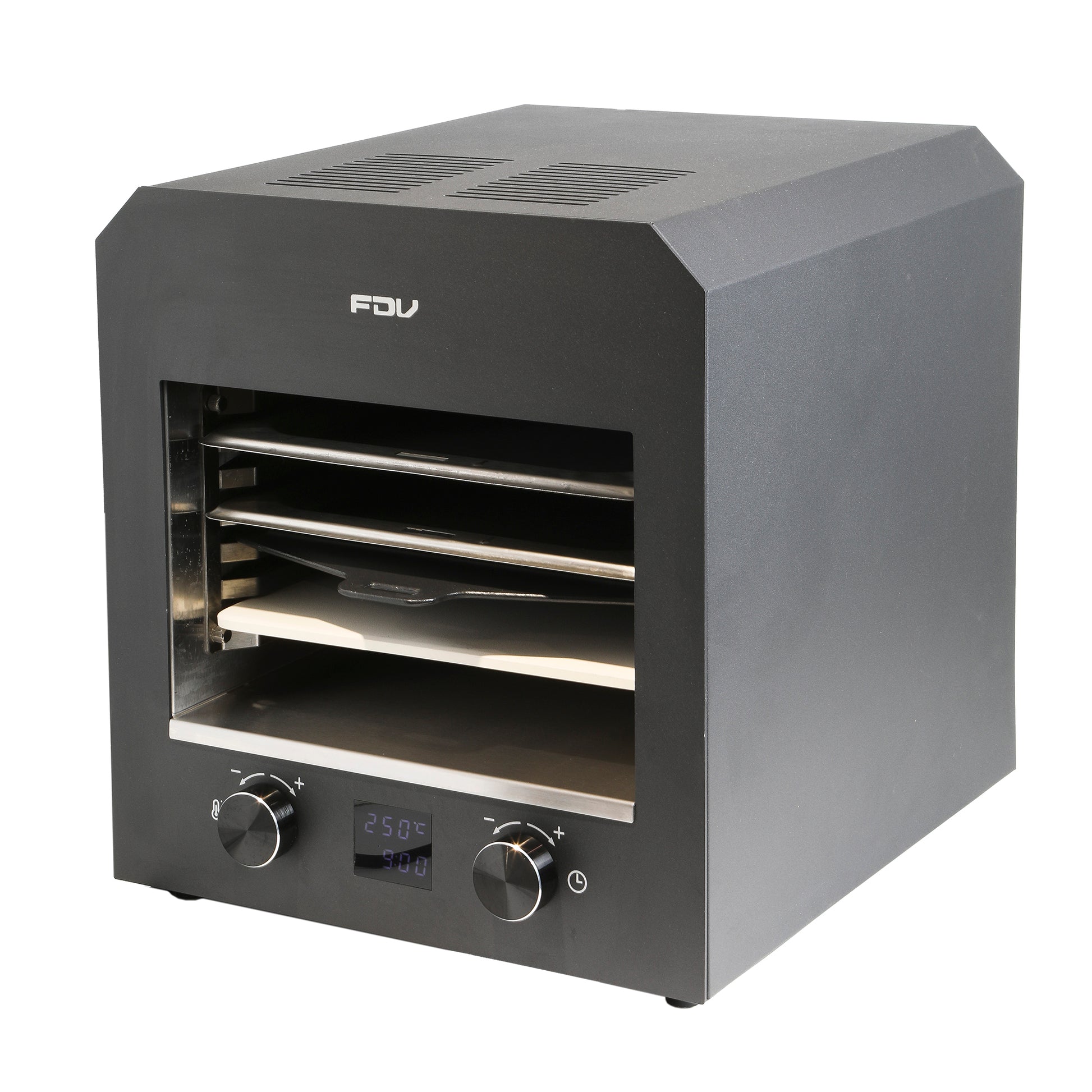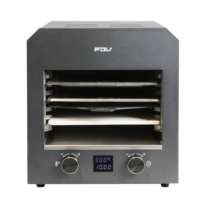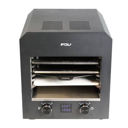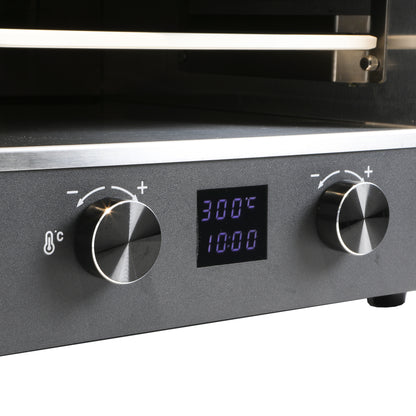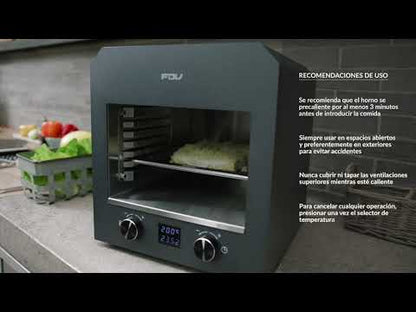 Descubre su rapidez y potencia en un práctico tamaño. Logra cocciones perfectas en minutos gracias a su parrilla de sobremesa con conexión eléctrica. Selecciona la temperatura de forma sencilla, tiempos que desees. Viene con piedra para pizza, 1 bandeja, 1 rejilla, espátula para pizza, manilla removible y guías laterales removibles.
