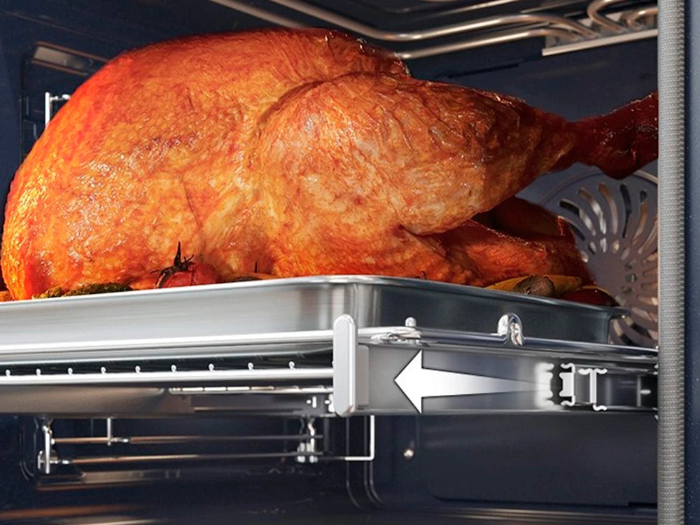 Mete y saca las cosas del horno con mayor facilidad. El riel telescópico se desliza suavemente hacia dentro y hacia fuera sin apenas esfuerzo, incluso si utilizas ollas grandes o pesadas. Como crea mucha menos fricción, facilita la carga y descarga. Así, podrás rociar, voltear y sazonar los alimentos sin preocuparte por los derrames.