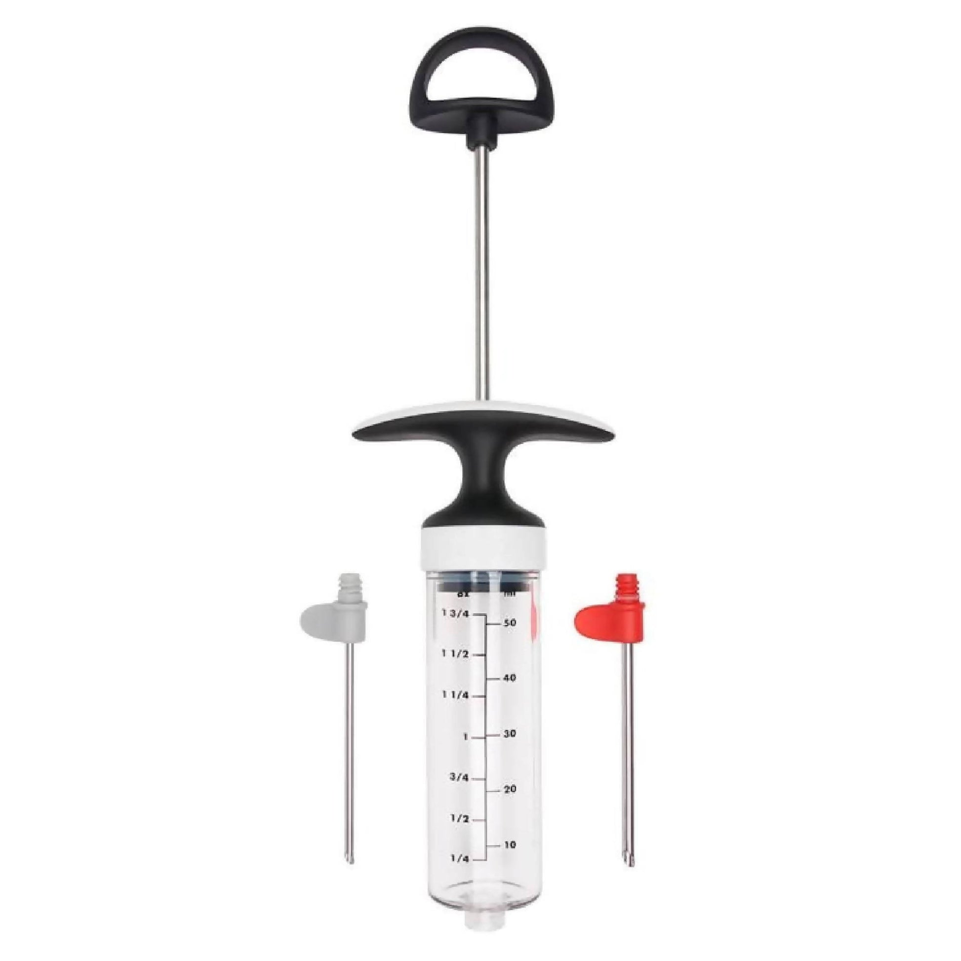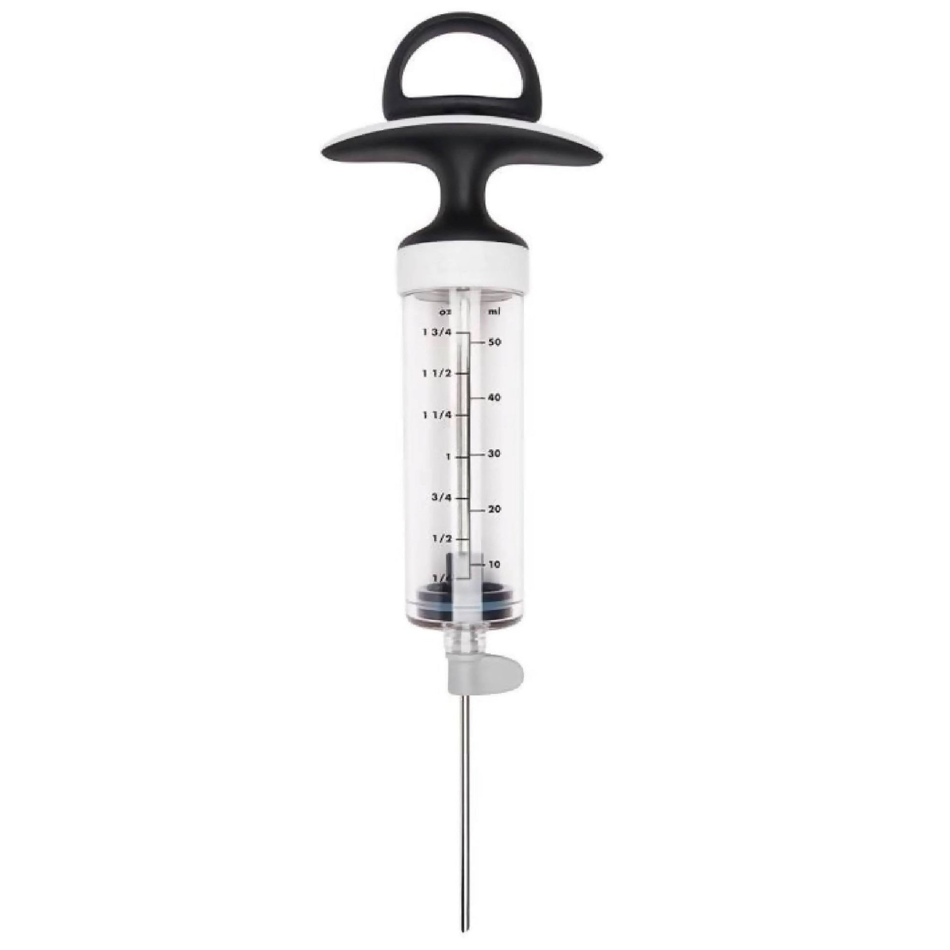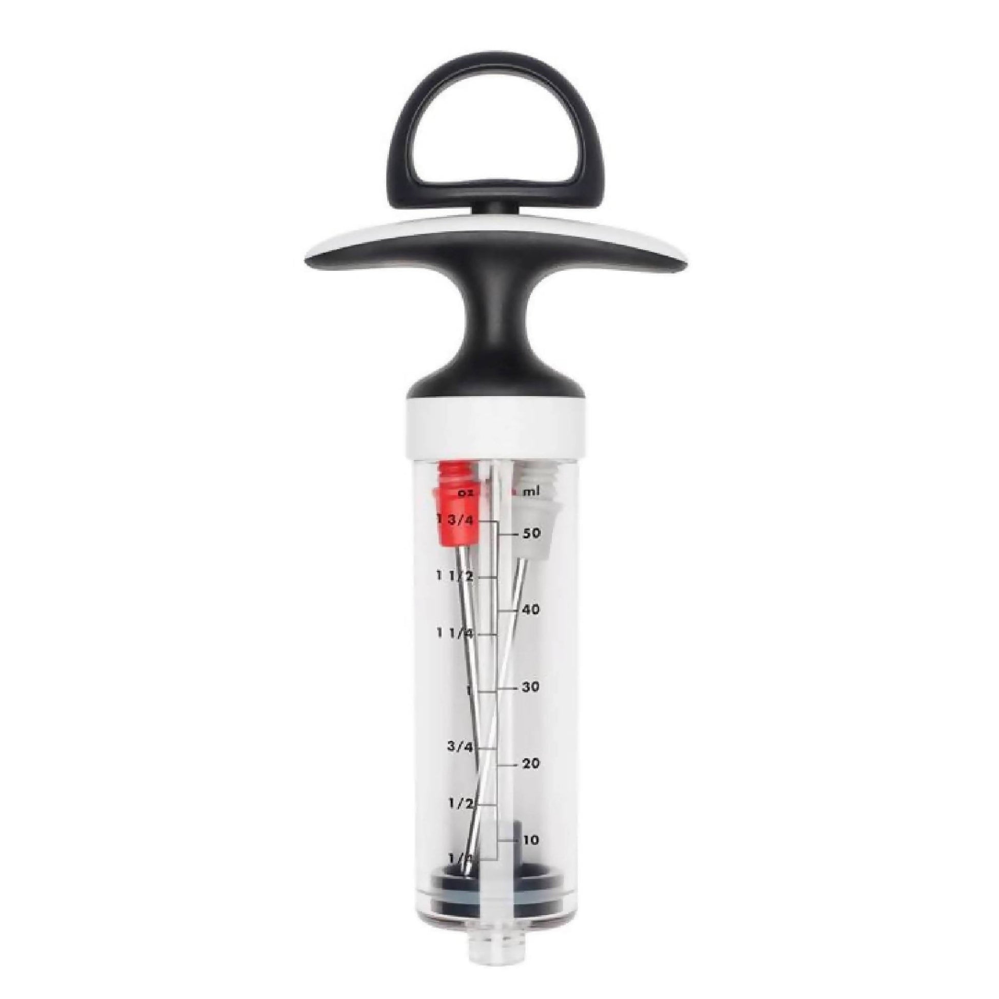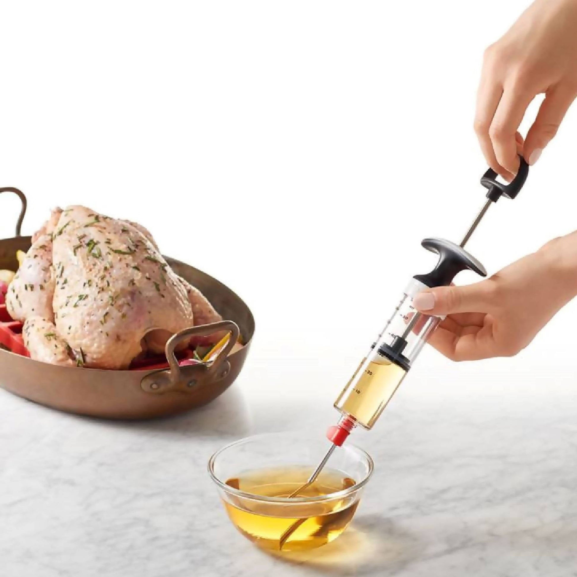 La Jeringa/Inyector de Marinado Oxo es perfecta para inyectar deliciosos marinados al interior de tu pollo, carne o pavo agregándoles mucho sabor. Simplemente rellena la jeringa con el marinado que elijas e inyectála directo al interior de tu carne. La jeringa tiene una capacidad de 60ml e incluye 2 agujas de acero inoxidable: una gruesa para marinados más densos y una delgada para marinados más líquidos. Además, ambas agujas tienen una corta gota para detener el flujo del marinado. Es de fácil agarre y se desarma por completo para lavarla.