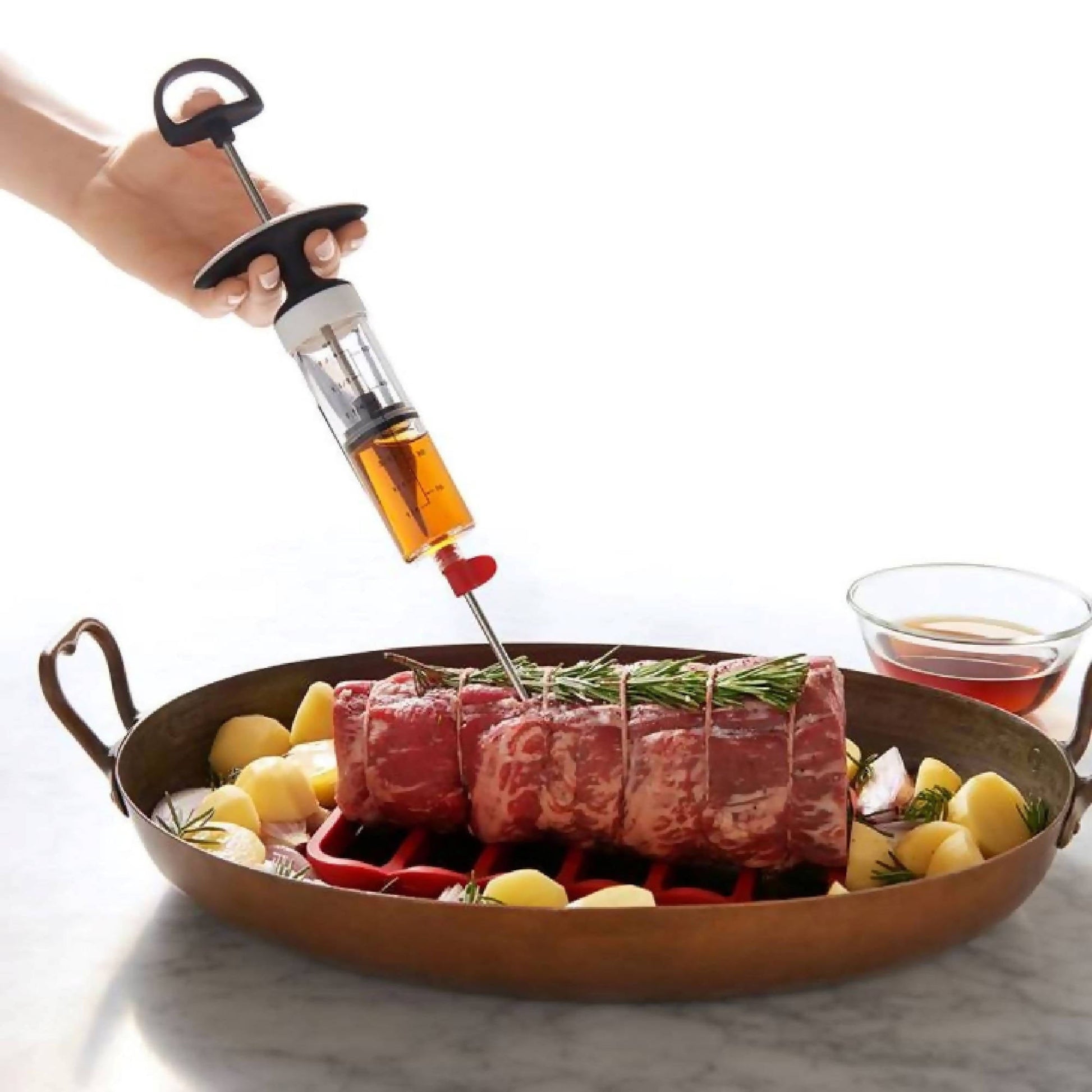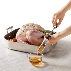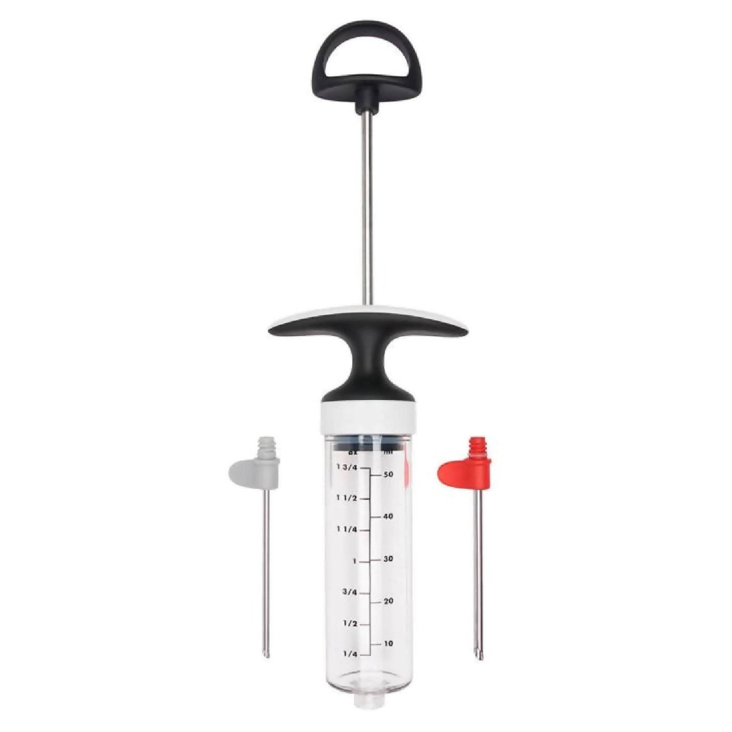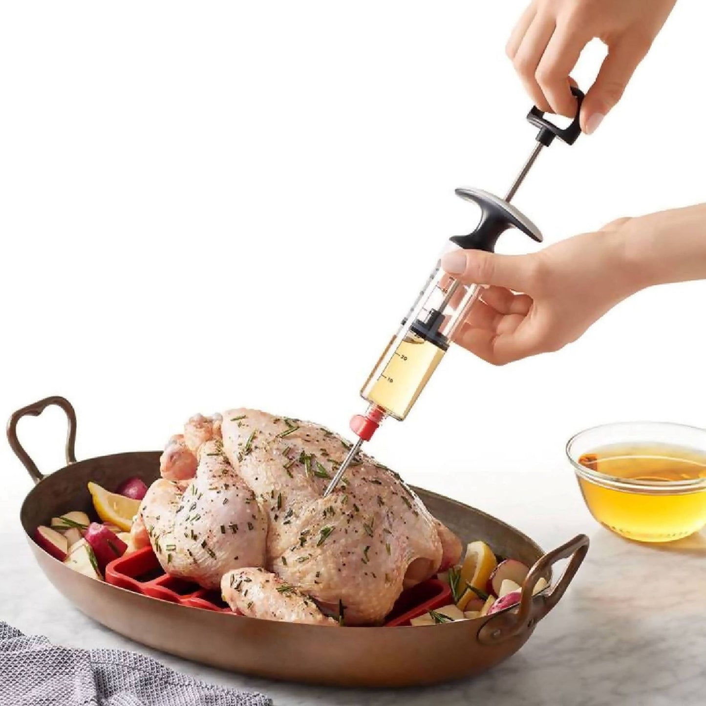 La Jeringa/Inyector de Marinado Oxo es perfecta para inyectar deliciosos marinados al interior de tu pollo, carne o pavo agregándoles mucho sabor. Simplemente rellena la jeringa con el marinado que elijas e inyectála directo al interior de tu carne. La jeringa tiene una capacidad de 60ml e incluye 2 agujas de acero inoxidable: una gruesa para marinados más densos y una delgada para marinados más líquidos. Además, ambas agujas tienen una corta gota para detener el flujo del marinado. Es de fácil agarre y se desarma por completo para lavarla.
