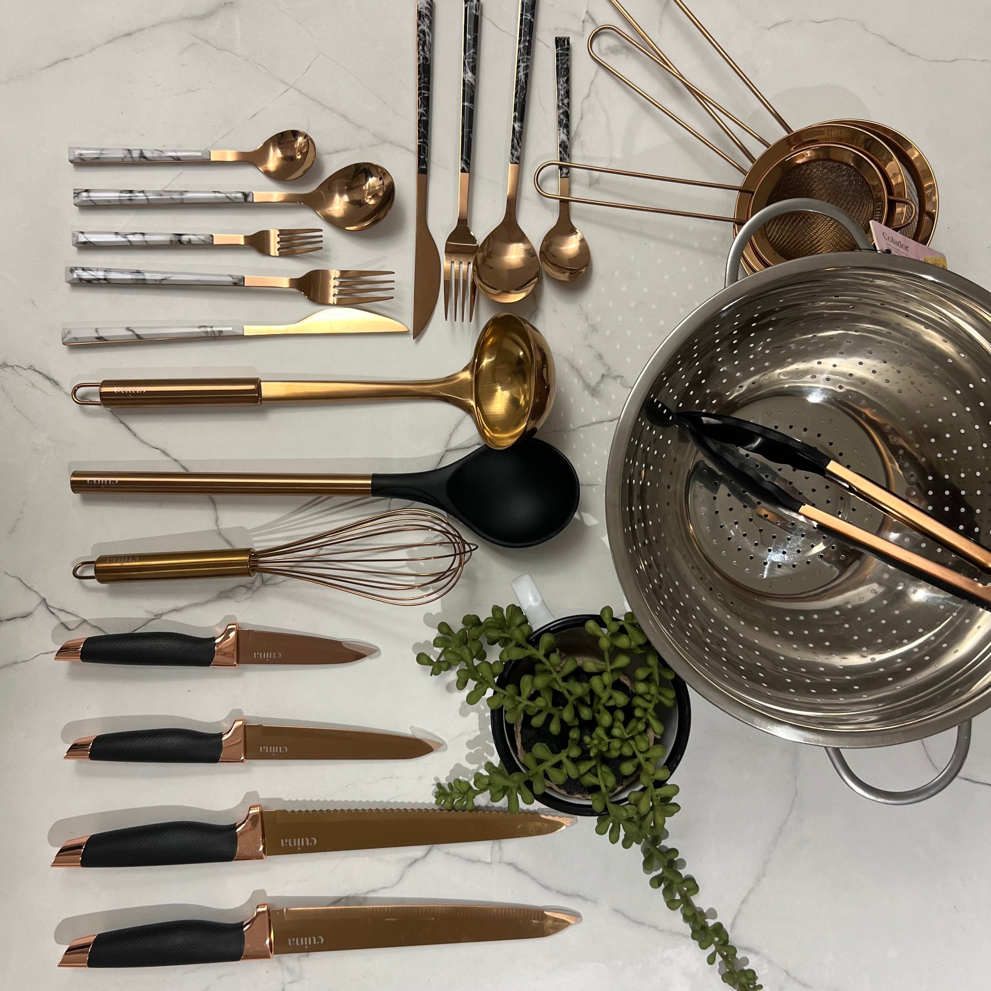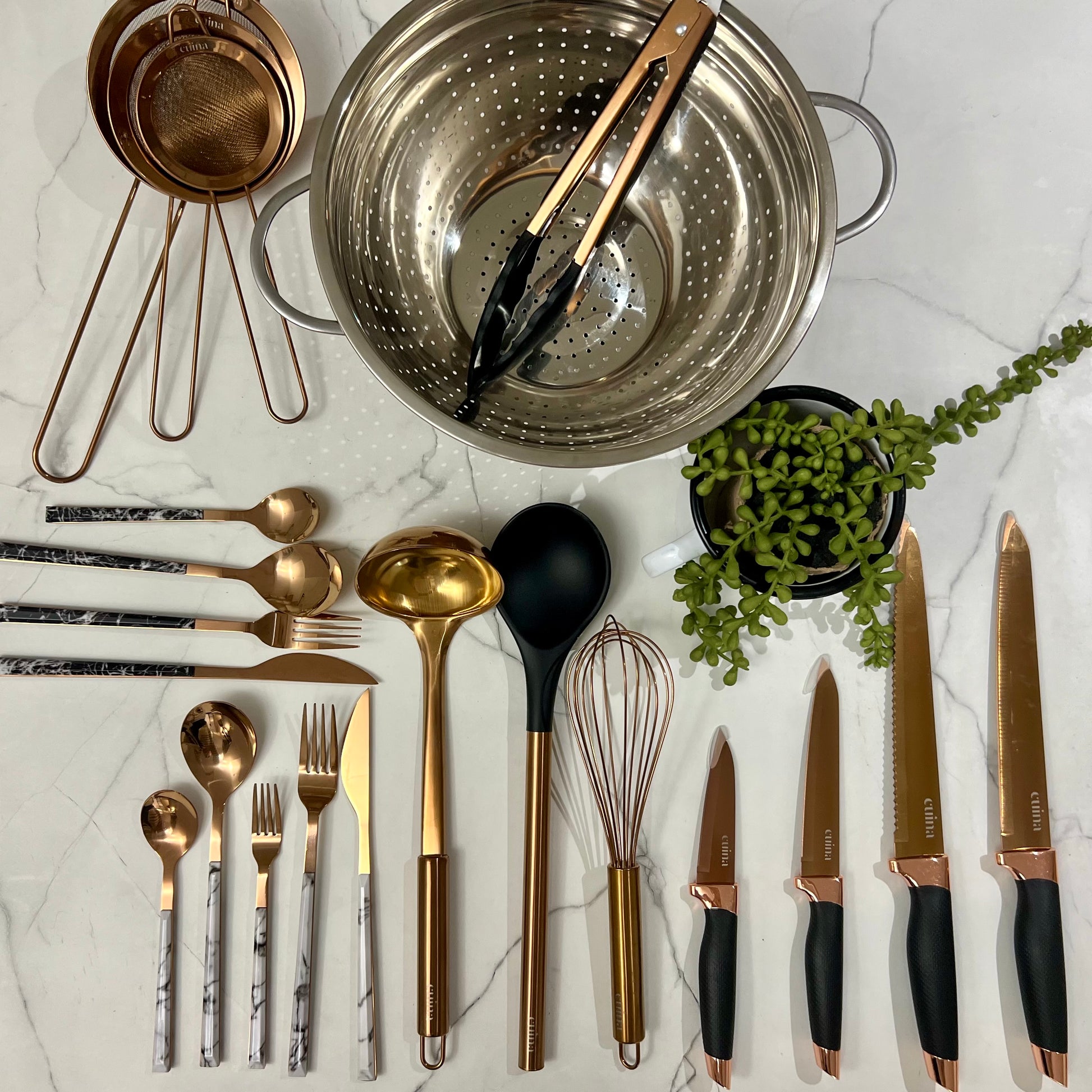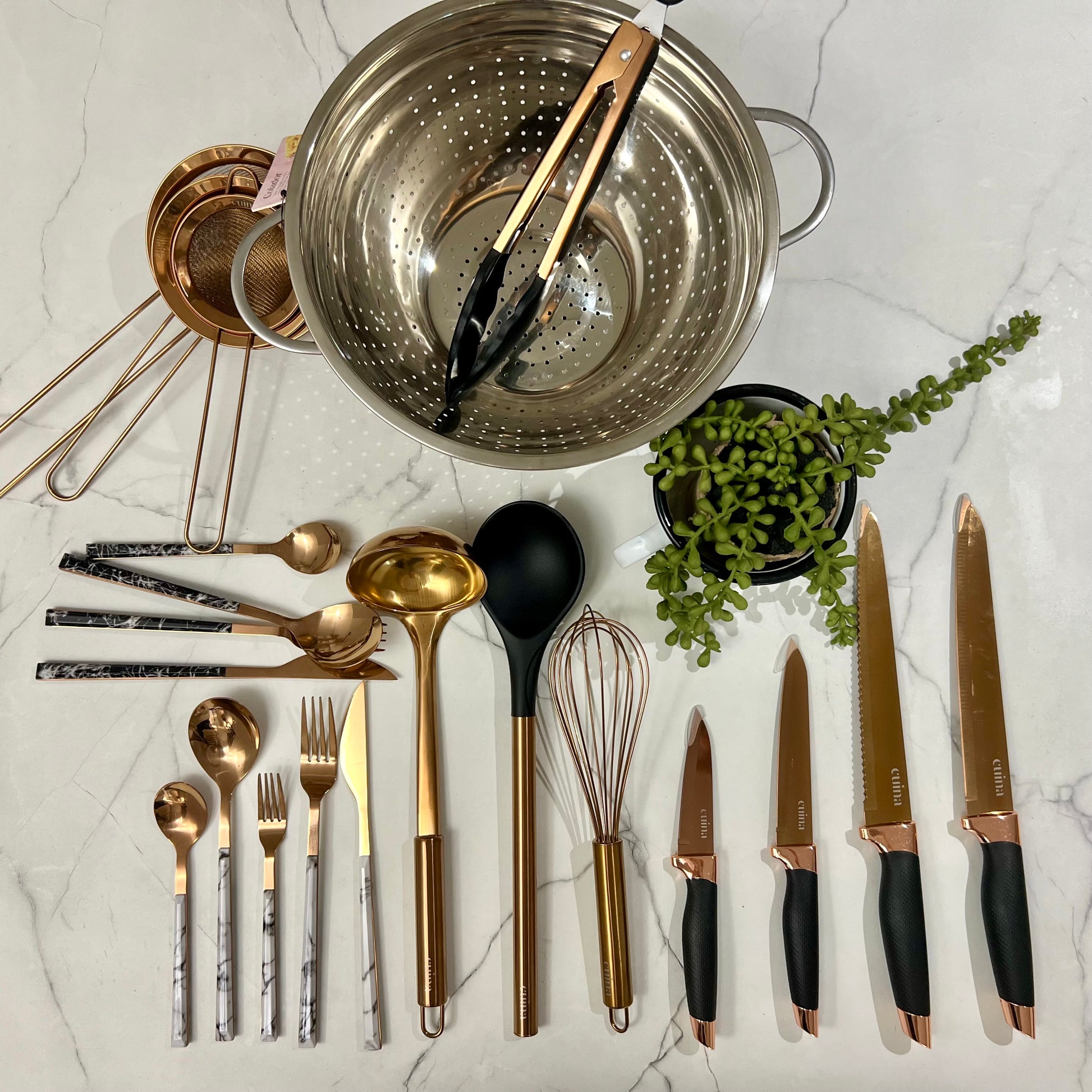 El Juego de 8 utensilios y mesa Cuina es la opción perfecta para renovar tu cocina con elementos de alta calidad y diseño ergonómico. A diferencia de los utensilios comunes, los productos Cuina están elaborados con materiales premium como mármol, cobre y acero inoxidable, asegurando durabilidad y un uso prolongado. Este set incluye un set de 4 cuchillos, un cucharón con punta de silicona, un set de 3 coladores, un colador frutero, una pinza, un set de 16 cubiertos de mármol oscuro, un cucharón de acero y un batidor. No incluye rallador, espátula ni mezquino. Con acabados de primera, este conjunto no solo es funcional, sino también un complemento estético para tu mesa.