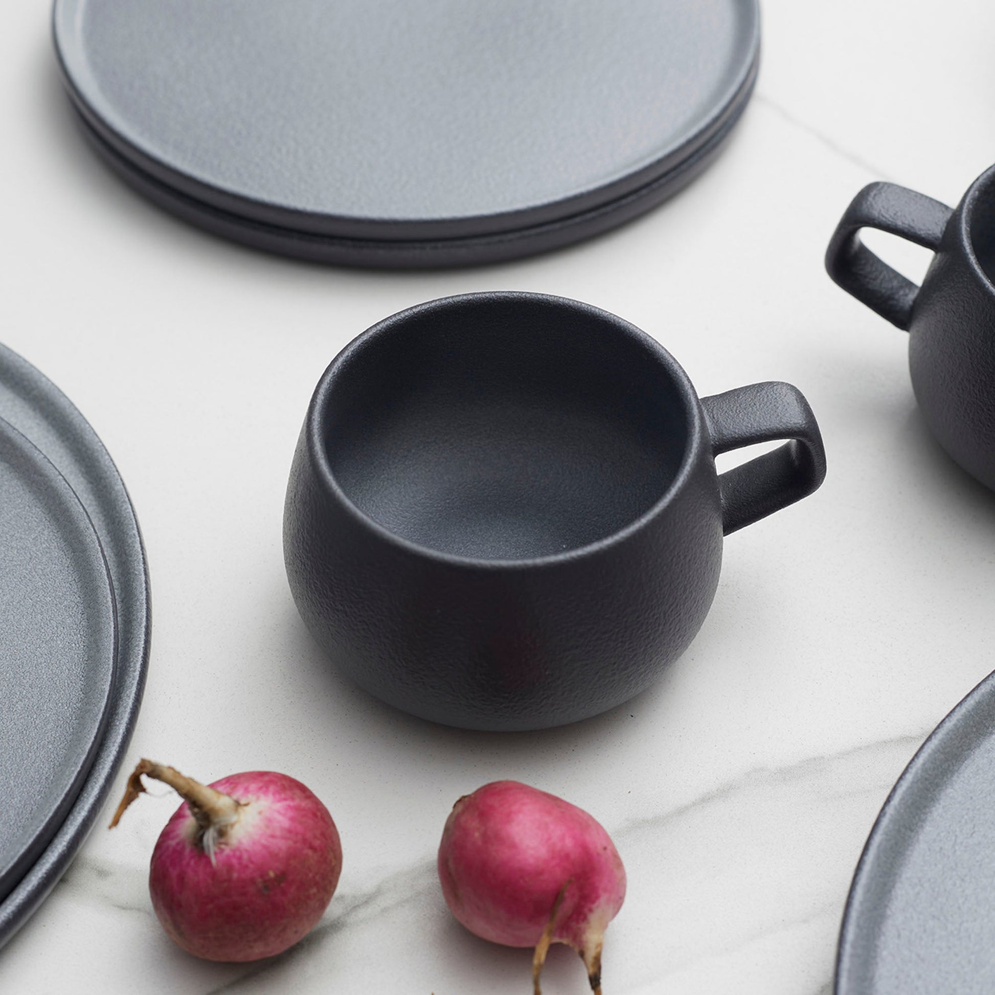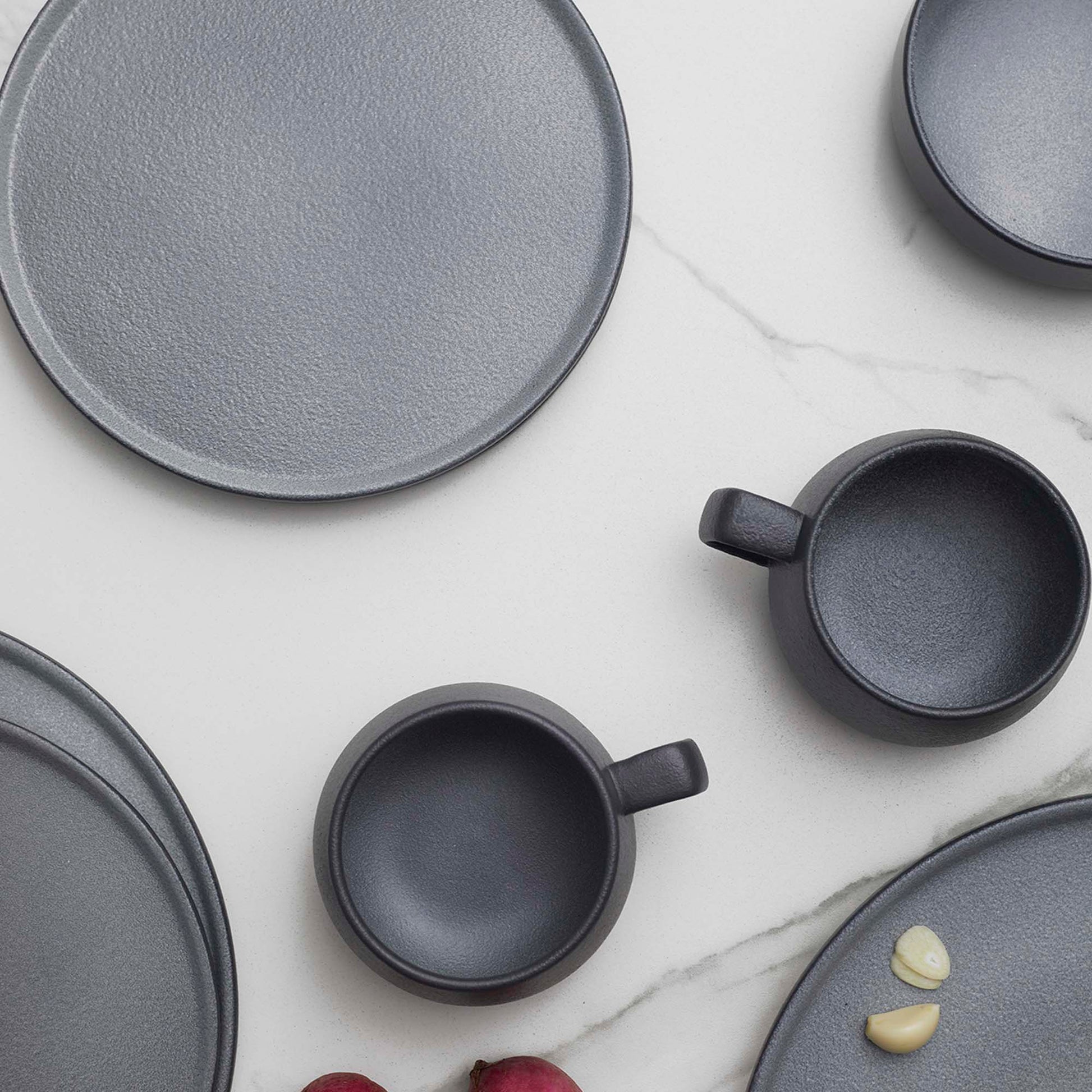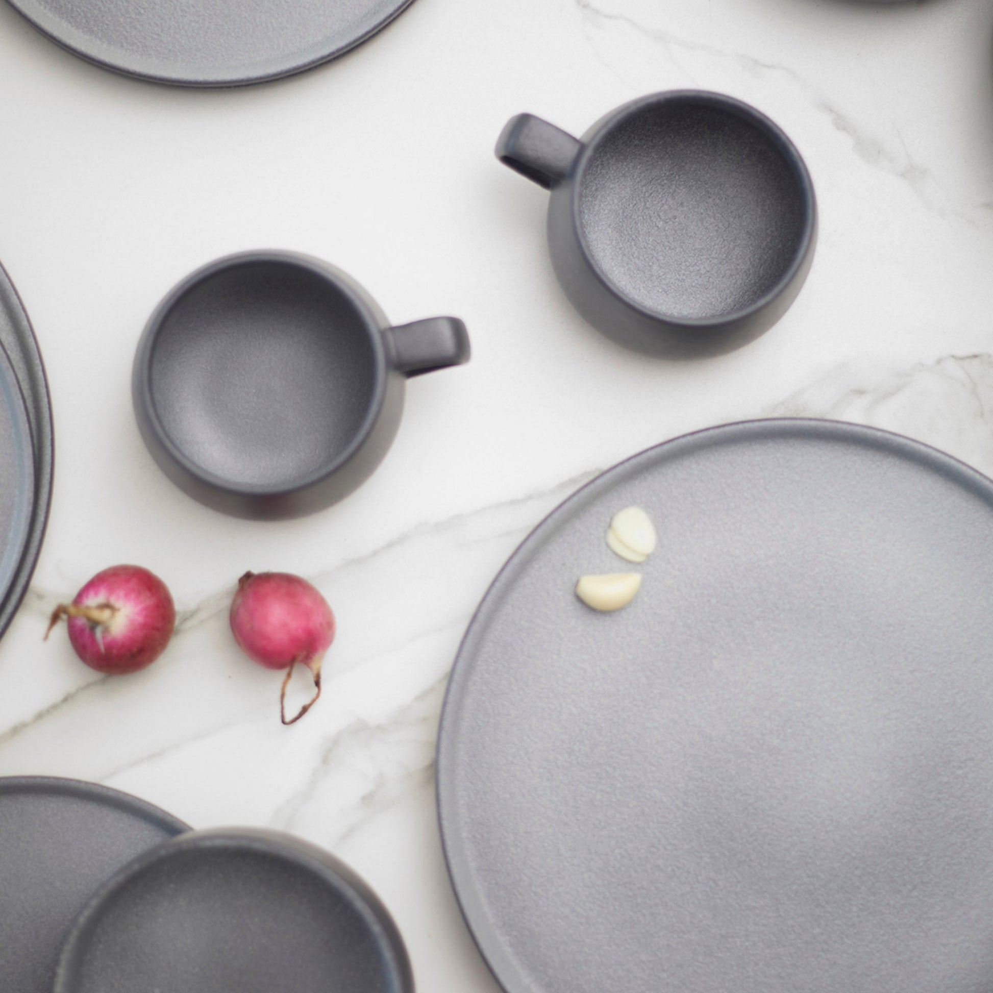 Hecha de porcelana de alta resistencia, sometida a una cocción a alta temperatura (1250°C), con esmalte libre de plomo y cadmio en tono gris mate. Destaca su durabilidad y soporte a cambios de temperatura sin problemas.