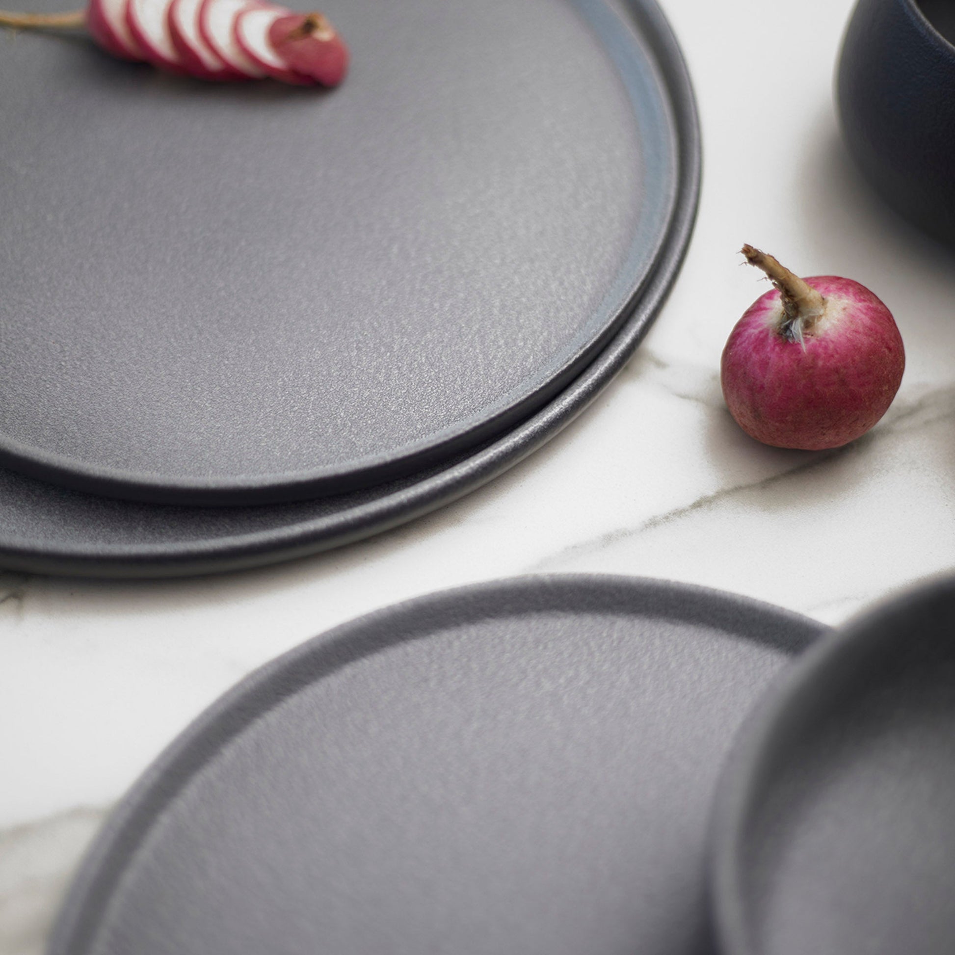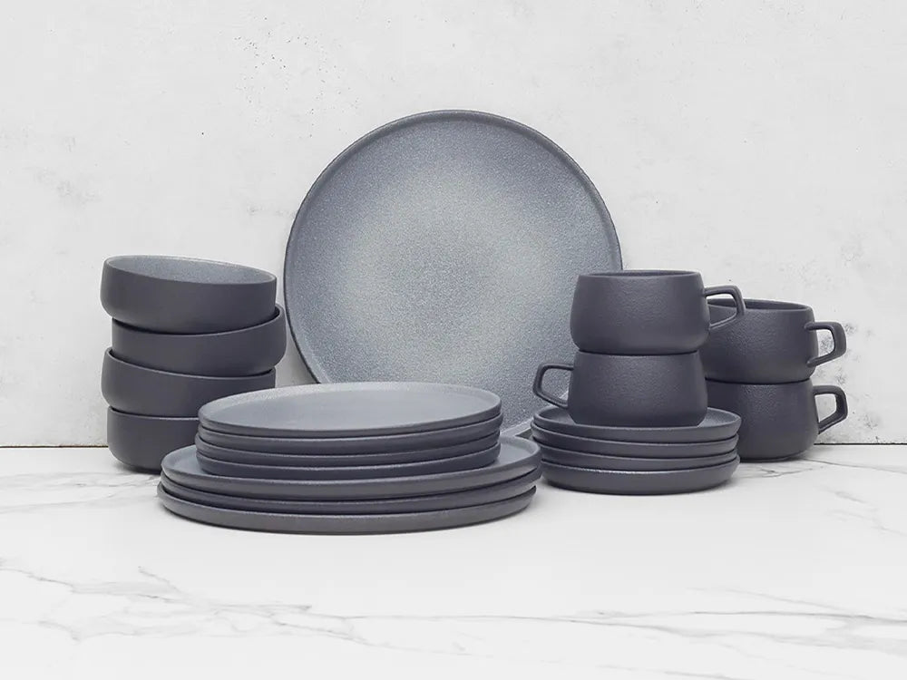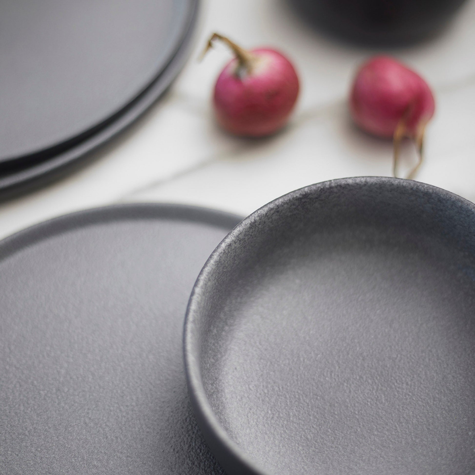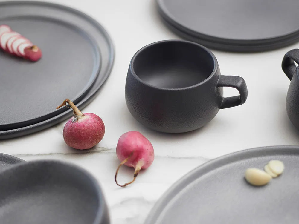 Hecha de porcelana de alta resistencia, sometida a una cocción a alta temperatura (1250°C), con esmalte libre de plomo y cadmio en tono gris mate. Destaca su durabilidad y soporte a cambios de temperatura sin problemas.