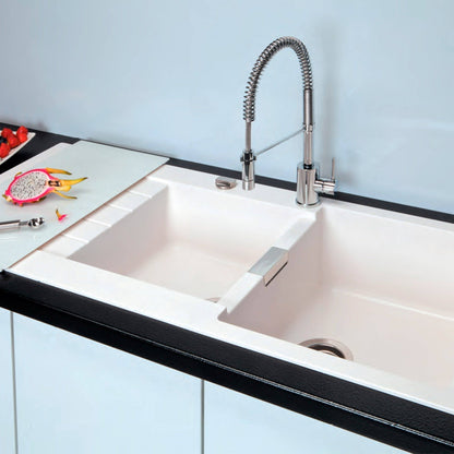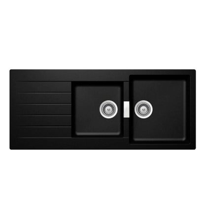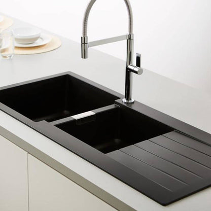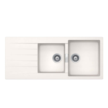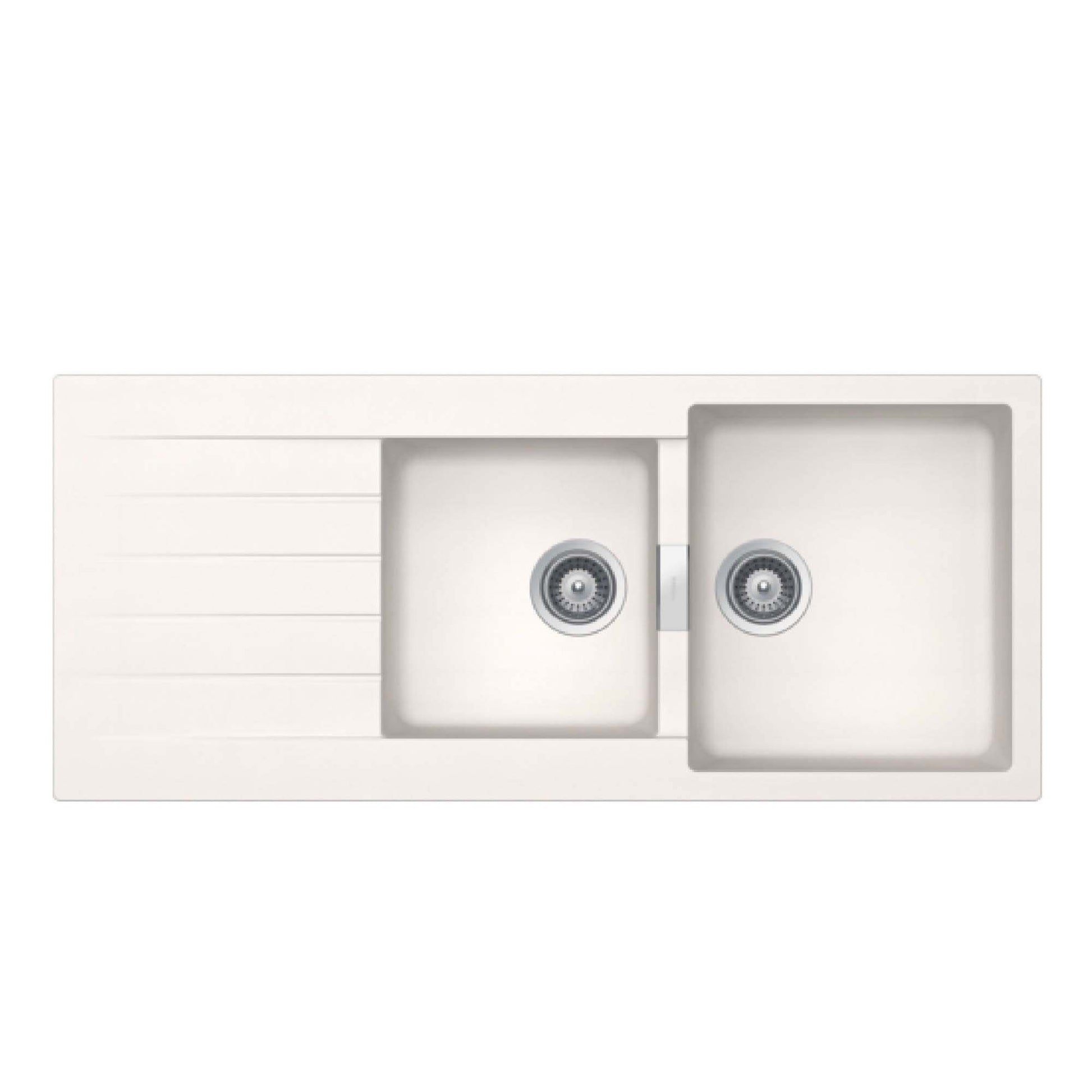 Lavaplatos de 2 cubas con escurridor, su composición es de 80% de cuarzo, 20% resina acrílica entregando una superficie de alta resistencia a impactos, repelente a la suciedad, a prueba de calor y pro higénico (superficie antibacterial). La instalación puede ser sobre o bajo cubierta e incluye accesorios de acero inoxidable como canastillo, copa de drenaje, tapa de rebalse, no incluye sifón. Fabricado en Alemania.
