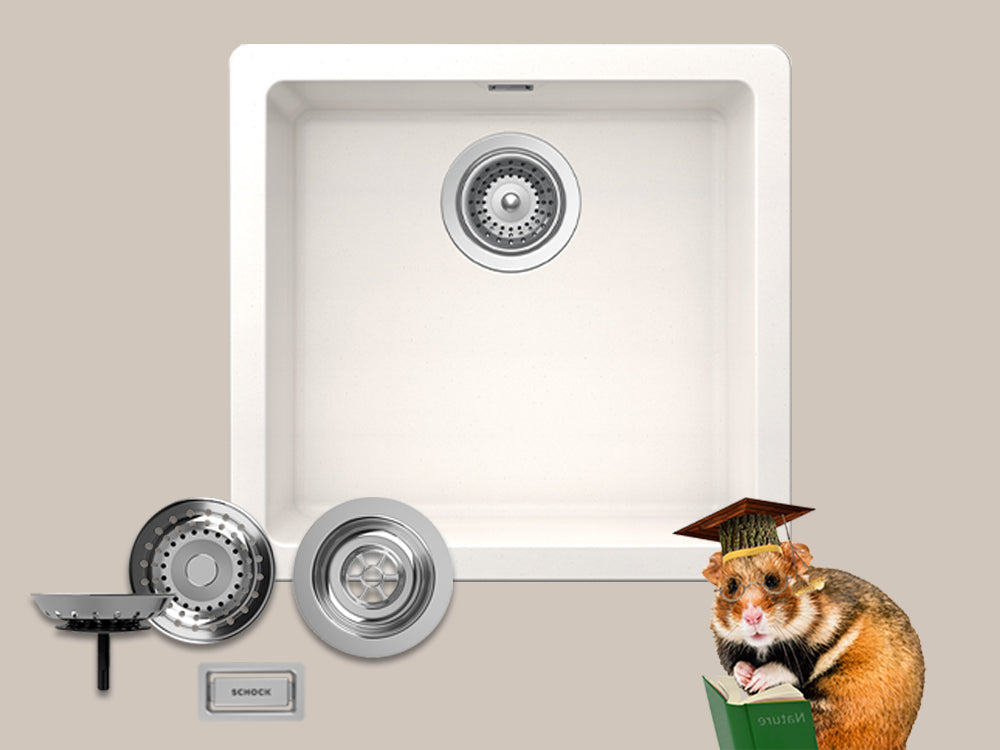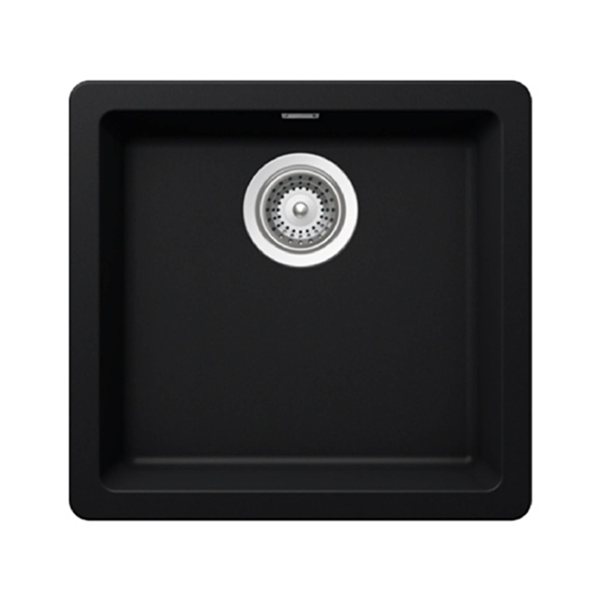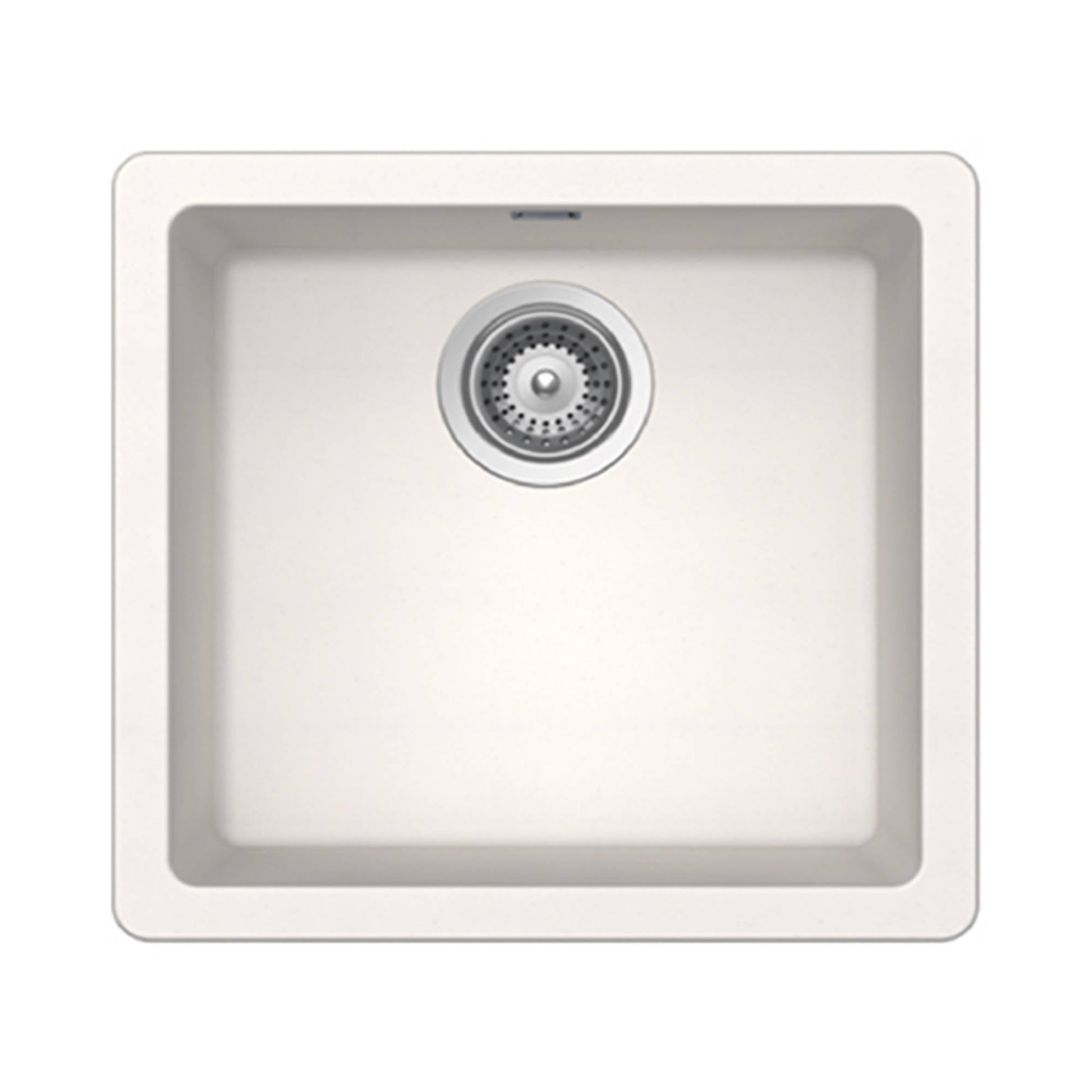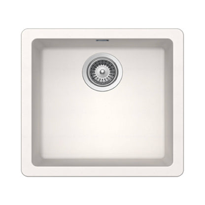Lavaplatos de 1 cuba sin escurridor, su composición es de 80% de cuarzo, 20% resina acrílica entregando una superficie de alta resistencia a impactos, repelente a la suciedad, a prueba de calor y pro higénico (superficie antibacterial). La instalación puede ser sobre o bajo cubierta e incluye accesorios de acero inoxidable como canastillo, copa de drenaje, tapa de rebalse, no incluye sifón. Fabricado en Alemania.