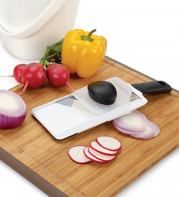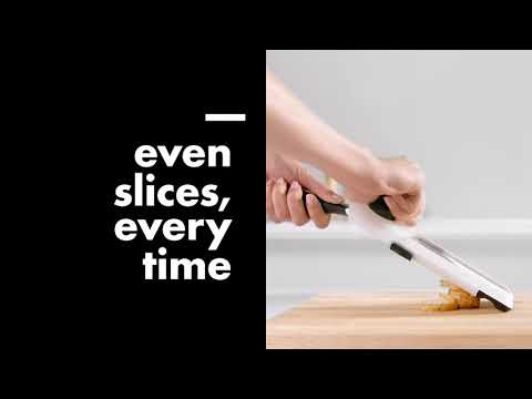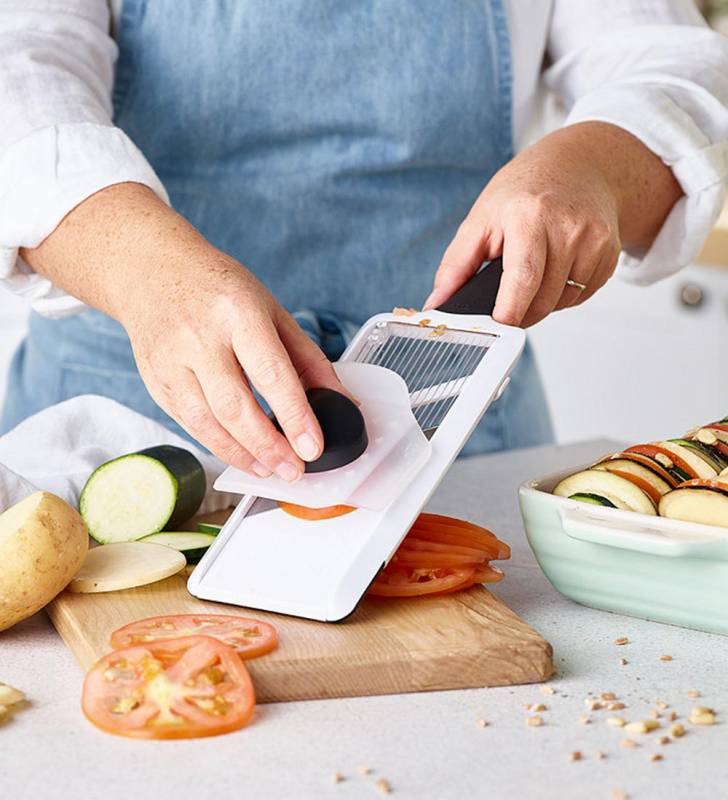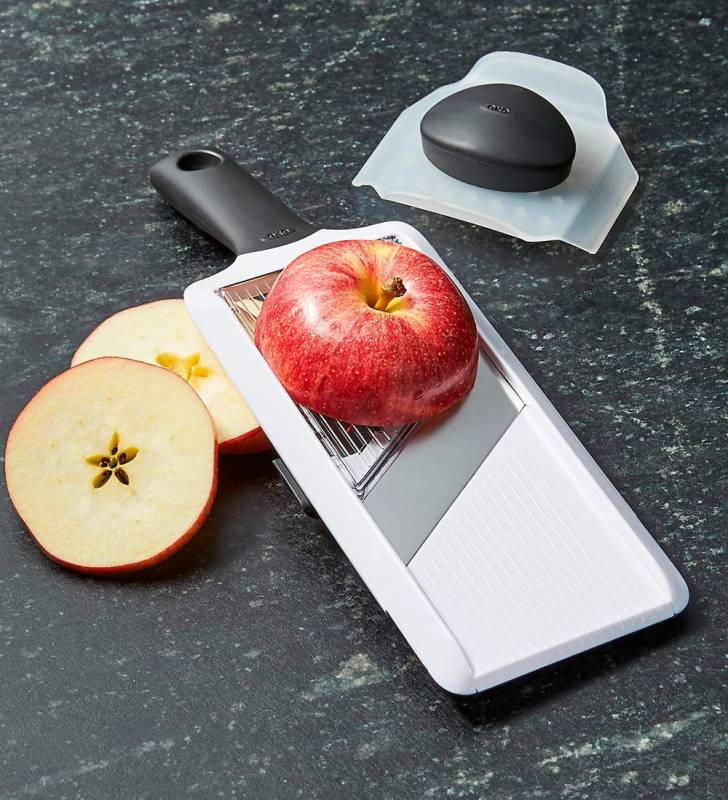 La Mandolina Manual de Oxo sirve para preparar exquisitos platos, es ideal para verduras. Incluye un ajustador de grosor: 1mm, 2,5mm o 4mm y un soporte de protección para tus manos. Sólo debes deslizar la cuchilla de acero inoxidable para obtener rodajas uniformes y perfectas.
