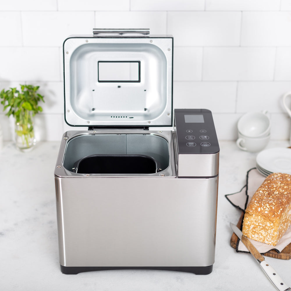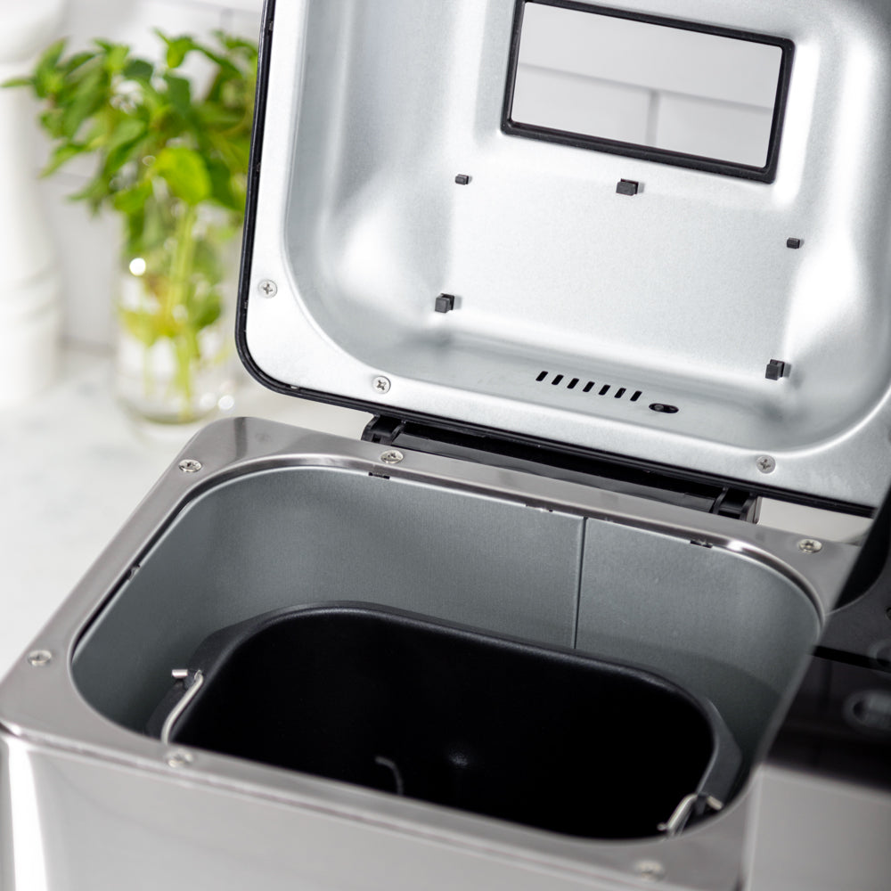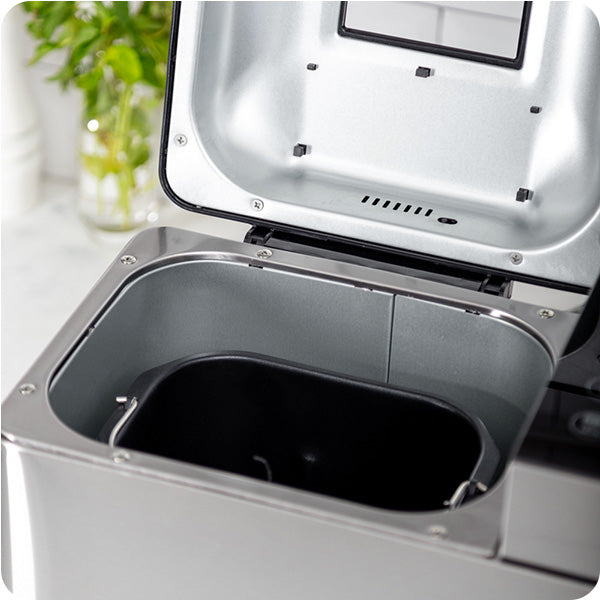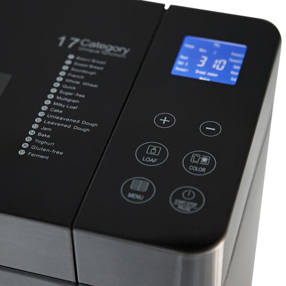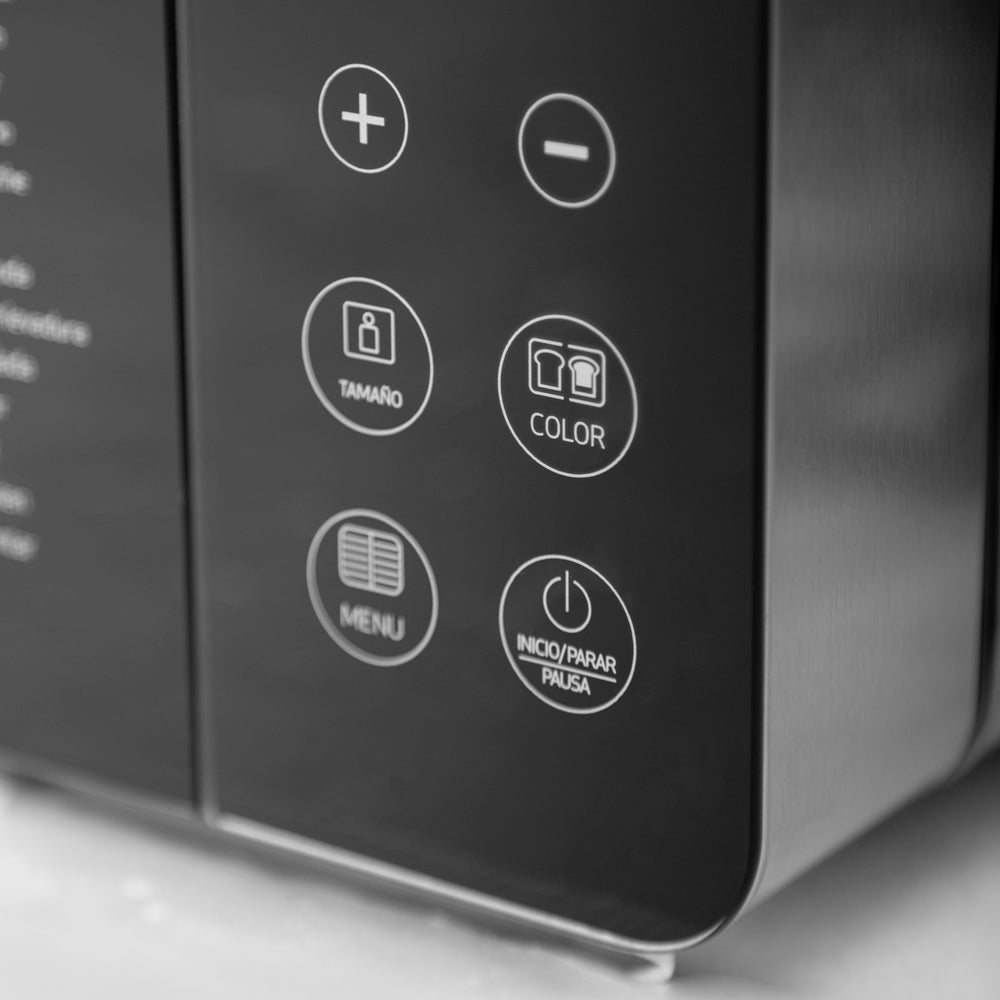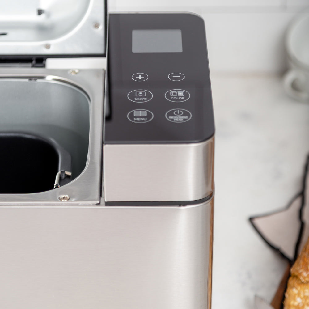 • Características Especiales Pantalla LCD Dispensador de frutos secos, 17 Programas automáticas, Pan dulce, Integral, Multigrano, Sin gluten, entre otros y también puedes hacer tortas, Mermeladas, Yogurt, 3 Tamaños de pan, 3 Niveles de tostado superior, Temporizador, Función pausa y mantener caliente, Control de corteza ajustable, Recipiente antiadherente extraíble para una fácil limpieza, y Función "Keep Warm" de 60 minutos