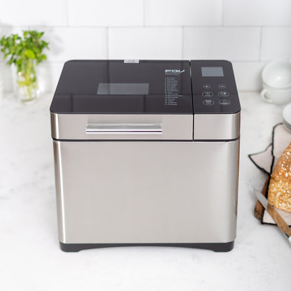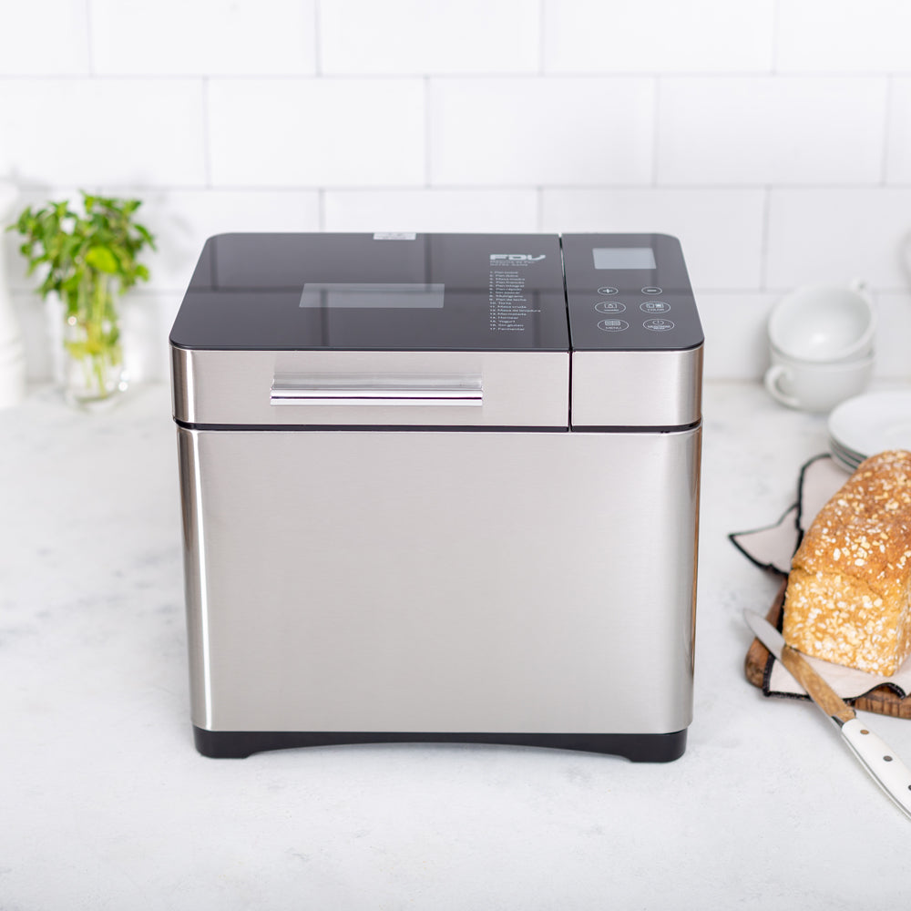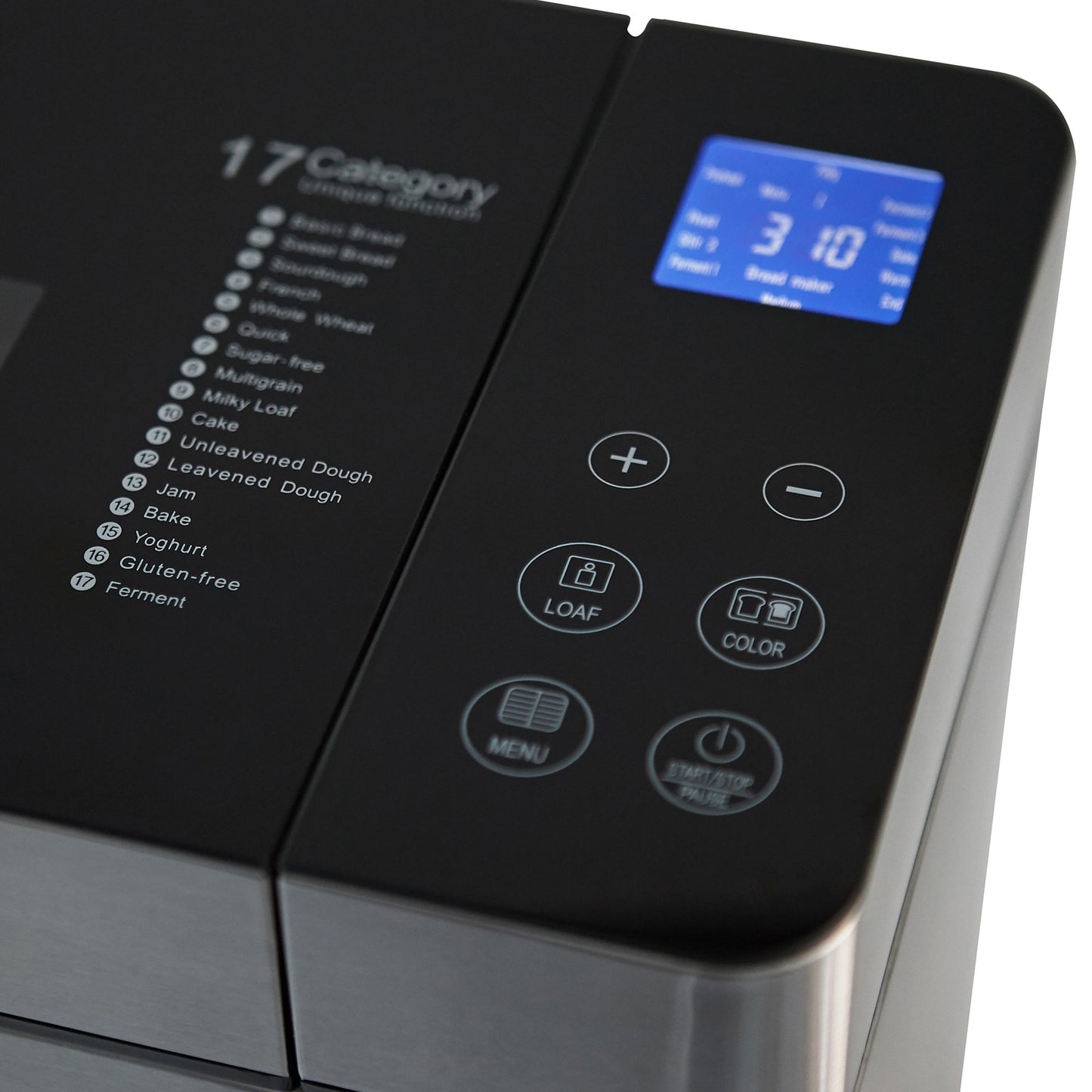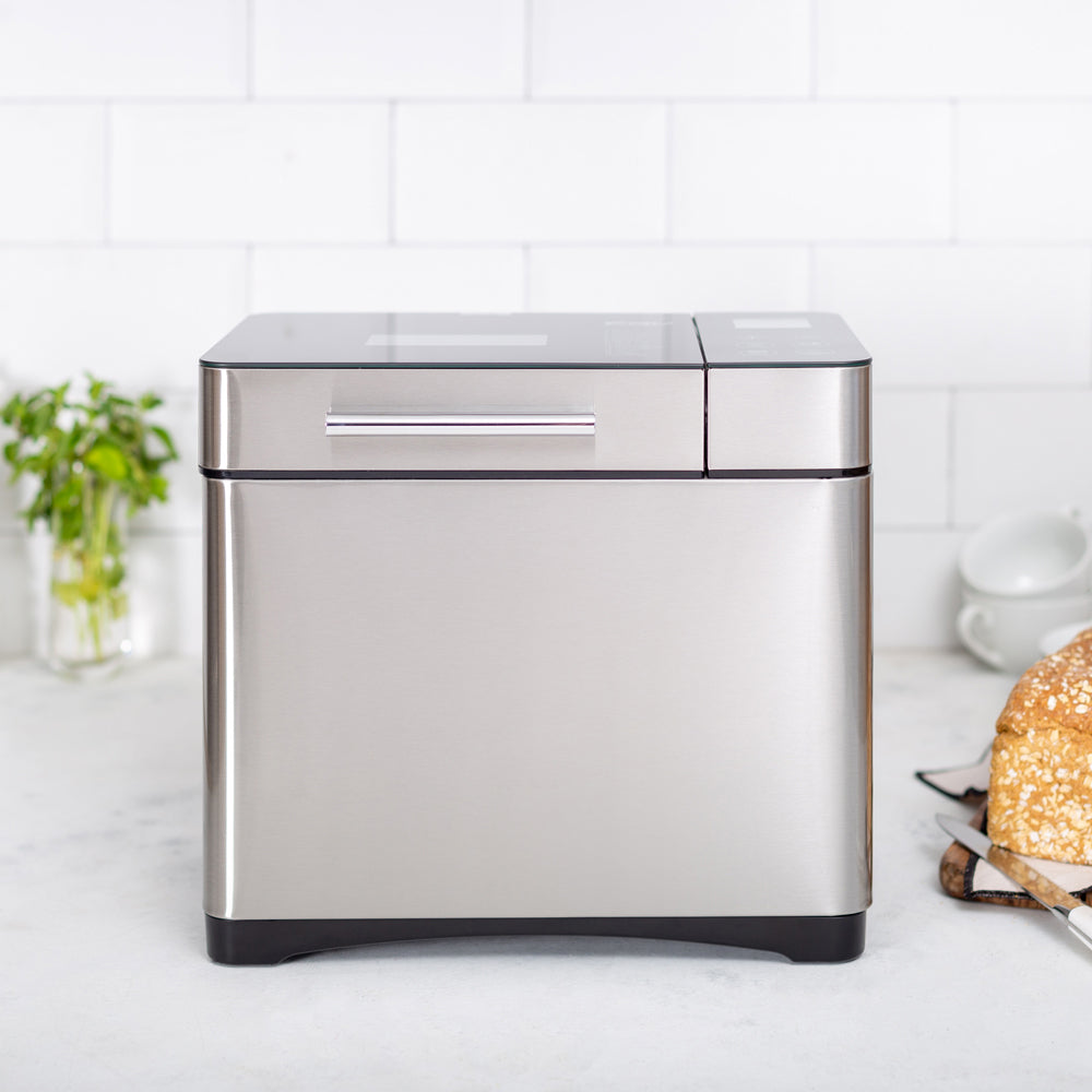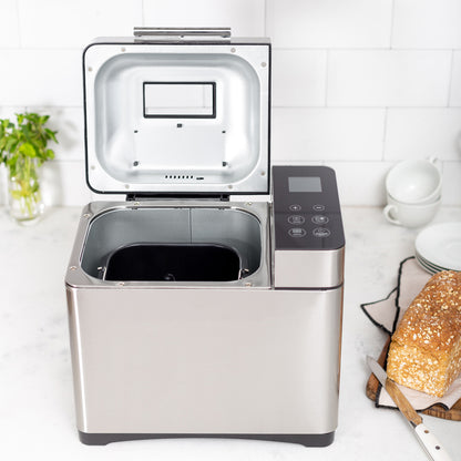 • Características Especiales Pantalla LCD Dispensador de frutos secos, 17 Programas automáticas, Pan dulce, Integral, Multigrano, Sin gluten, entre otros y también puedes hacer tortas, Mermeladas, Yogurt, 3 Tamaños de pan, 3 Niveles de tostado superior, Temporizador, Función pausa y mantener caliente, Control de corteza ajustable, Recipiente antiadherente extraíble para una fácil limpieza, y Función "Keep Warm" de 60 minutos
