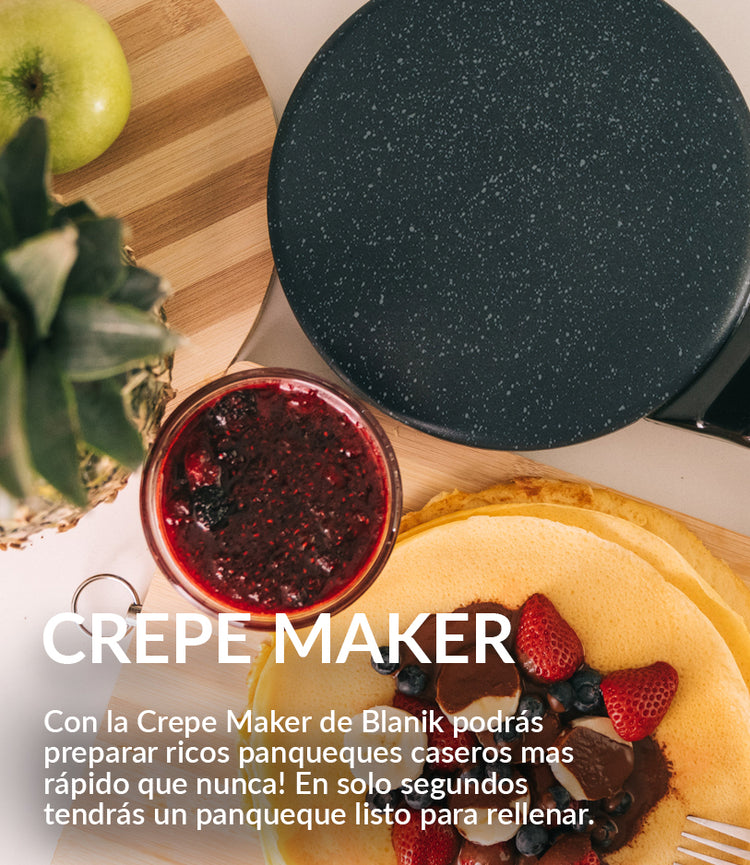 • Características Especiales Recubrimiento céramico más sano, resistente y fácil de limpiar inmersión de la superficie en la mezcla, no necesita aceite gracias a su superficie con teflón antiadherente, tiempo de preparación un panqueque cada 20 segundos, panqueques de 20 cms. Diámetro, diseño compacto y elegante, fácil limpieza y funcionamiento, y incluye recipiente para mezcla.