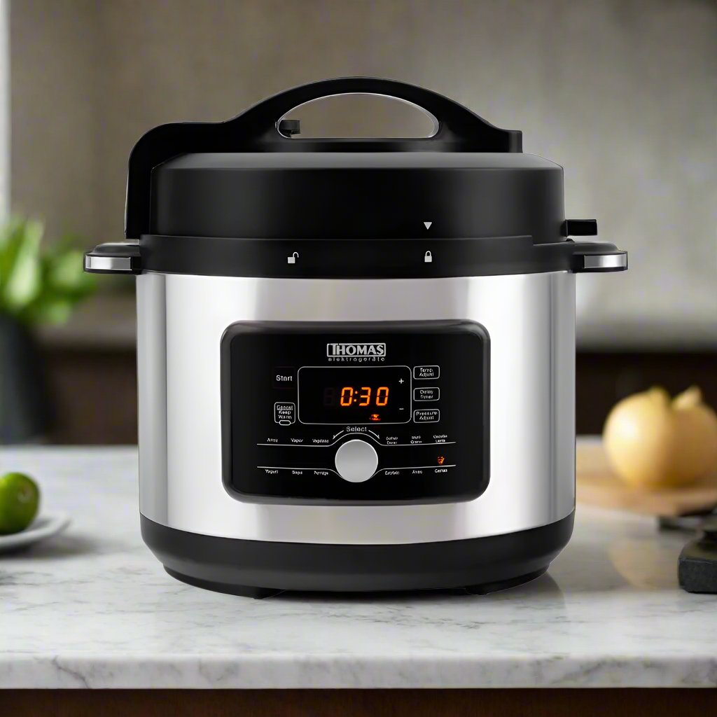 Nuestra olla a presión eléctrica TH-40PC no es necesario pasar horas en la cocina, ni ser experto para comer sano y rico todos los días. Gracias a sus múltiples funciones te permite programar desde el tiempo de inicio hasta mantener tus comidas calientes hasta por 4 horas. Capacidad de 5.0 litros y cuerpo de acero. Las medidas del producto embalado serian 34,5X34,5X35 CM con un peso de 6,3 KG.
