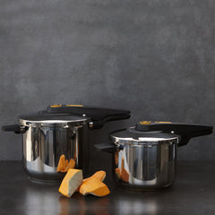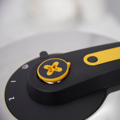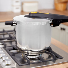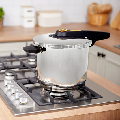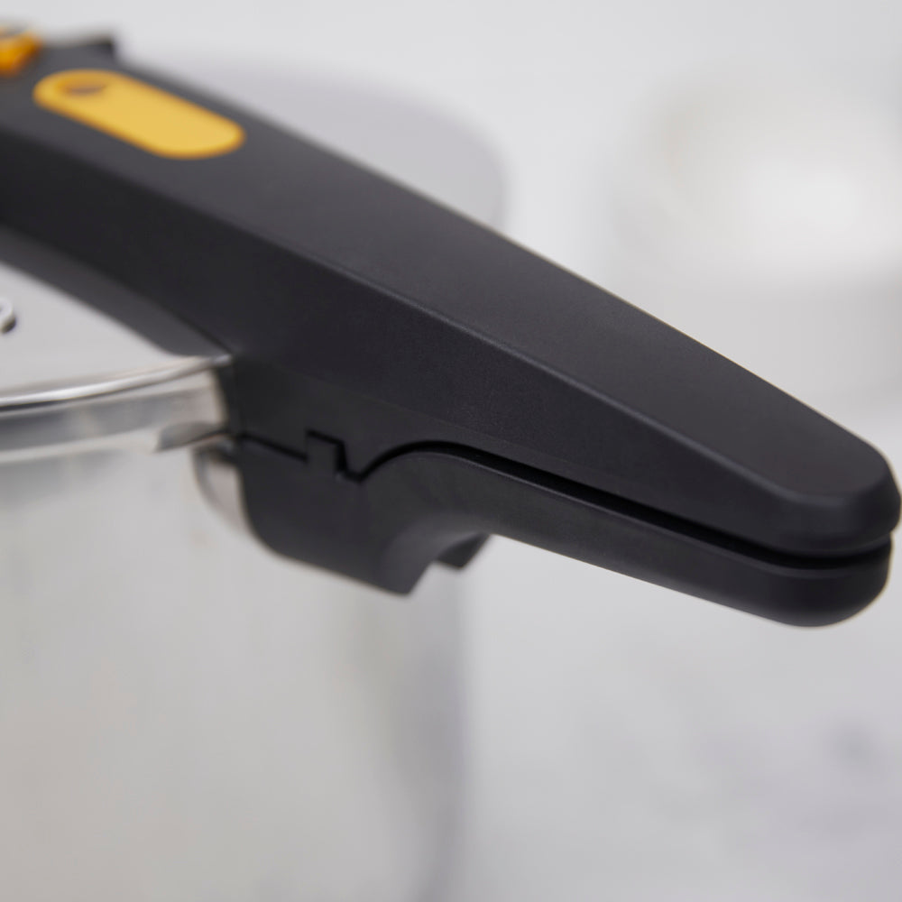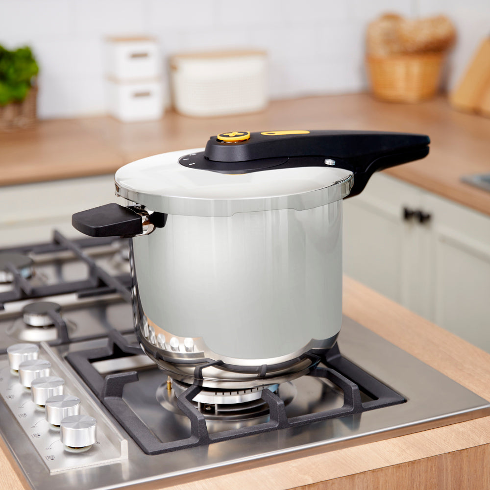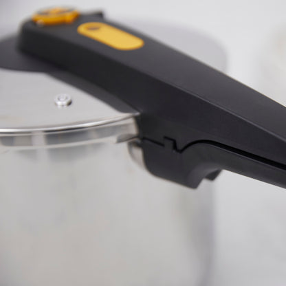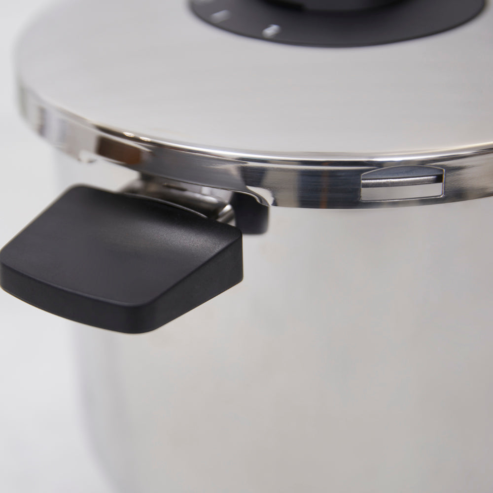 La olla a presión Marsella 9 litros de SimpleCook tiene un cuerpo y tapa fabricados de acero inoxidable. Cuenta con un triple mecanismo de seguridad que evita el exceso de presión acumulada, además de un regulador de vapor en 3 niveles y sus mangas son elaboradas de bakelita (plástico ultra resistente a altas temperaturas). Su pinza hace la presión en el centro de la tapa, su base cuenta con tecnología impact bounding, que logra una distribución de calor más homogénea. En cuanto a seguridad, incluye una válvula de autobloqueo que no permite abrir la tapa hasta que se libere la presión total.