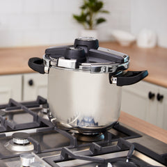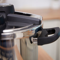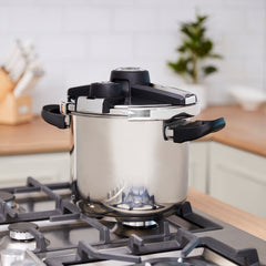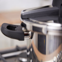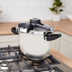 La olla a presión Toulouse de SimpleCook es uno de nuestros mejores modelos, cuenta con 7 litros de capacidad, tiene un cuerpo y tapa fabricados de acero inoxidable. Cuenta con un triple mecanismo de seguridad que evita el exceso de presión acumulada, un regulador de vapor en 3 niveles y sus mangas son elaboradas de bakelita (plástico ultra resistente a altas temperaturas). Su base cuenta con tecnología impact bounding, que logra una distribución de calor más homogénea. En cuanto a seguridad, incluye un mecanismo de doble pinza con cierre automático y válvula de trabajo por gravedad (ajustes de baja y alta presión) lo que la hace más duradera y segura.