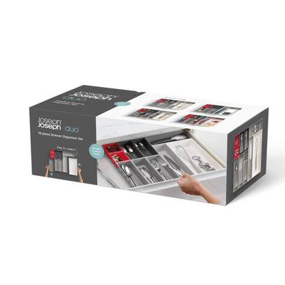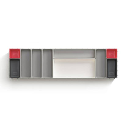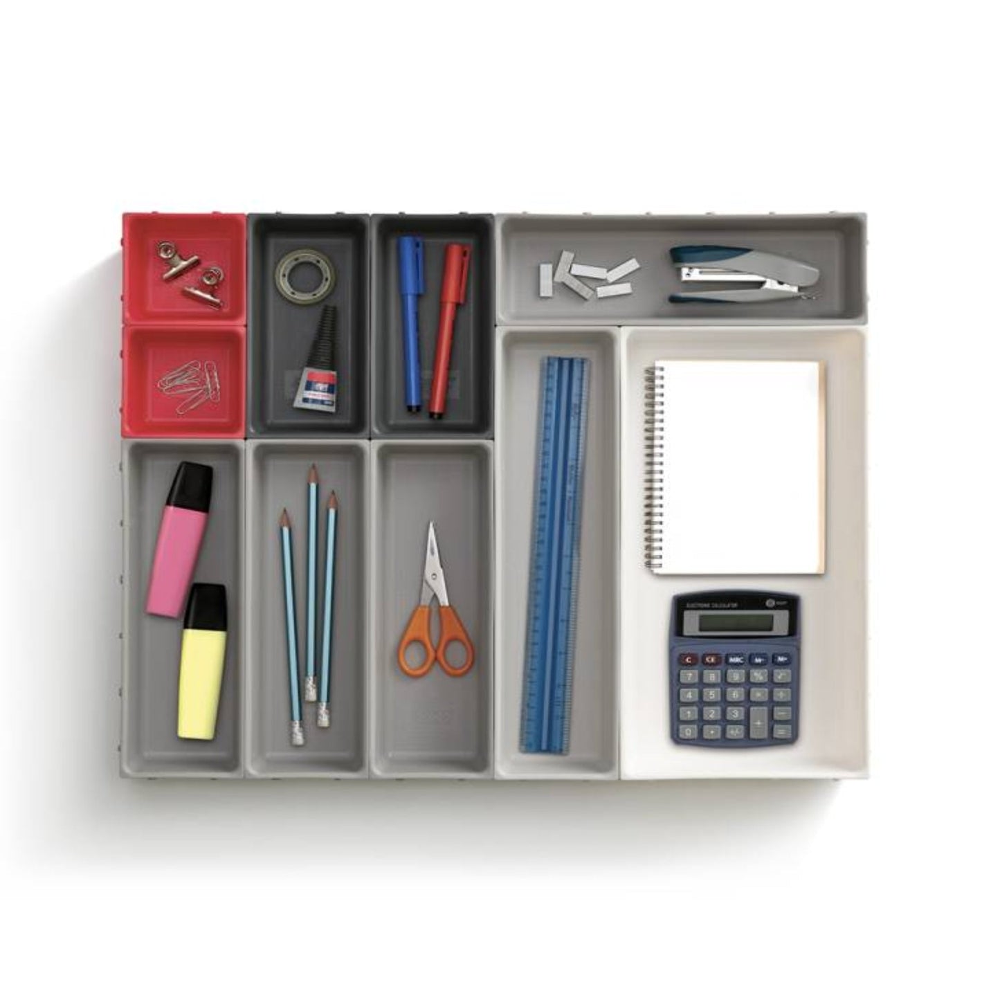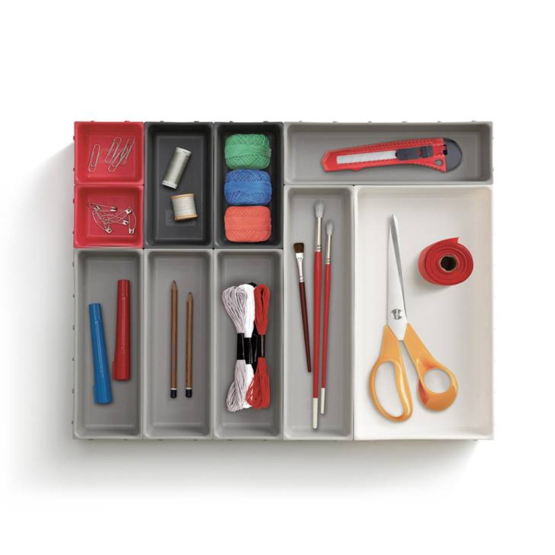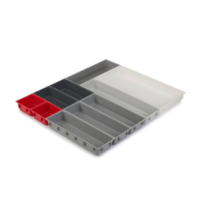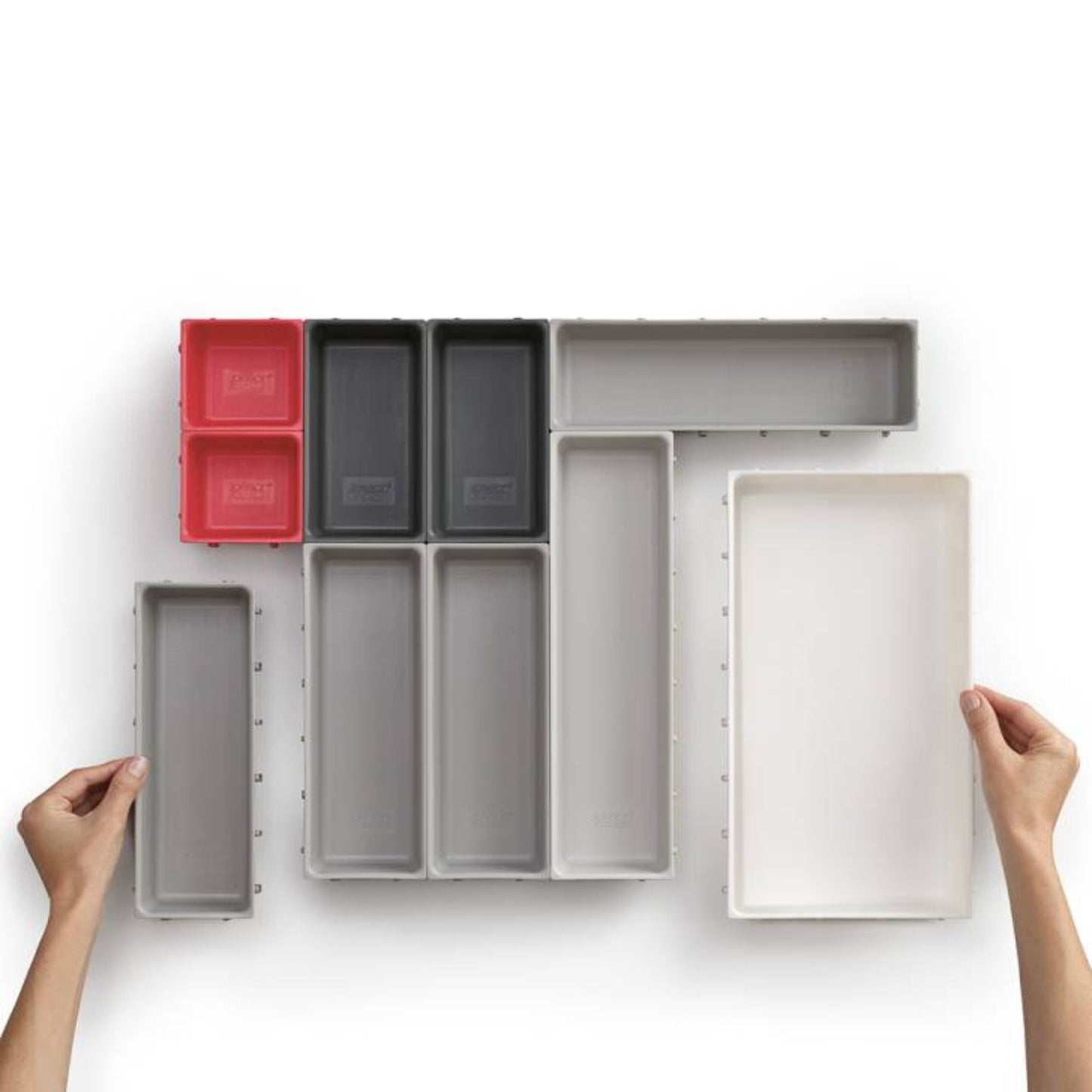 El Set Organizador Cajones Blox 10 Piezas Joseph Joseph incluye 10 bandejas que se enganchan entre si para que puedas usarlas juntas o por separado, adaptándose al tamaño de tus cajones. Este sistema modular te permite diferentes combinaciones dependiendo de tus necesidades. Son perfectas para guardar utensilios de cocina, cubiertos, maquillaje, joyas y artículos de escritorio separando cada elemento en una bandeja distinta. Todas tienen pies antideslizantes para evitar que se muevan dentro del cajón. Incluye 10 bandejas: 2 de 8,5x8,5cm, 2 de 8,5x17,5cm, 4 de 8,5x26cm, 1 de 8,5x34,5cm, 1 de 17,5x34,5cm